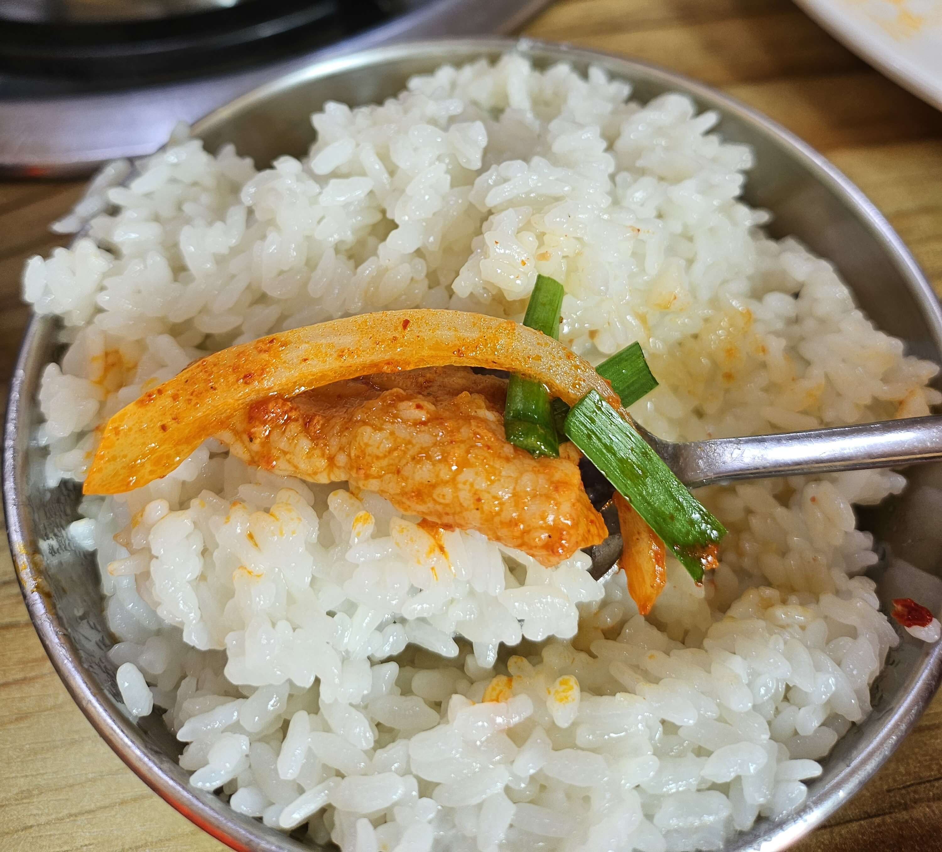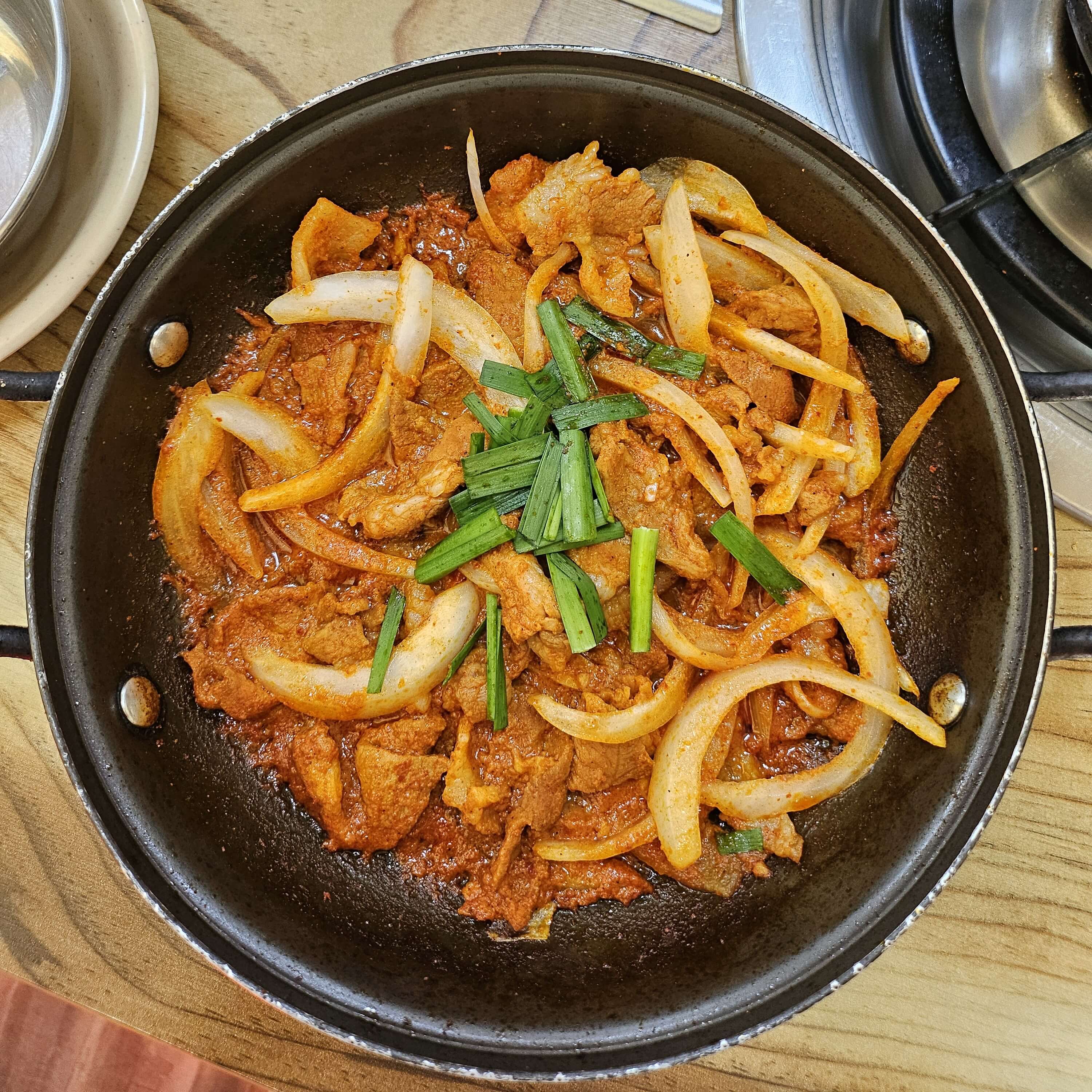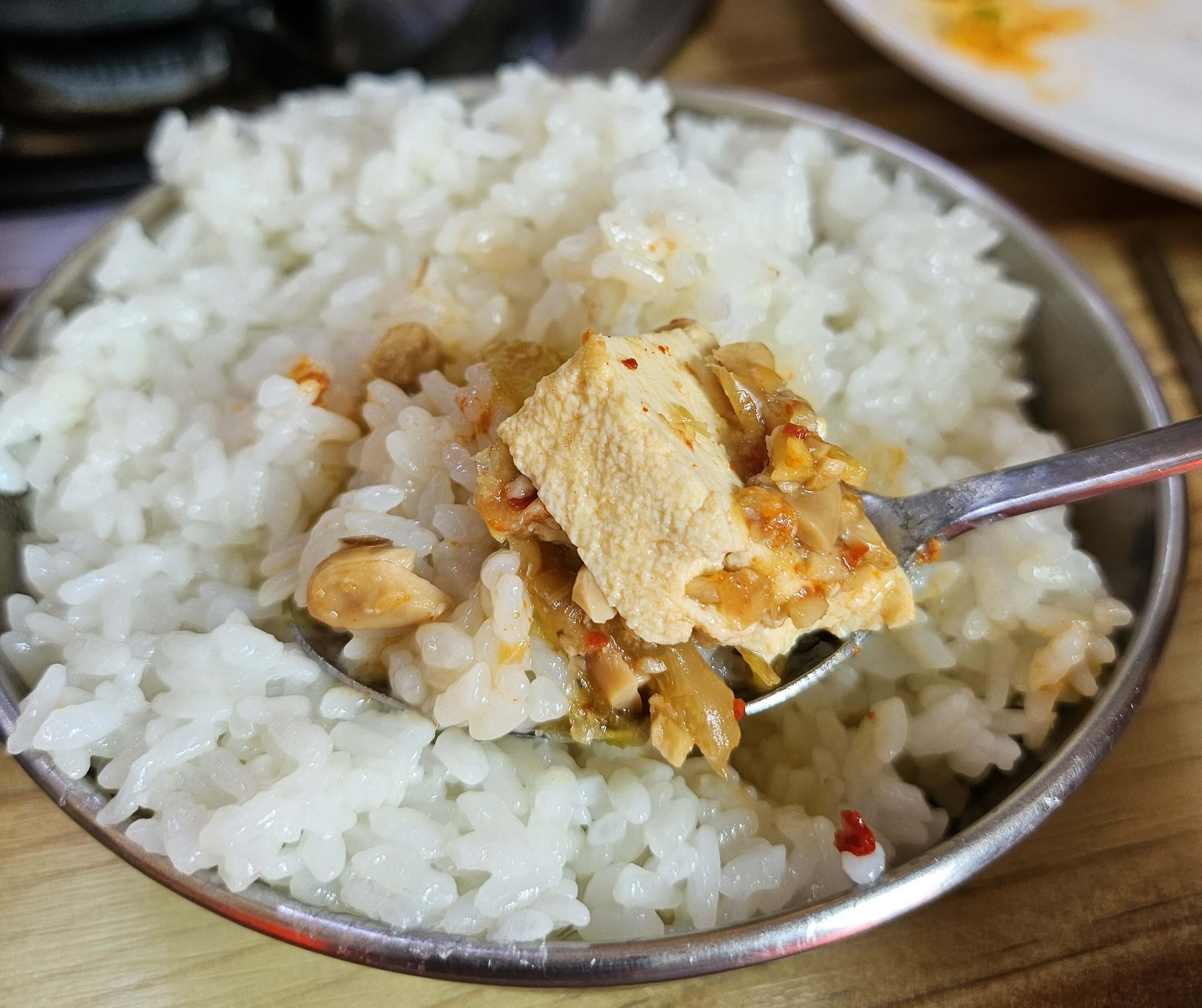 청국장이랑 같은 냄비에 나온 제육볶음입니다. 맵지 않고 설탕의 단맛이 아닌 양파가 듬뿍 들어가서 양파의 단맛과 조미료맛은 아니지만 자극적인 맛 때문에 밥에 계속 손이 가는 제육볶음이었습니다. 청국장과 제육 조합이 정말 좋았습니다. 약간 아쉬운 거는 제육볶음 주문할 때 상추나 깻잎 같은 쌈채소가 안 나온 게 약간 아쉬웠습니다.