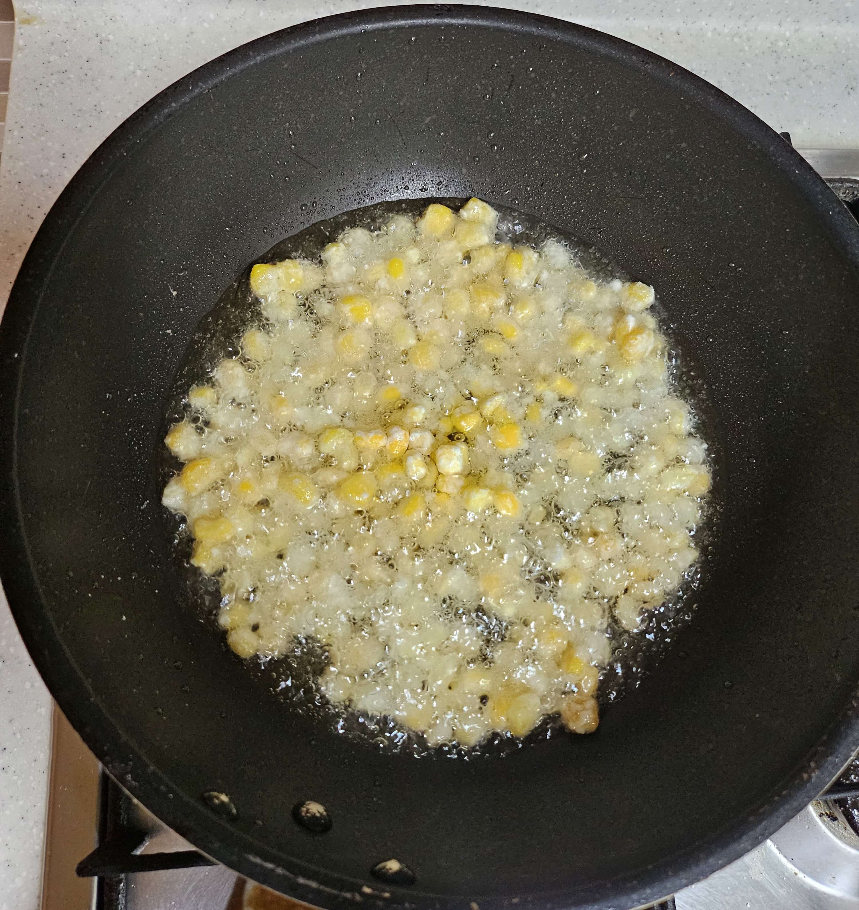 팬에 기름을 넉넉히 둘러주고 중불에서 열을 충분히 올려줍니다. 어느 정도 기름에 열이 오르는 것 같으면 옥수수 몇알을 넣어봅니다. 튀겨지는 맛있는 소리가 나면서 옥수수알이 떠오르면 기름에 옥수수알을 적당량을 넣고 튀겨줍니다. 너무 많이 넣으면 잘 안 튀겨지기 때문에 조금씩 나눠서 튀겨주시는 게 좋습니다. 전분 때문에 옥수수알이 붙을 수 있기 때문에 수저로 저어가며 튀겨줍니다. 색이 어느 정도 변하기 시작하면 체에 밭쳐 기름을 빼줍니다.