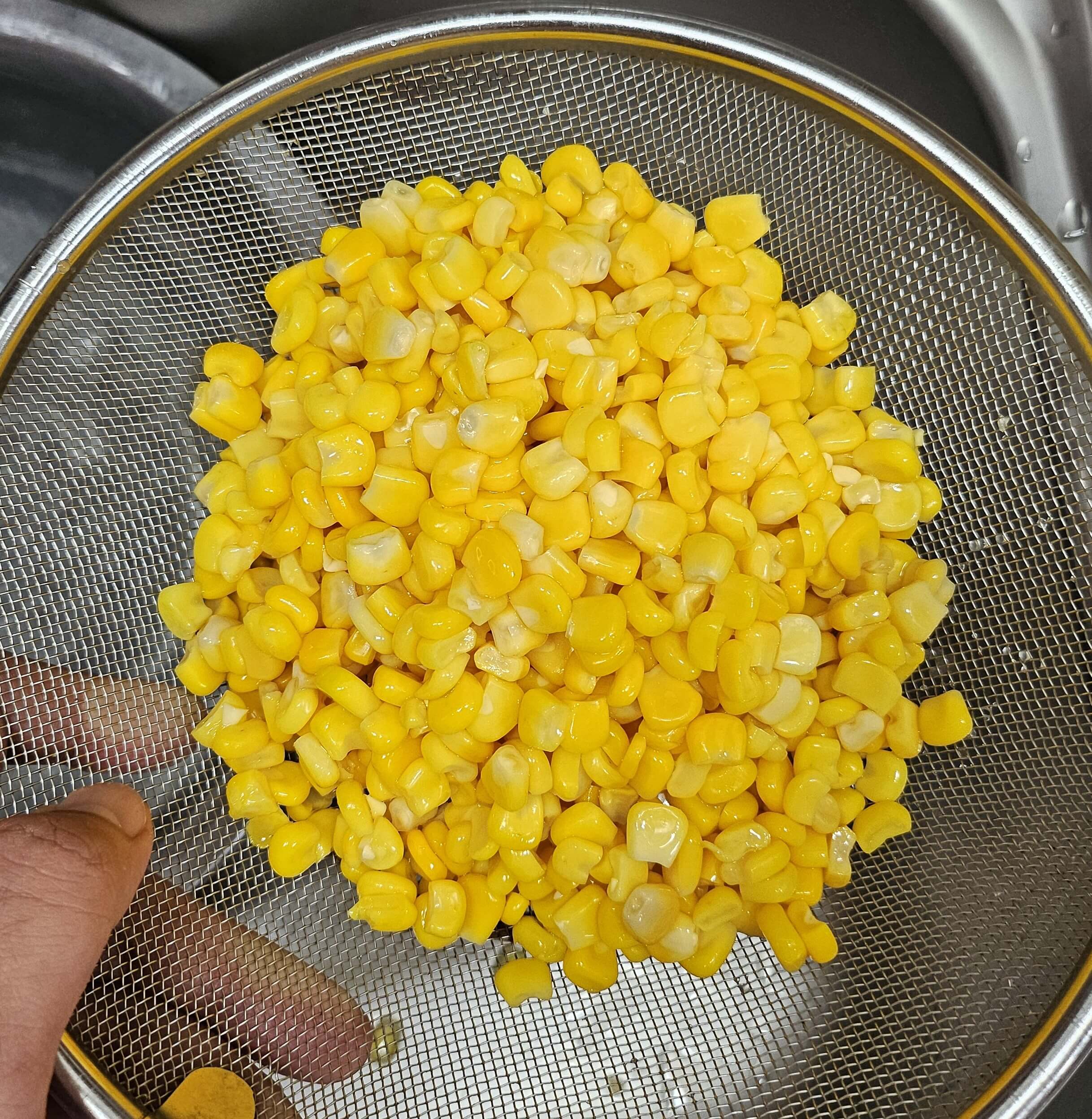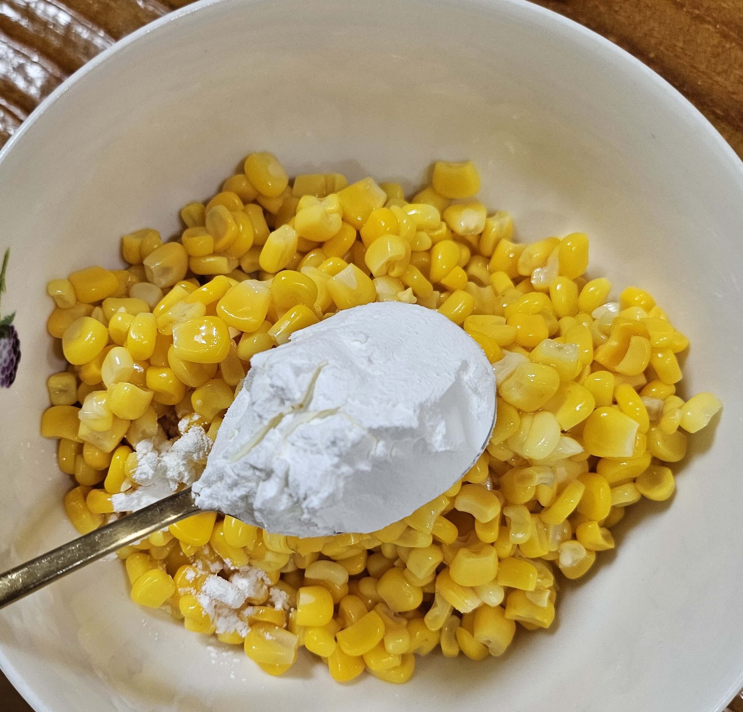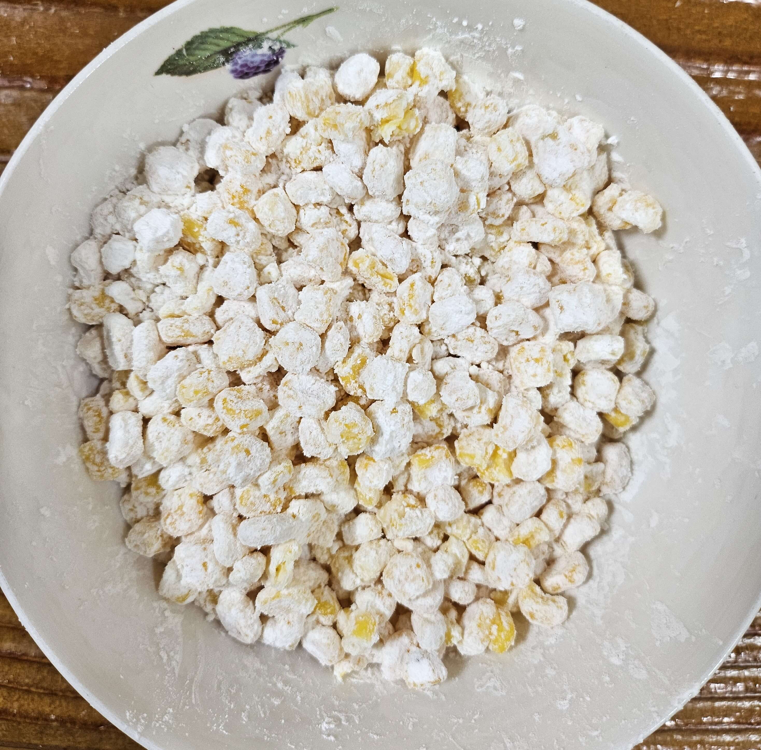 통조림 옥수수는 체에 밭쳐 물기를 빼줍니다. 다른 레시피들을 보면 냅킨으로 옥수수콘의 물기를 닦아주는데 저는 굳이 그렇게 까지는 안하고 체에 밭쳐 충분히 물기를 빼줬습니다. 그래도 튀김이기 때문에 어느 정도 최대한 수분을 제거해야 합니다. 그후 전분가루 3큰술 정도 넣고 전분이 옥수수 전체를 코팅한다는 느낌으로 수저로 골고루 섞어주시면 됩니다. 따로 간을 하지 않아도 나중에 설탕이랑 소금으로 맛을 더하면 되니깐 처음엔 간을 안 하셔도 됩니다. 전분가루가 옥수수에 전체적으로 잘 코팅되었으면 바로 튀겨주시면 됩니다.