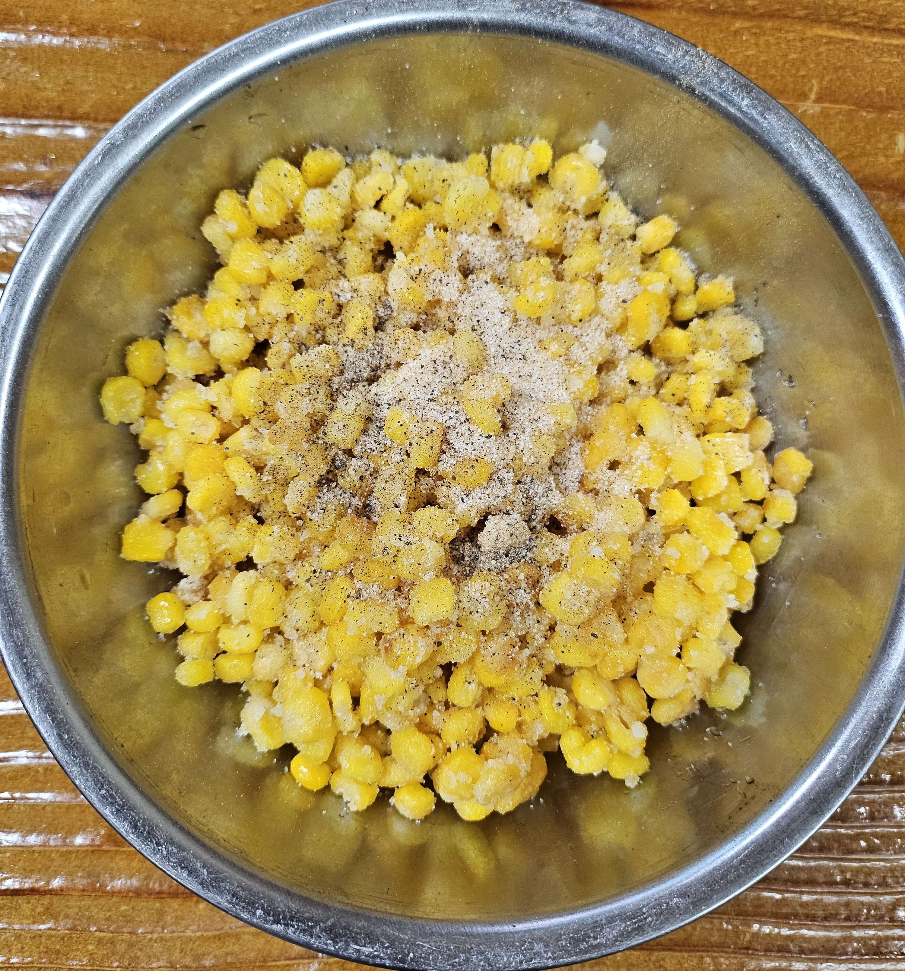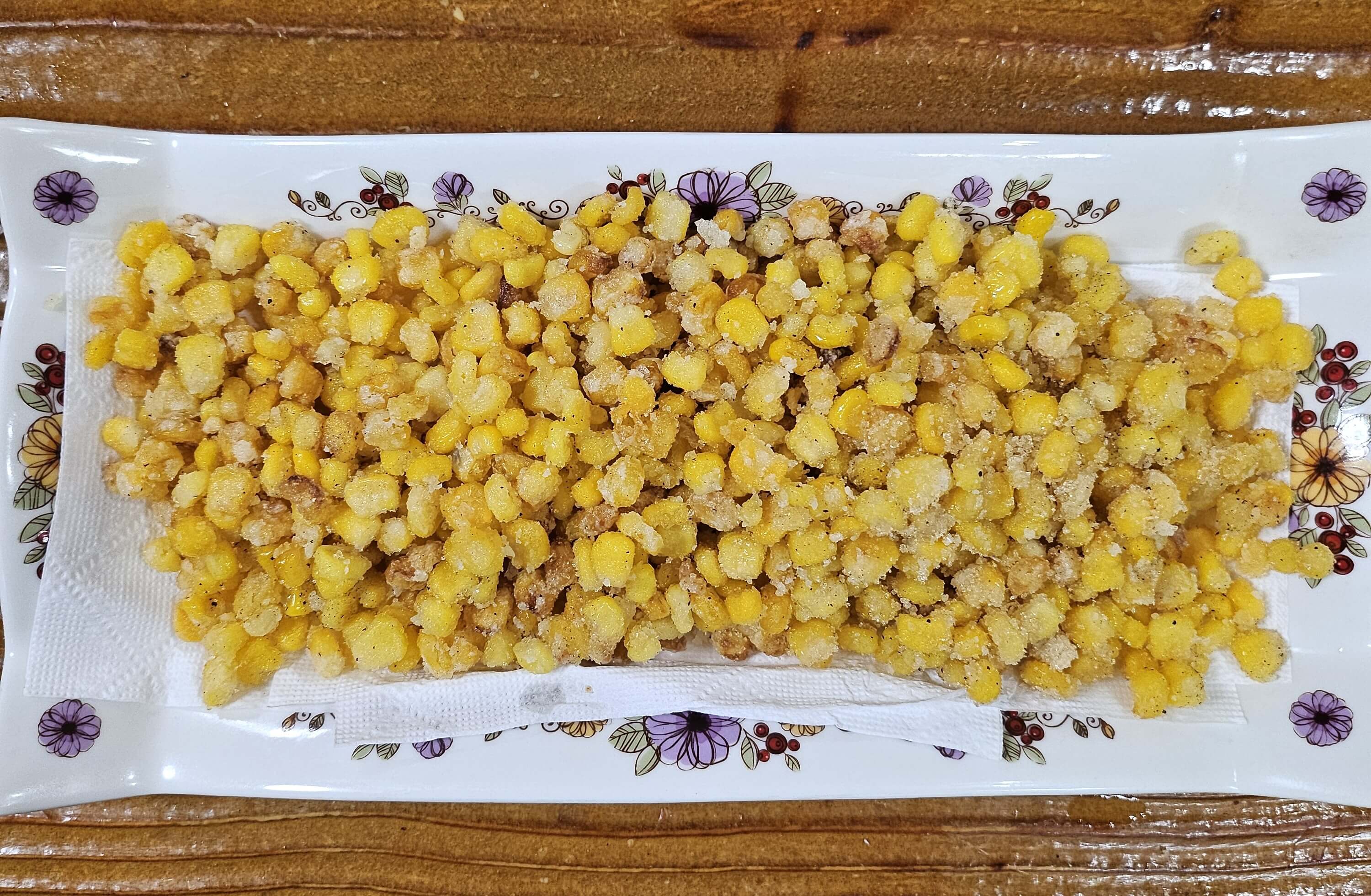 잘 튀겨진 옥수수튀김은 키친타월로 기름을 잘 제거하고 식혀줍니다. 그리고 볼에 옥수수튀김을 담아주고 소금 1큰술, 설탕 2큰술, 후추 적당량을 뿌려주고 잘 섞어줍니다.
