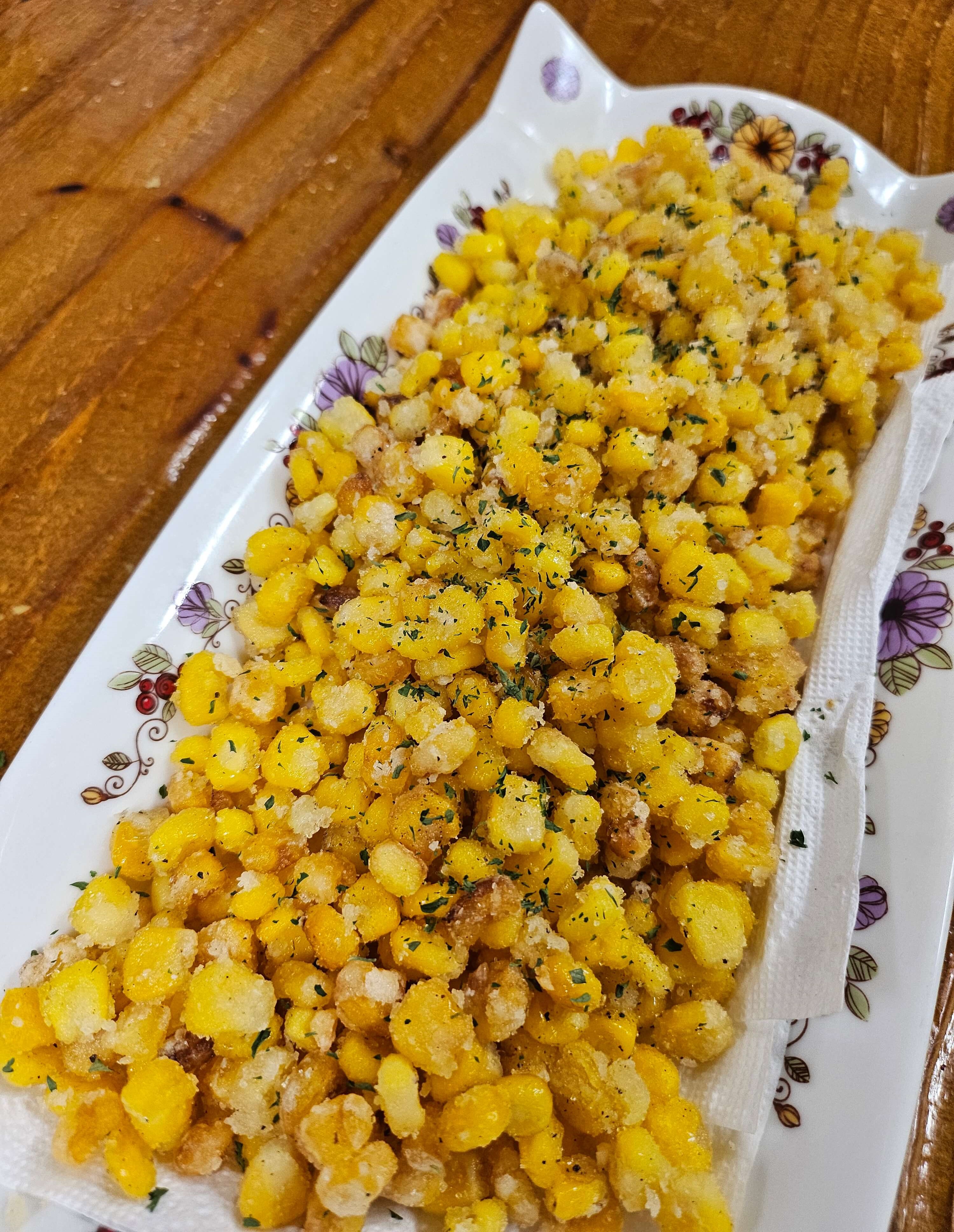 양념이 잘 뭍혀진 옥수수튀김을 그릇에 담아주고 마무리로 취향껏 파슬리 가루를 뿌려줍니다.
