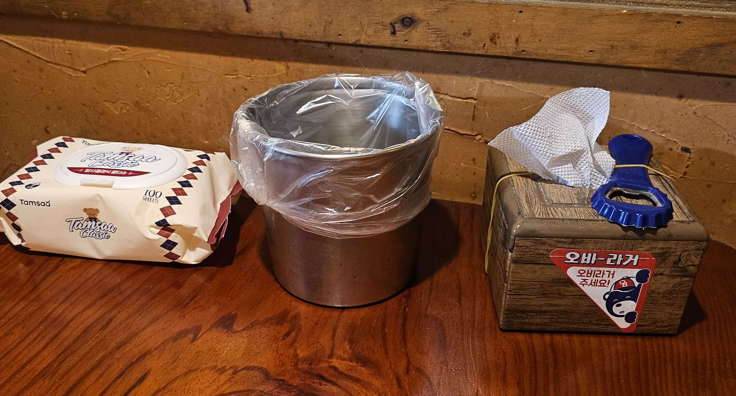 자리에는 물티슈, 뼈통, 냅킨통, 병따개가 배치되어 있었습니다. 물티슈부터 뭔가 정감이 갔습니다. 굽모닝숯불바베큐는 오랫동안 운영된 걸로 알고 있는데 인테리어, 자리 배치부터 뭔가 노포 느낌이었습니다.