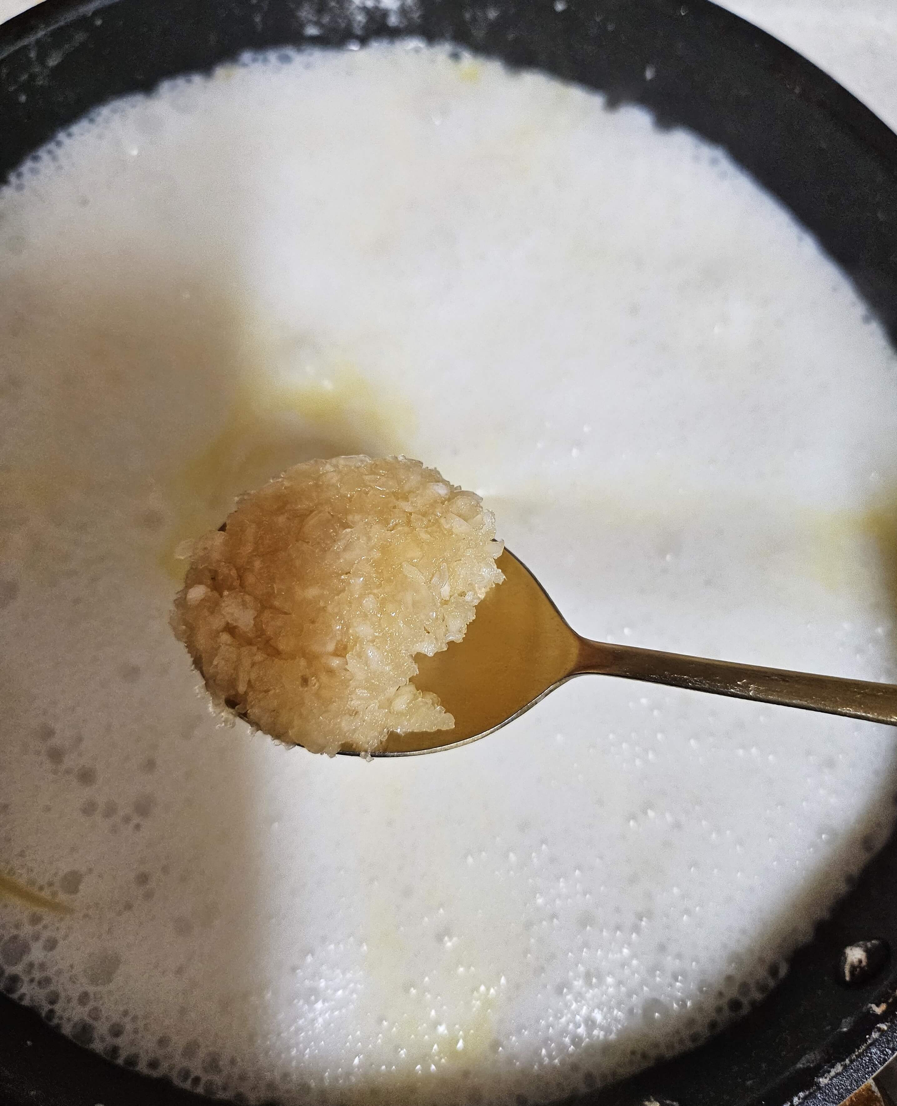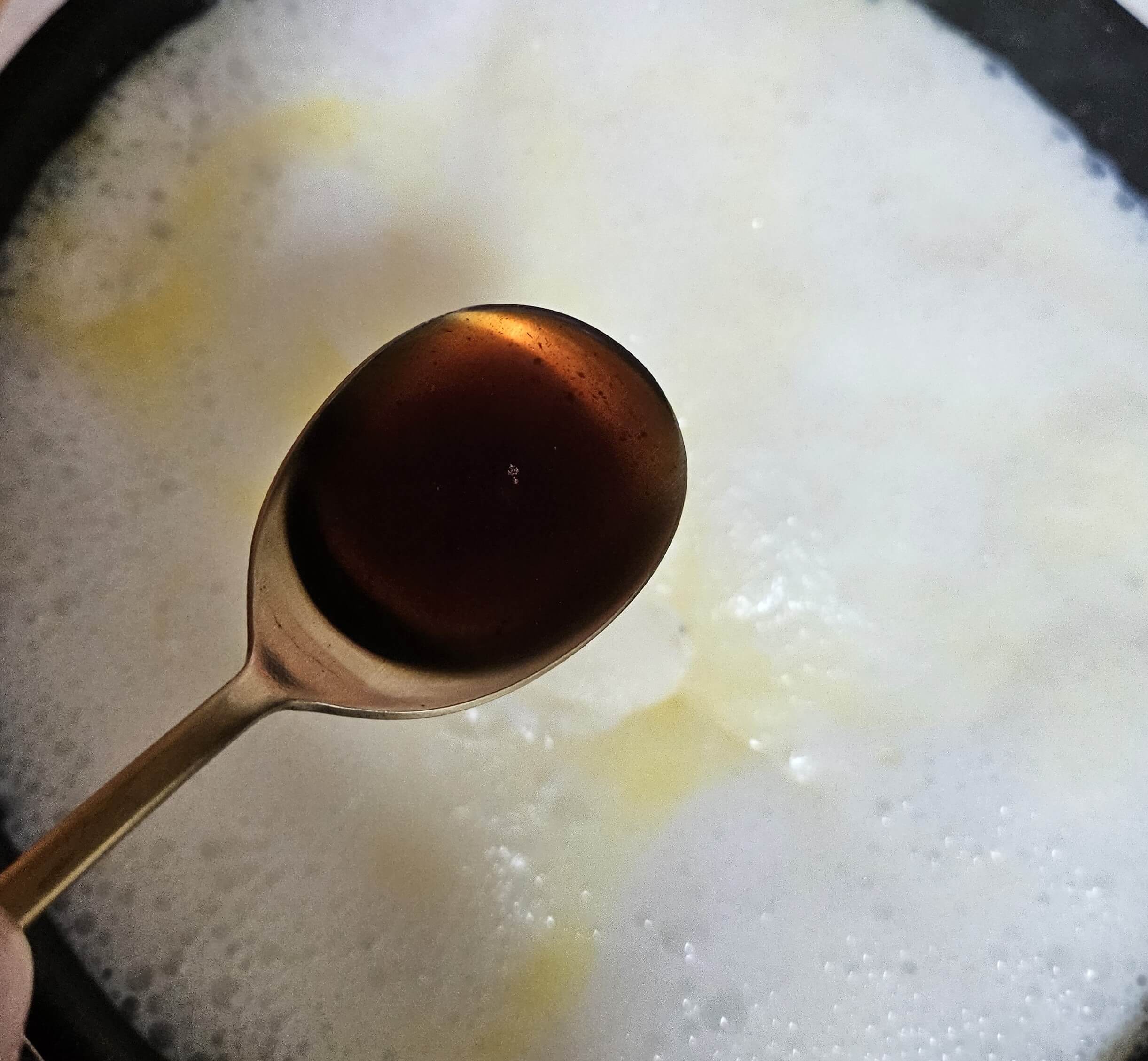 면이 80% 정도 익기 시작하면 멸치 액젓 1큰술을 넣어주고 부족한 간은 소금을 넣어서 간을 맞춰줍니다. 그 후 다진 마늘 한 큰술을 넣고 잘 섞어줍니다. 참고로 뚜껑은 덮지 않고 강불로 우유를 졸여주시면 됩니다. 우유가 끓어서 넘치지 않도록 수시로 확인도 해줍니다. 집집마다 화력이 달라서 면 익는 속도가 다 다르겠지만 10~12분 정도면 면이 다 익습니다.