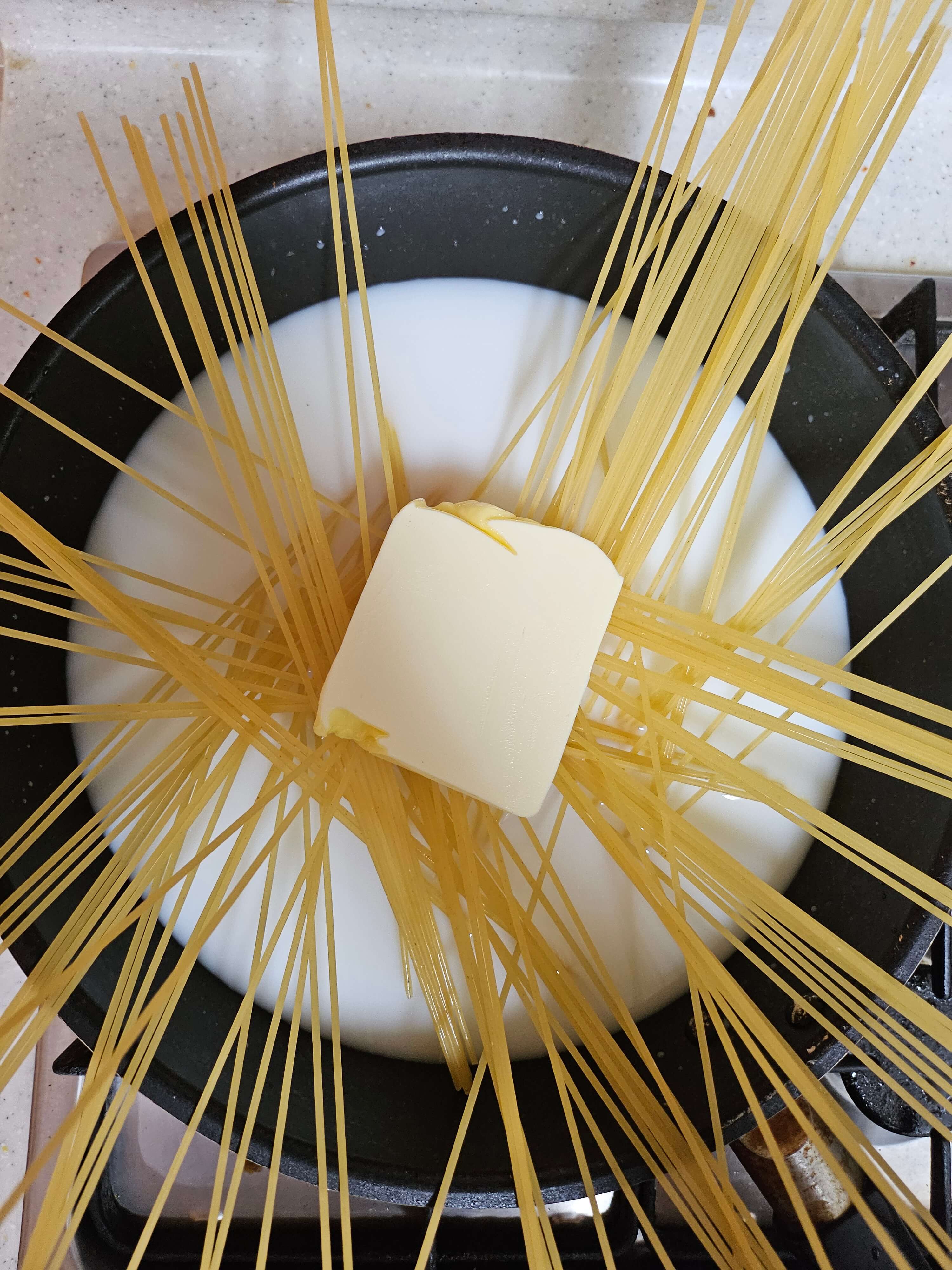저는 집에 있는 팬이 너무 작아서 파스타 면이 탔지만 여러분들은 최대한 커다랗고 높은 팬 면이 다 담길정도의 크기의 팬을 사용하시면 더욱 편하게 요리를 할 수 있습니다. 팬에 물 500ml, 우유 300ml를 넣고 파스타면 1인분, 버터 40g을 넣고 같이 끓여줍니다. 이때 불은 강불로 하시고 10분 정도 끓여주시면 됩니다. 만약에 무염버터를 사용하신다고 한다면 나중에 간을 보고 소금을 더 추가해서 넣어주시면 됩니다.