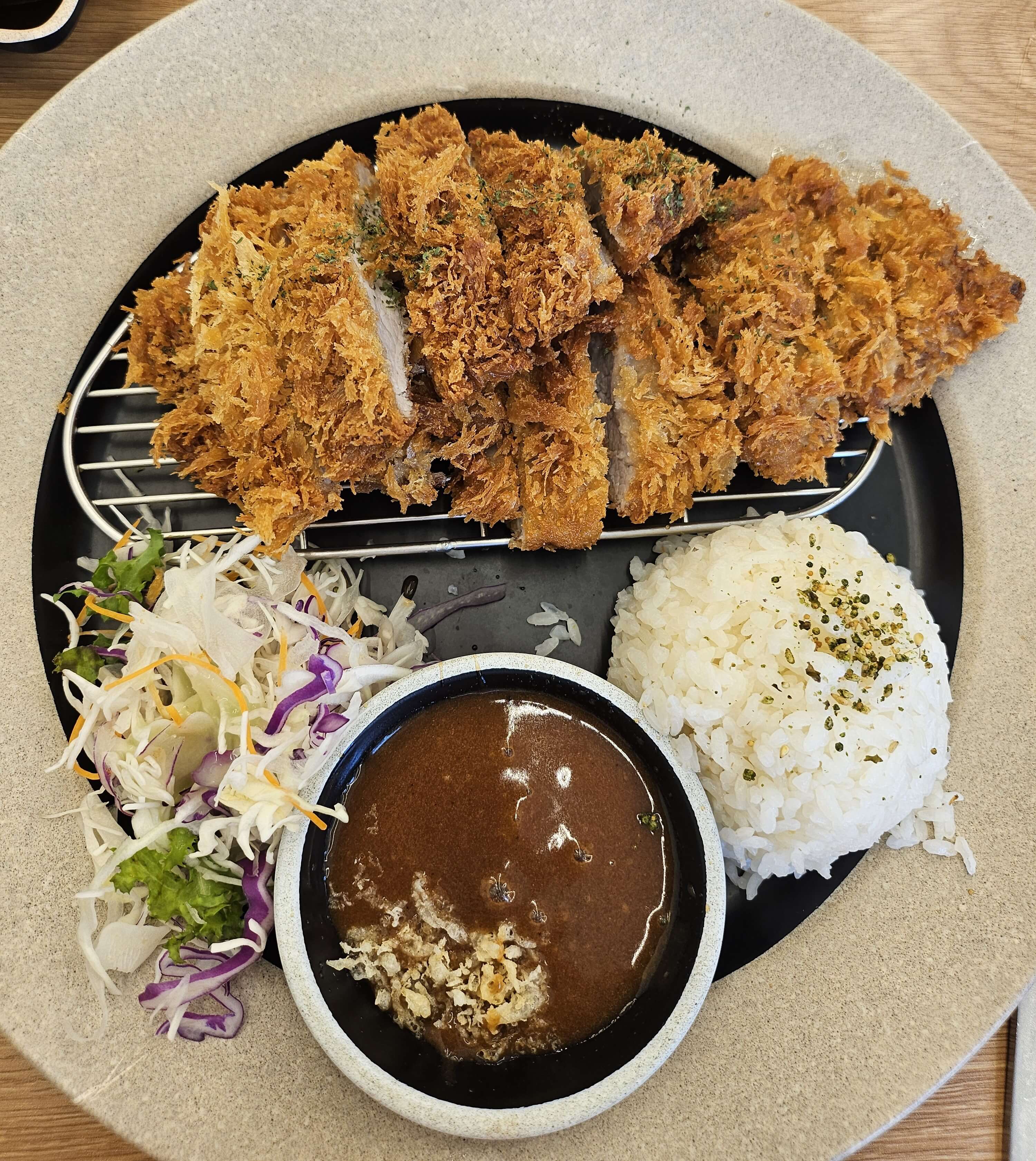 다른 테이블 손님이 주문한 걸 봤는데 너무 먹음직스럽게 보여서 저도 추가로 주문한 수제 히레카츠입니다. 그리고 전에 글에서 소개한 음식을 주문하고 나면 먼저 나온 밑반찬 샐러드와는 다른 샐러드드레싱이었습니다. 돈카츠를 주문할 때 나오는 샐러드드레싱은 키위소스 드레싱이었습니다. 웬만한 일식 돈카츠 전문점 돈카츠와 비교를 해도 떨어지지 않는 퀄리티였습니다. 양도 점심으로 먹기에 딱 좋은 양이었습니다. 특히 저는 돈카츠 소스에 튀김가루가 뿌려져 있는 게 김승현스시가 더 매력적이게 느껴졌습니다.