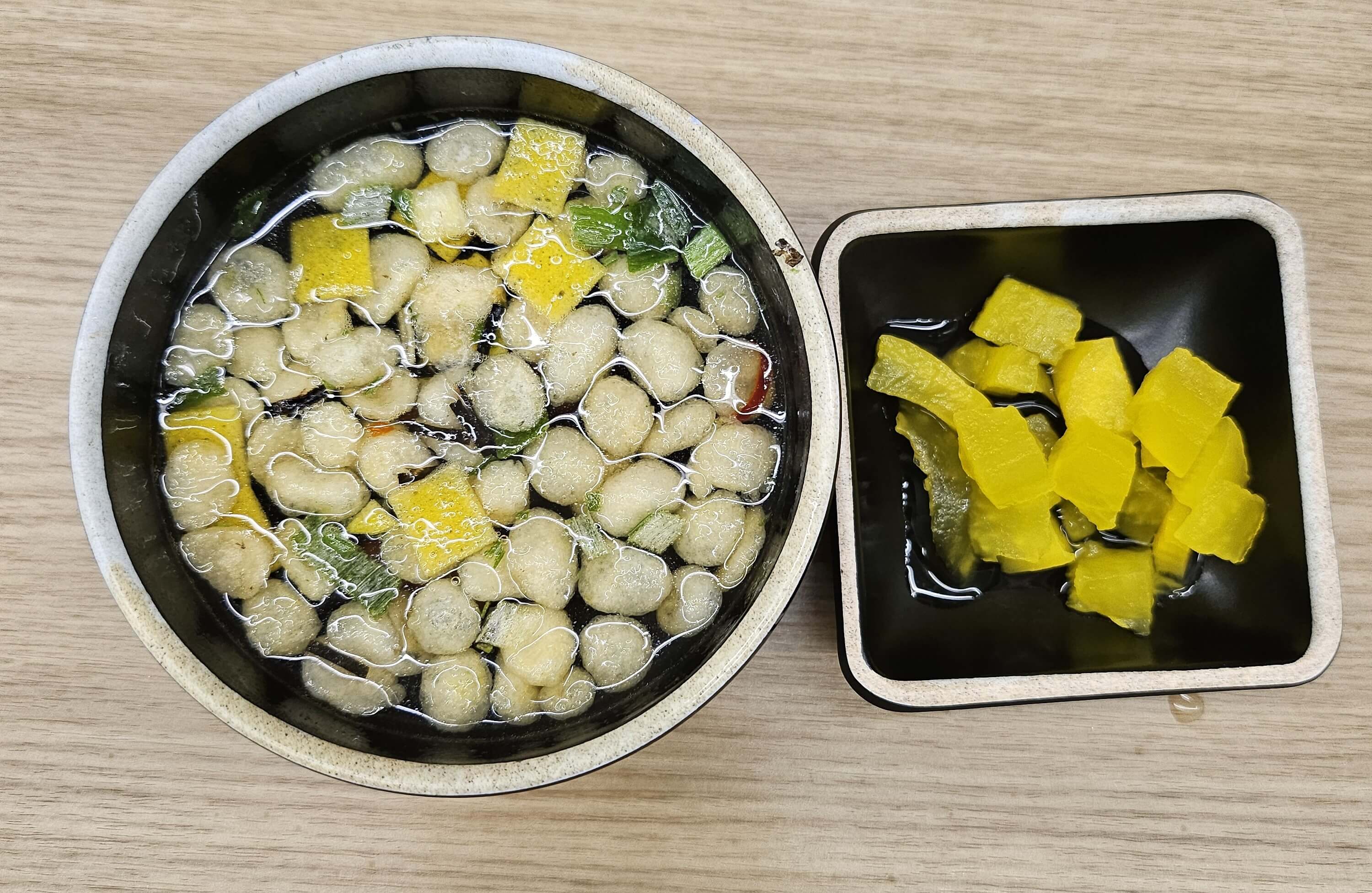 셀프코너에는 국이랑, 단무지, 물컵이 준비되어 있었습니다.