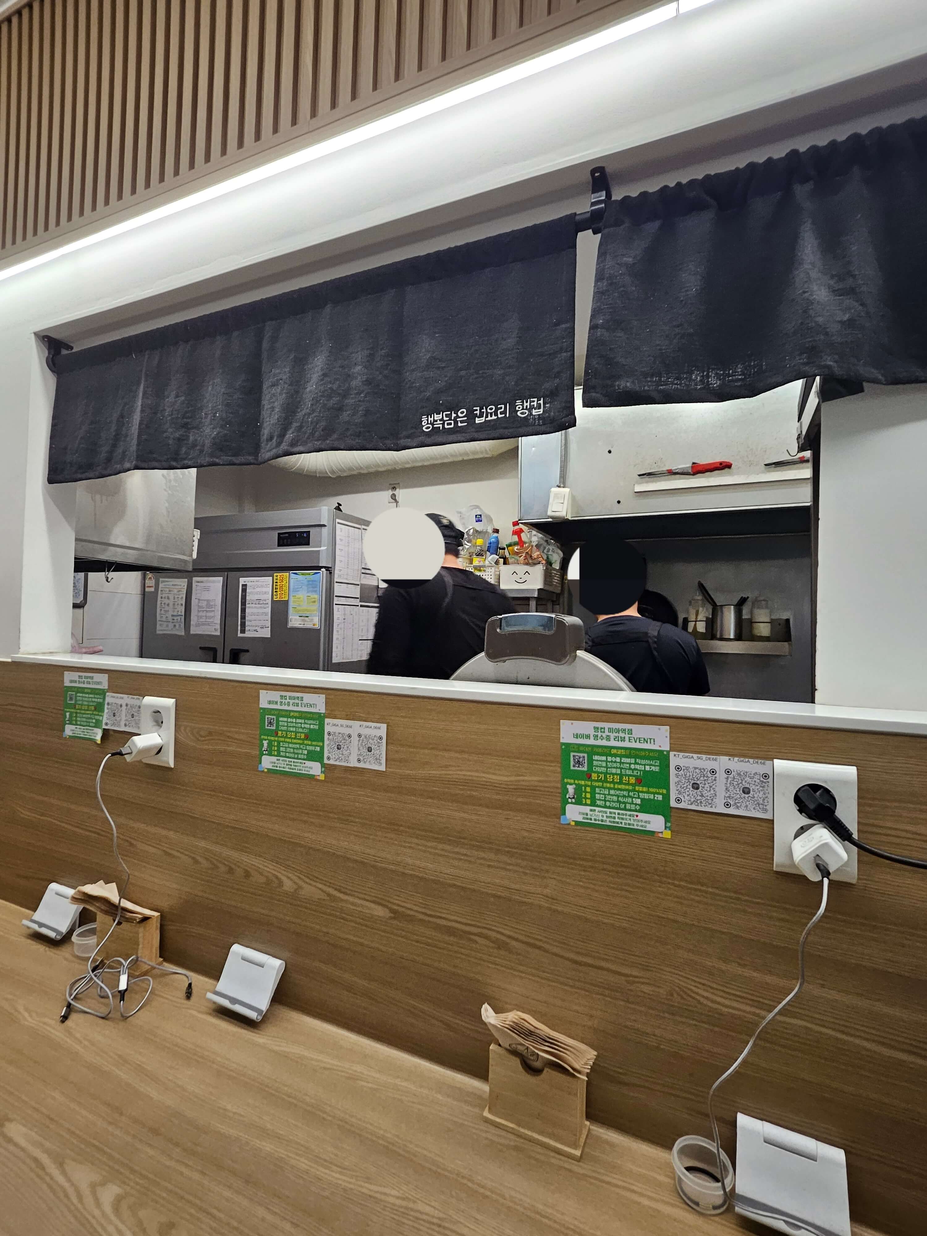 매장 내 식사 가능한 테이블은 이렇게 바형식으로 된 자리 밖에 없었습니다. 좌석도 깔끔하고 저처럼 혼밥 하는 손님들도 많았습니다. 그리고 행컵 미아역점은 네이버 영수증리뷰도 하고 있었습니다.