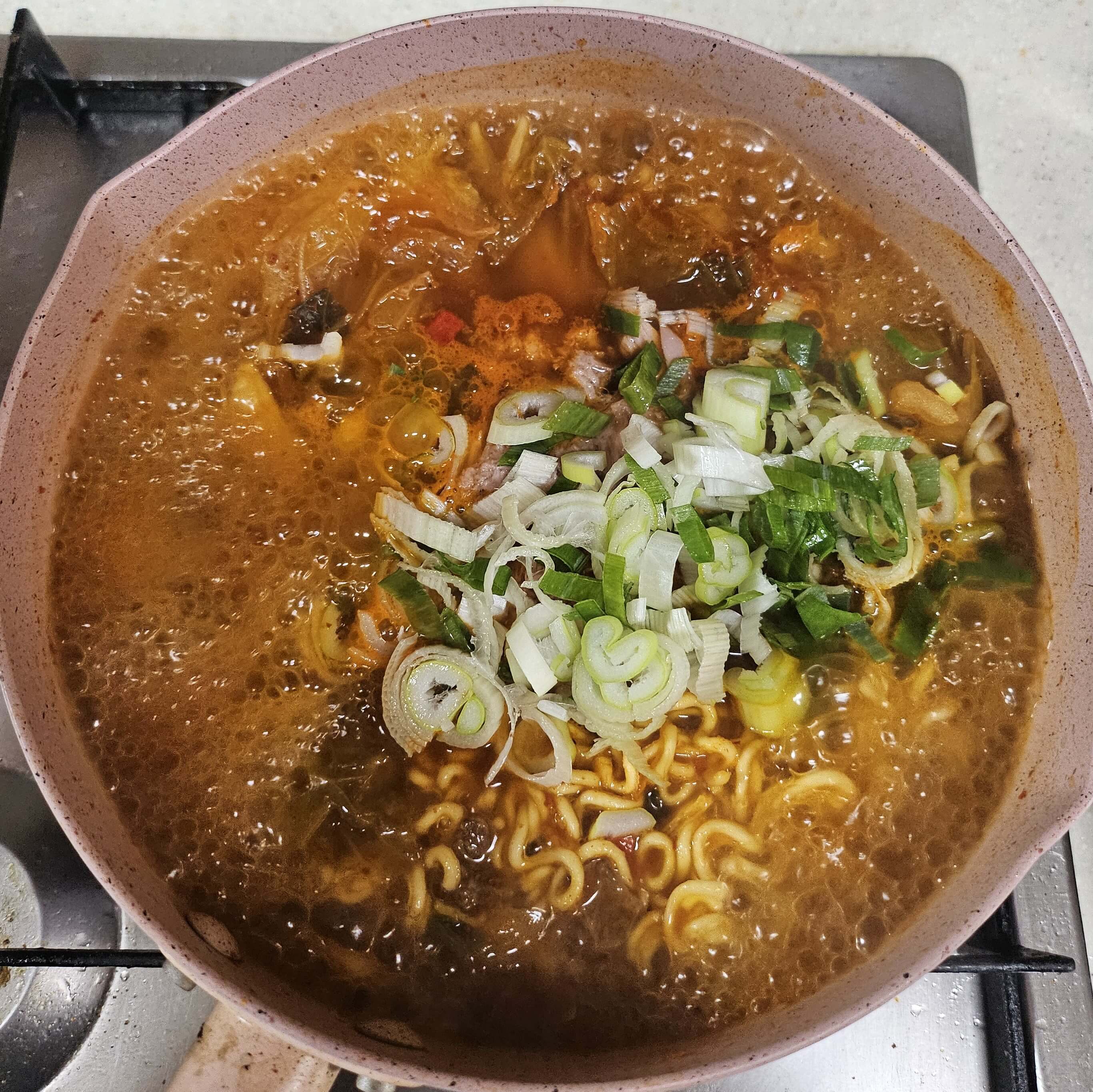 면이 풀어지면 아까 손질해 둔 대파를 넣고 끓여줍니다. 저는 라면을 먹을 때 퍼진면을 좋아서 좀 더 끓여줬습니다. 마지막으로 참기름을 1큰술 넣어주셔도 좋지만 참기름을 넣으면 매운맛이 사라질까 봐 따로 안 넣어줬습니다.