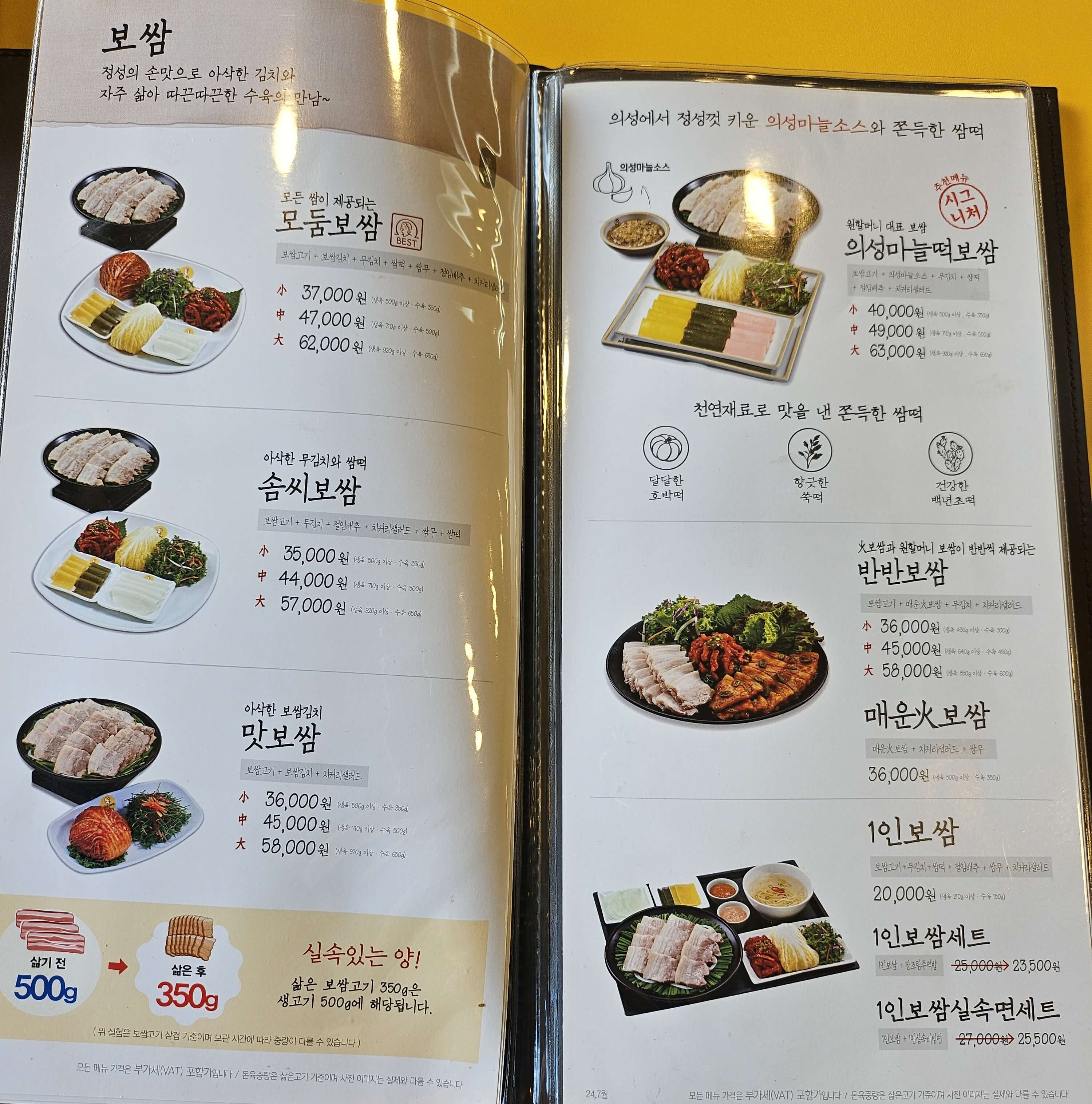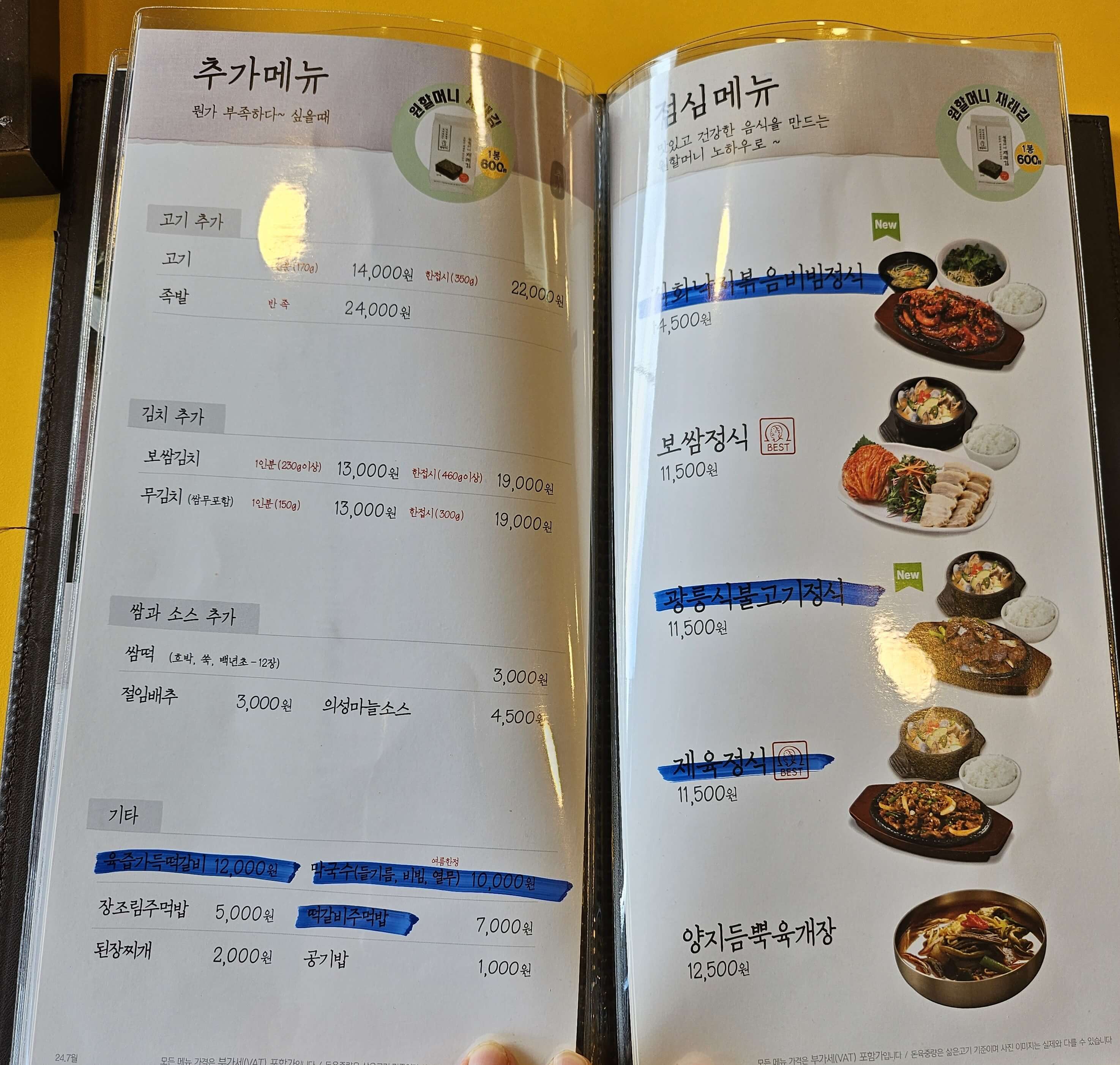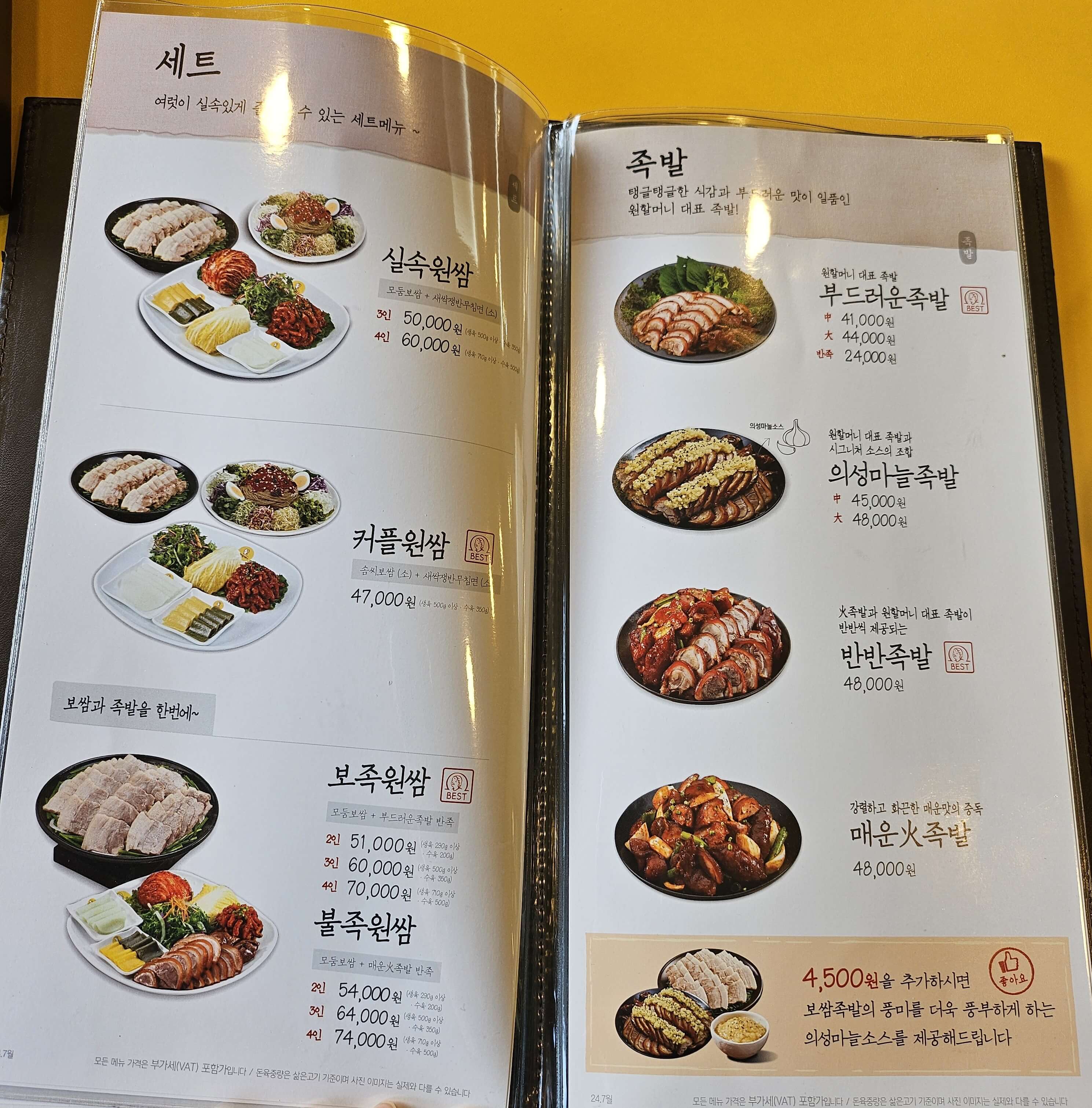 원할머니보쌈 메뉴판입니다. 저희는 실속원쌈(3인): 50,000원 , 공깃밥:1,000원을 주문했습니다. 몰랐는데 원할머니 보쌈은 현재 부대찌개도 판매를 하고 있었습니다. 저희가 식사 중에 온 손님은 부대찌개를 주문하셨습니다.