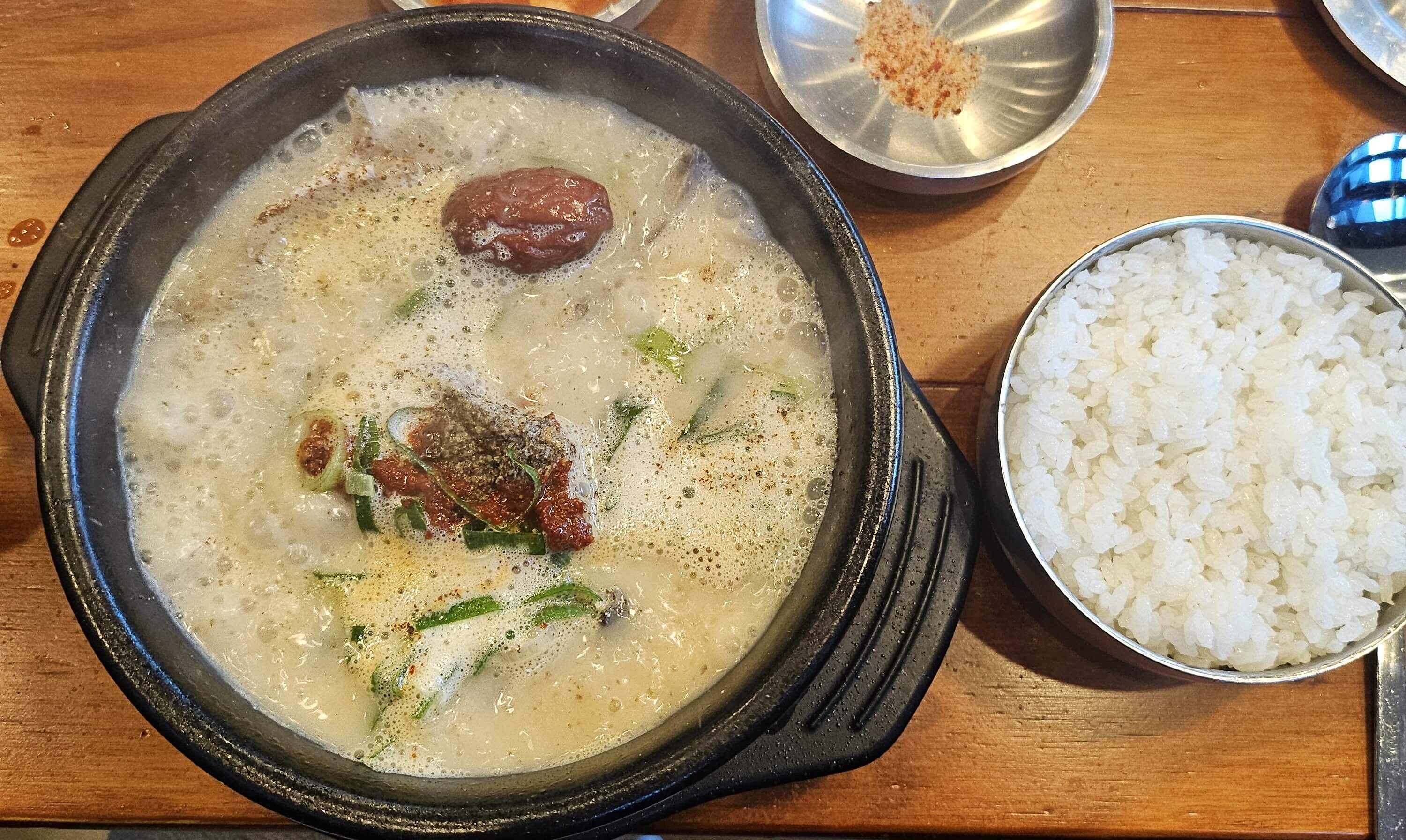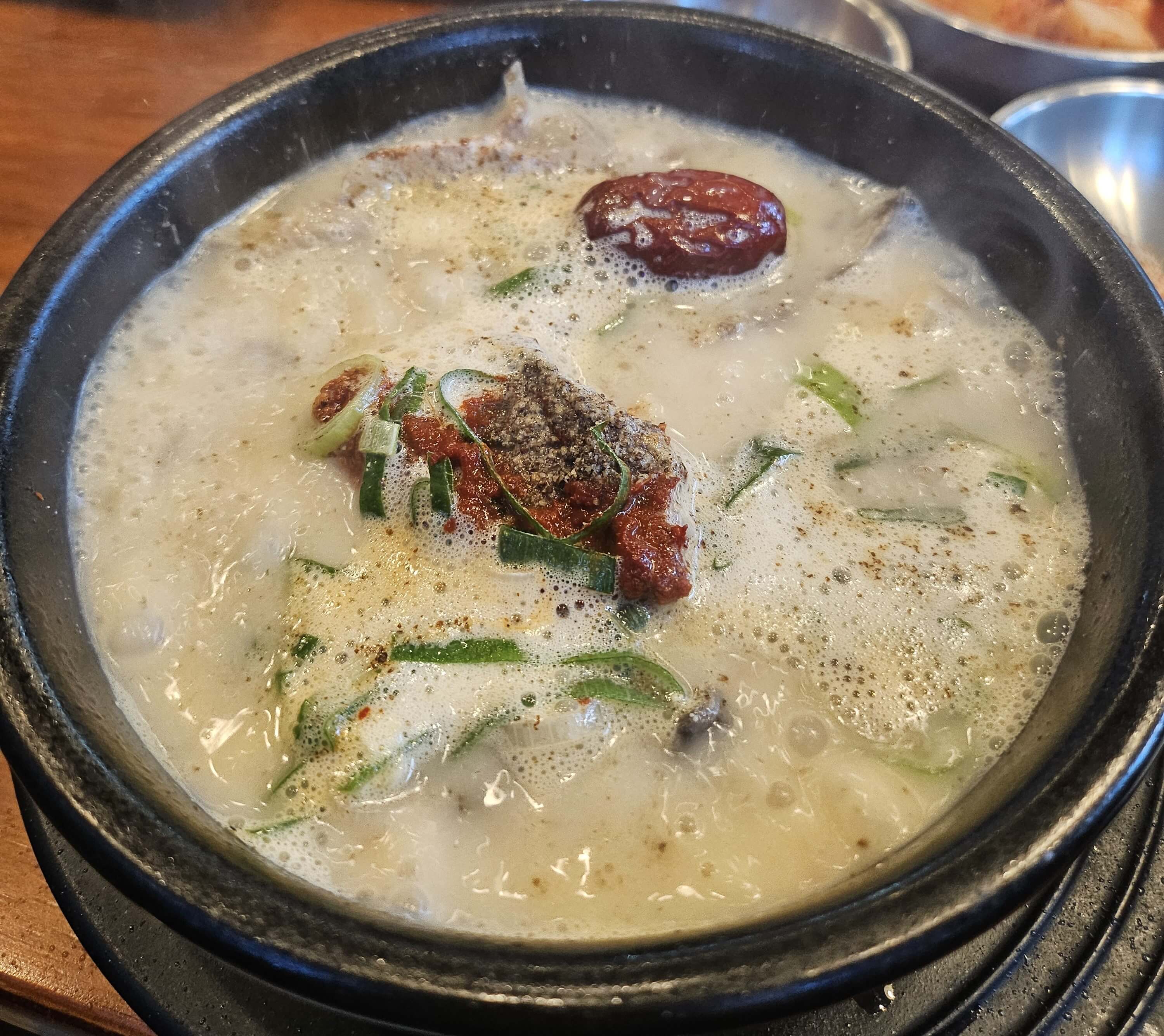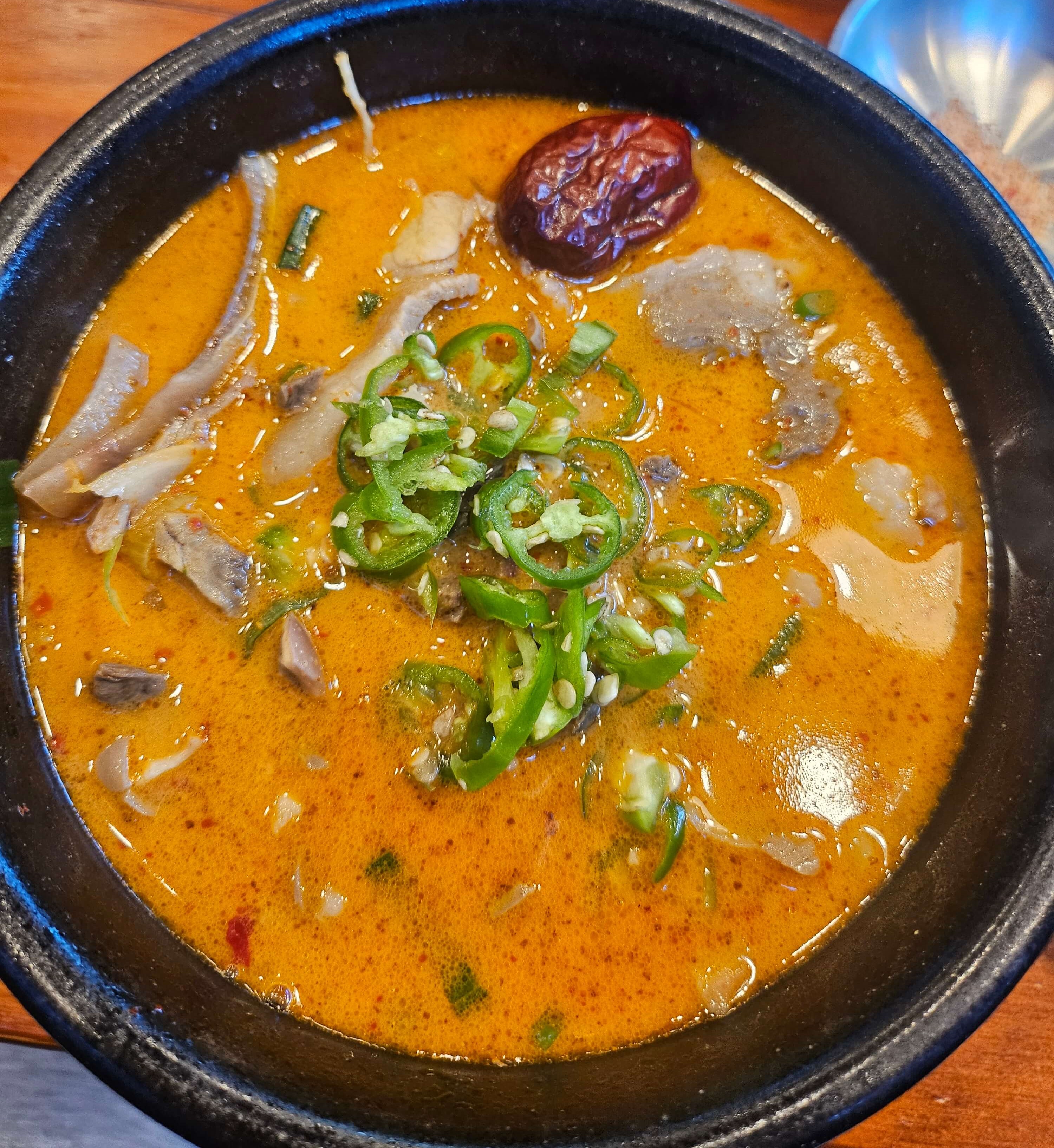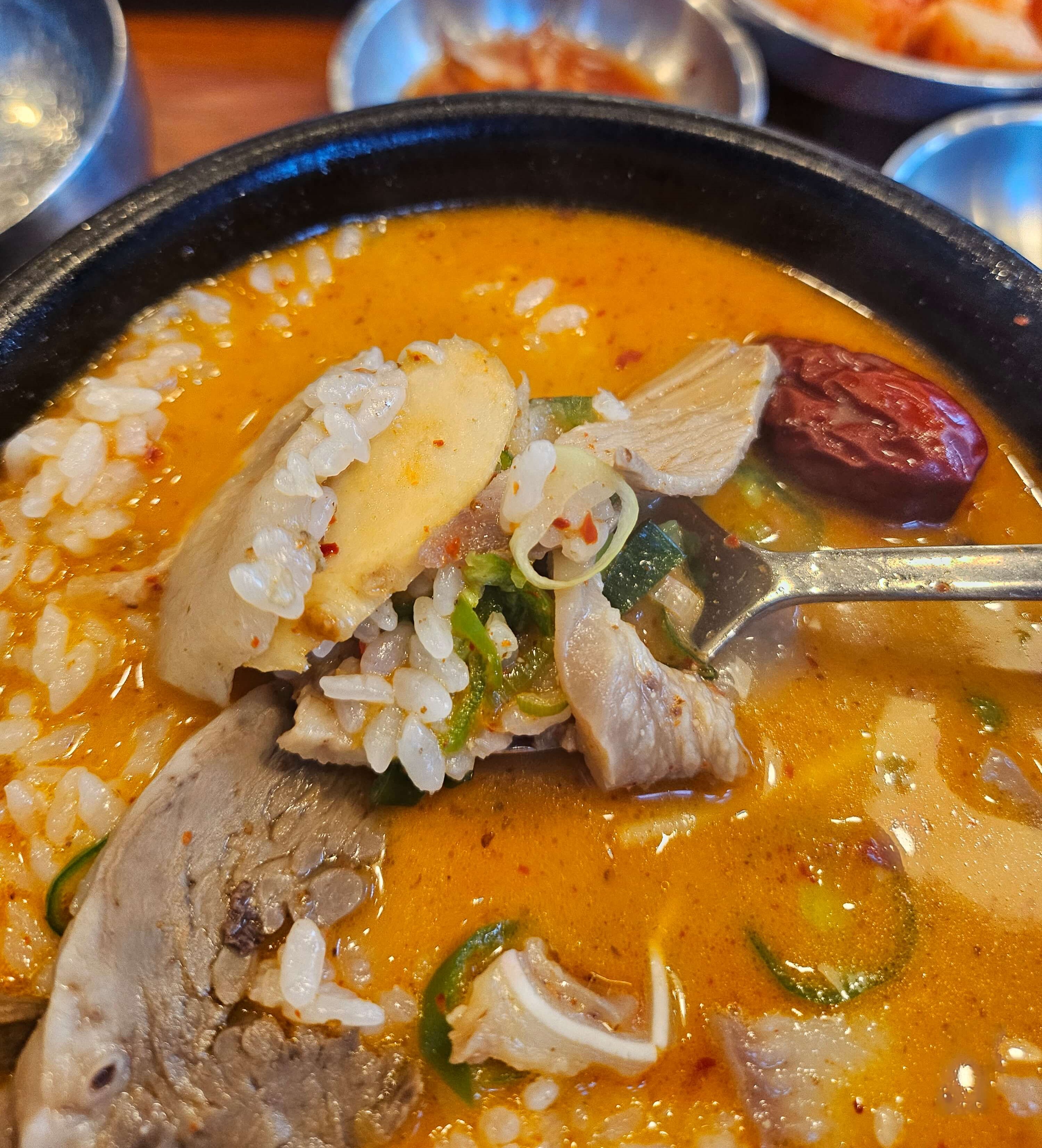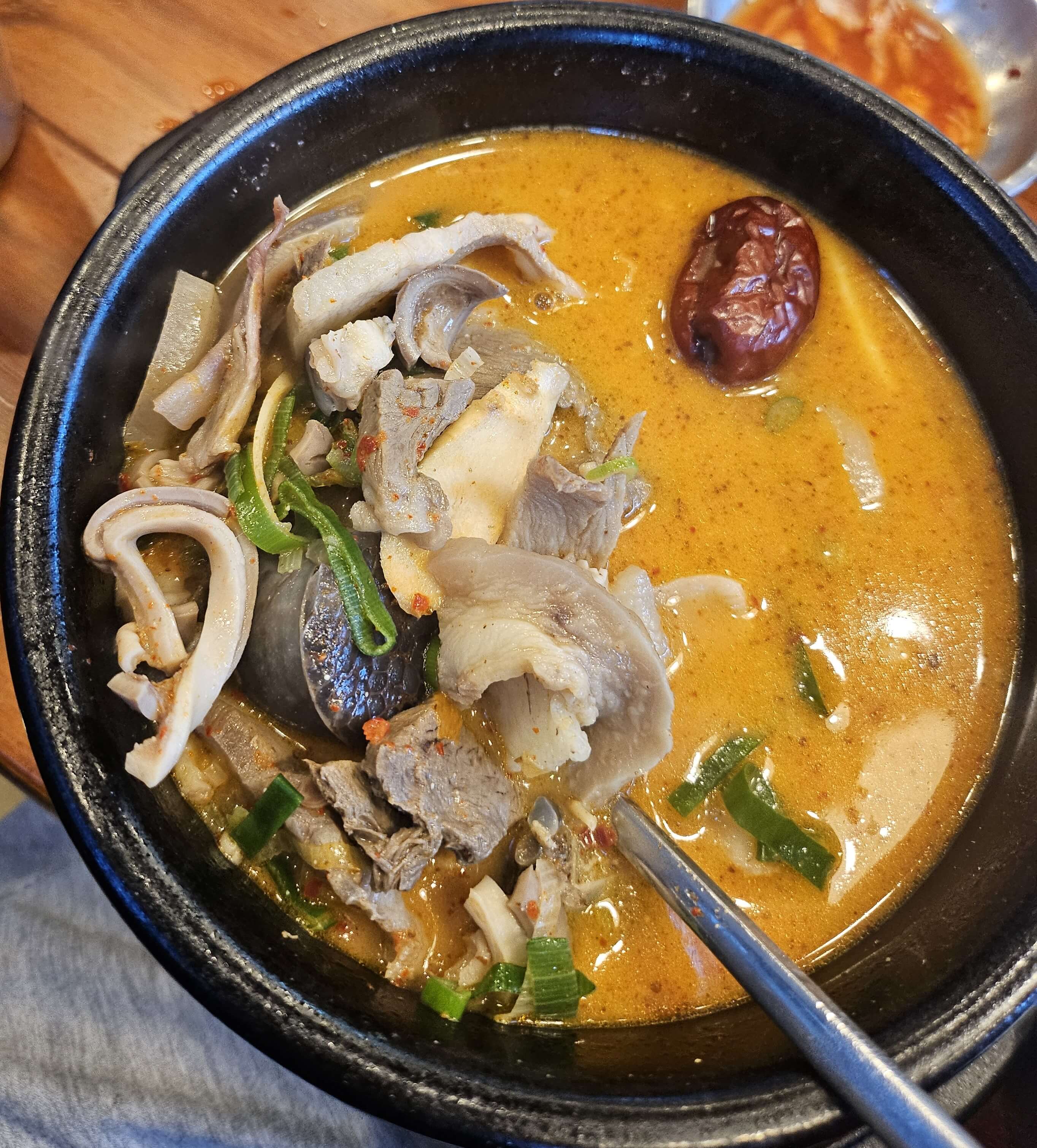 인삼순대국에는 대추, 인삼이 들어가 있었습니다. 인삼이 뿌리 채 들어간 건 아니었고 얇게 채 썰어서 들어가 있었습니다. 인삼이 많이 들어가 있지는 않지만 순대국에 적당하게 인삼향이 나는 게 좋았습니다. 국물에서 나는 인삼향 때문에 뭔가 보양식느낌이 났었습니다. 그리고 순대국에 중요한 순대랑 고기도 듬뿍 들어가 있어서 그런가 정식으로 추가를 안 해도 충분한 양이었습니다.