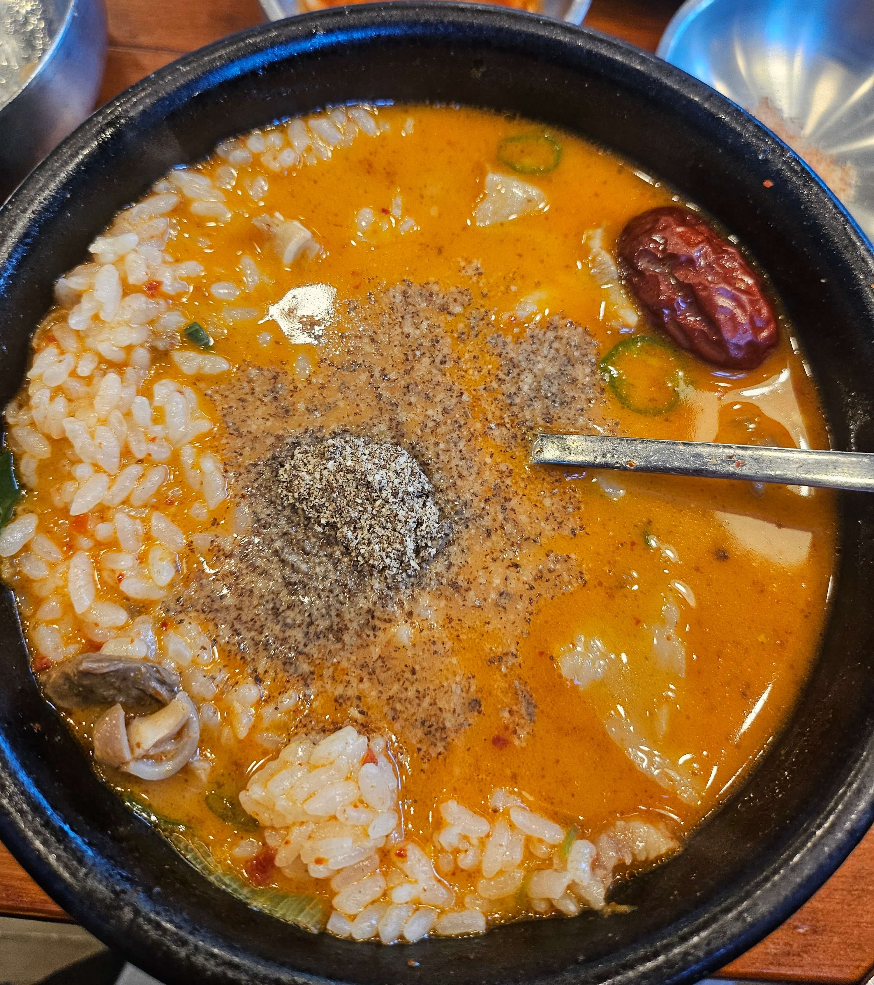 저는 해장을 하기 위해 방문한거라 조금 더 얼큰하게 먹고 싶어서 매운 고추와, 들깨가루를 추가하고 밥을 말아서 먹었습니다. 사실 다대기를 추가로 넣을까 고민을 했지만 강창구찹쌀진순대는 나올 때부터 황금비율로 양념이 들어가 있는 상태로 나오기 때문에 비율이 망가질까 봐 따로 다대기를 안 넣고 매운 고추를 넣었습니다.