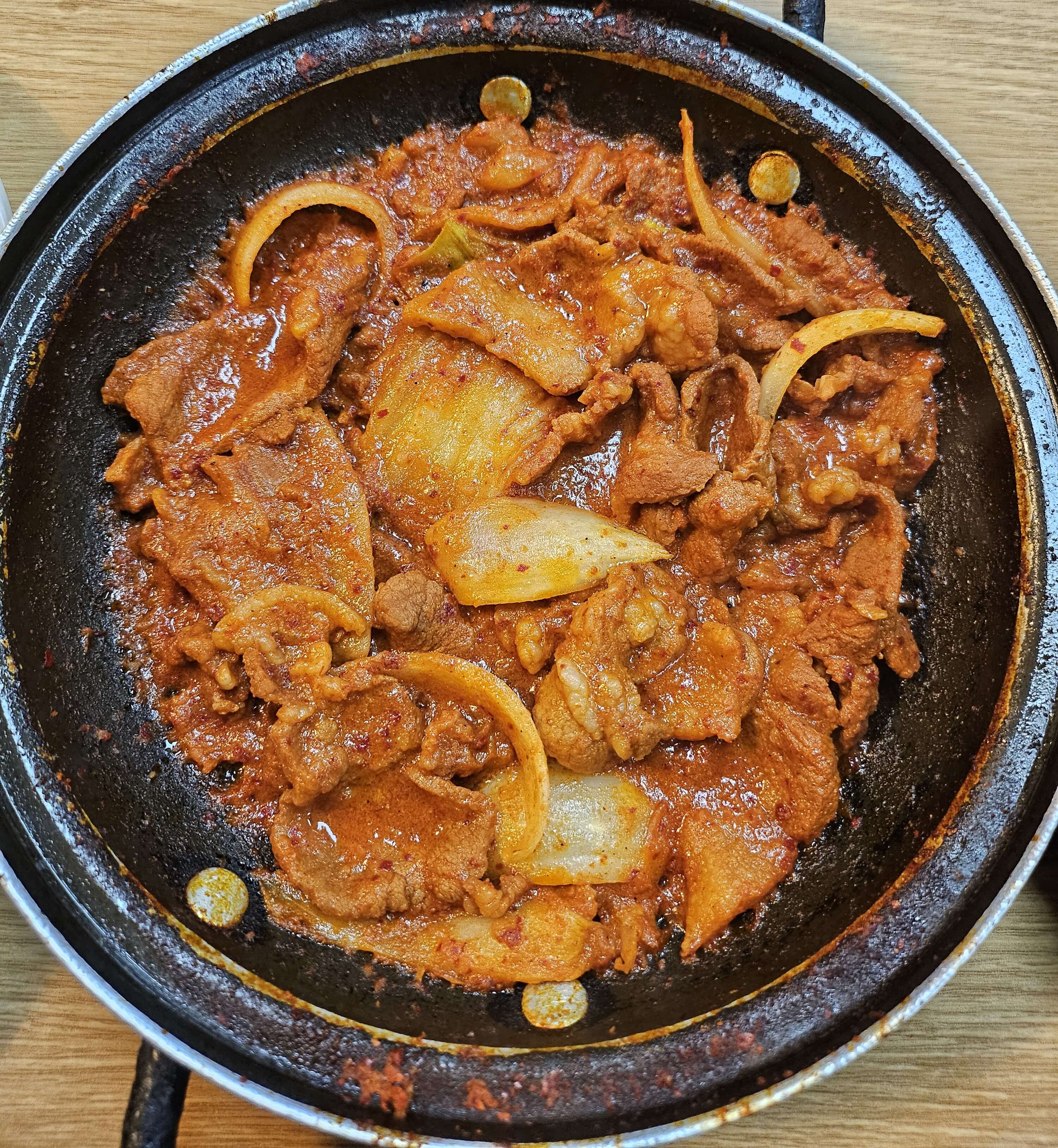 전주기사식당의 제육볶음은 비주얼과는 다르게 간이 세지 않은 제육볶음이었습니다. 제육에 김치, 양파도 넉넉히 들어가 있었습니다. 그리고 김치와 고기를 함께 먹었을 때 식감이 좋았습니다. 저는 간을 약간 세게 먹다 보니 간이 약간 부족하다고 느꼈지만 쌈장과 함께 먹거나 김치와 고기를 함께 싸 먹으면 간이 딱 맞았습니다.