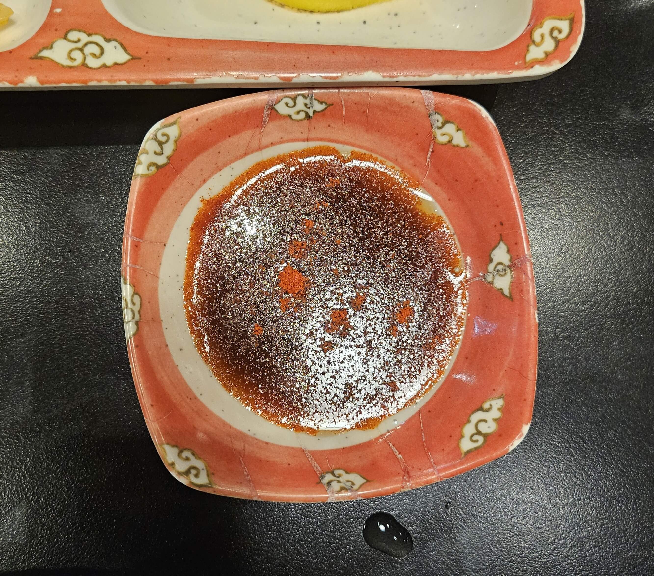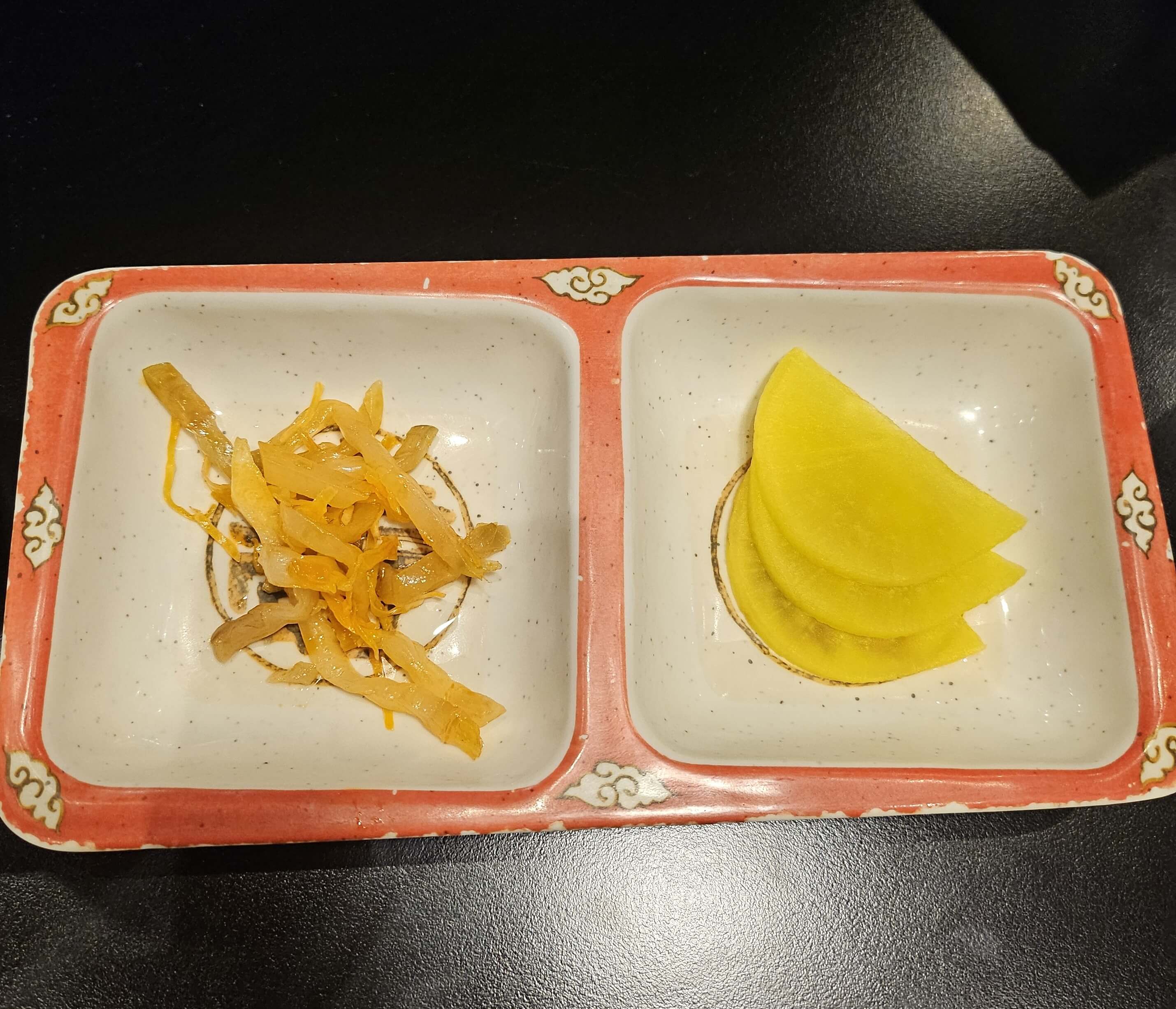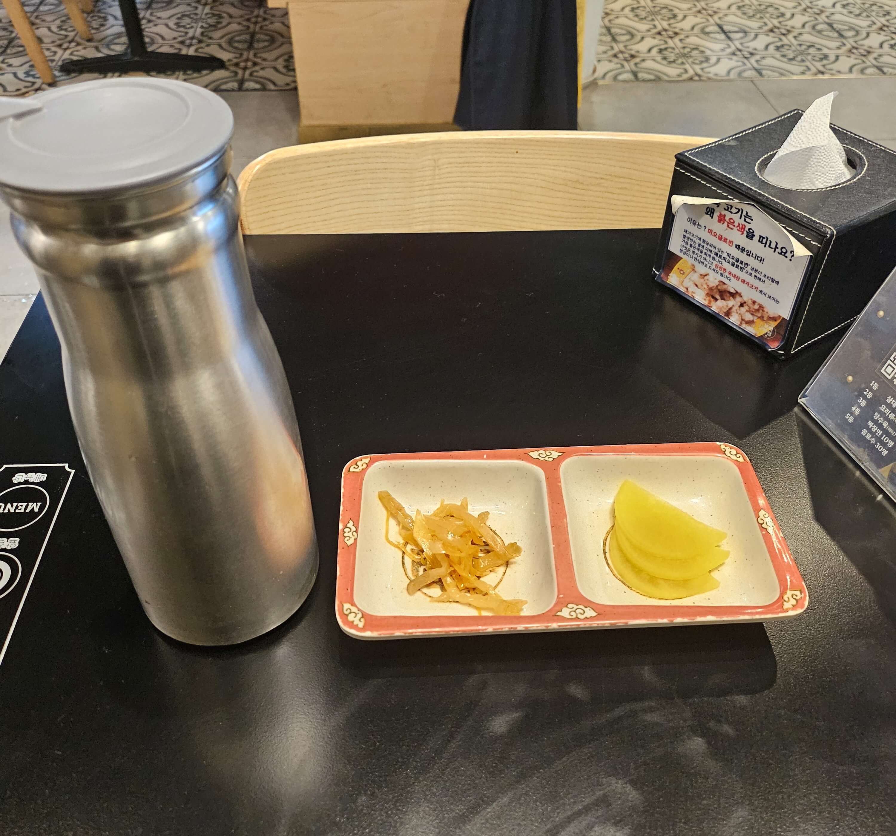 저는 이날에 보배짬뽕 9,500, 탕수육(미니) 13,000원을 주문했습니다. 서울 중식집에서는 많이 판매하지 않는 음식을 보배반점에서는 판매하고 있었습니다. 그 음식도 다음 글에서 알려드리겠습니다. 음식을 주문하고 조금 기다리고 있다 보니 시원한 물이 담겨 있는 물통과, 짜사이, 단무지가 나왔습니다. 저는 음식이 나올 때까지 탕수육에 찍어먹을 간장소스를 만들었습니다. 제 개인적인 취향이지만 간장 2, 식초 1, 고춧가루 듬뿍 넣은 간장소스가 제일 맛있는 것 같습니다. 이 소스에 포인트는 생각보다 식초와 고춧가루를 생각보다 많이 넣는 겁니다. 저는 탕수육 먹을 때 이 간장소스 아니면, 소금후추에 찍어먹는걸 가장 좋아합니다.