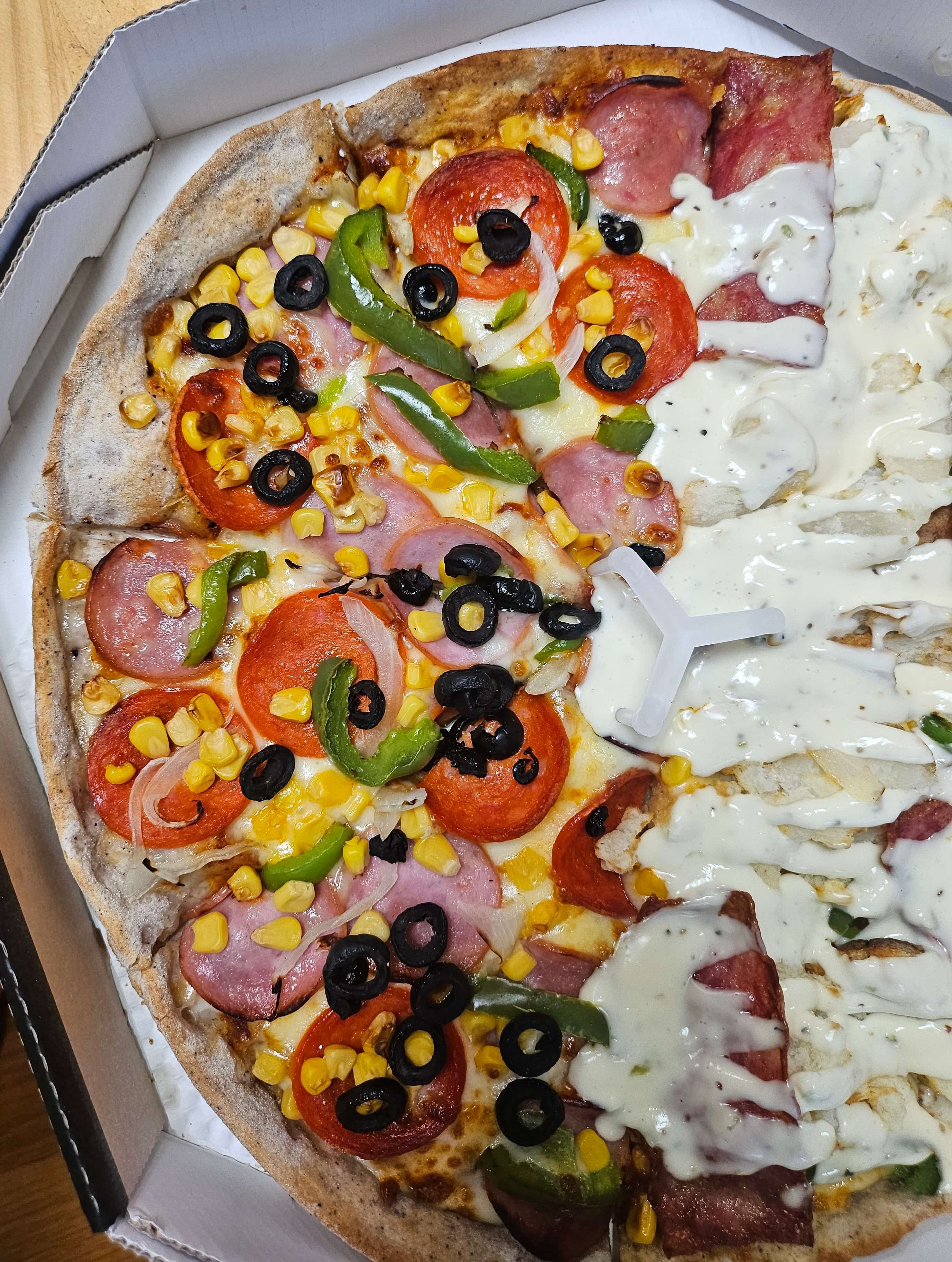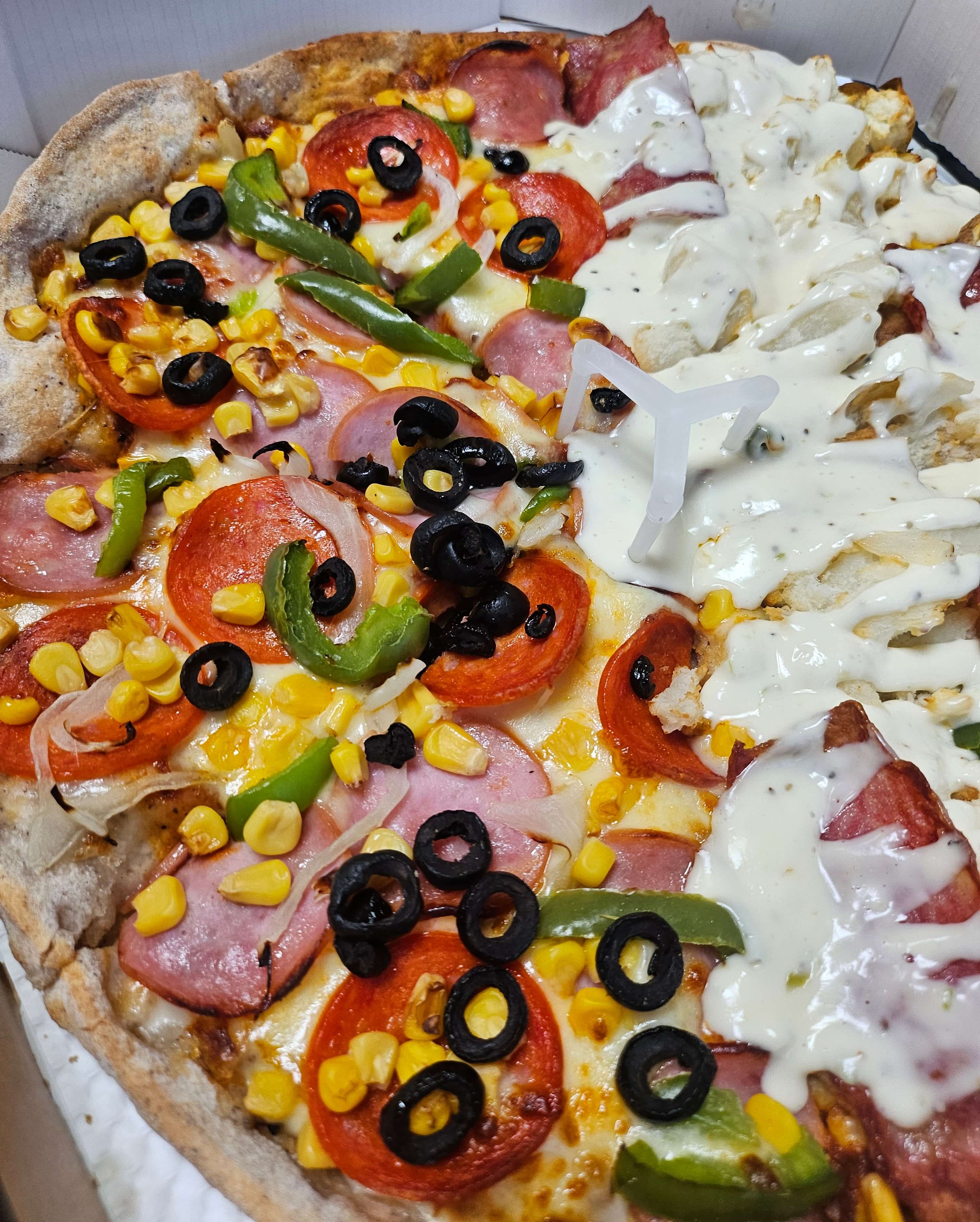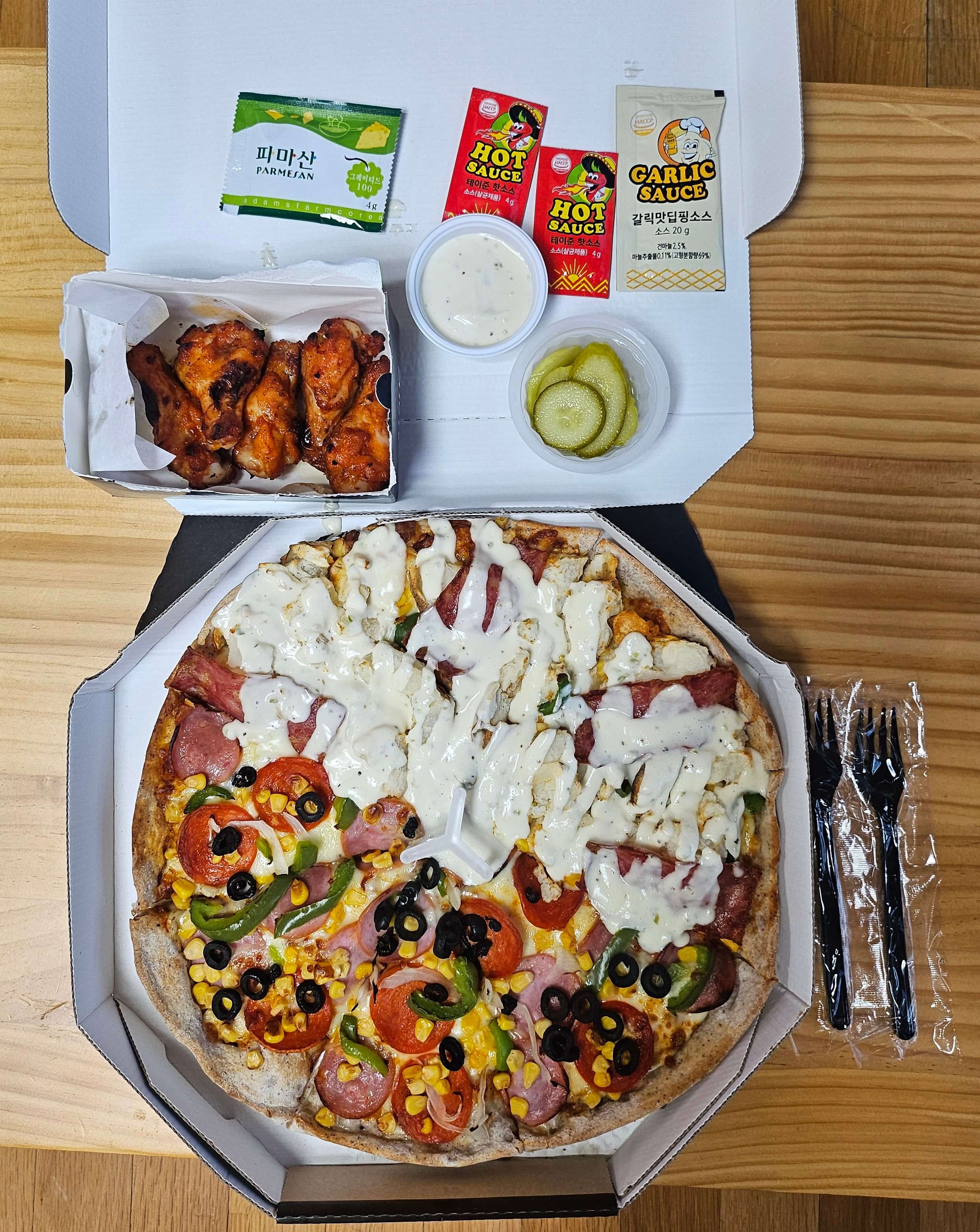 제가 주문한 반반피자, 핫봉, 콜라 1.25l, 파마산 치즈가루, 핫소스 2개, 갈릭디핑소스, 피클, 렌치소스, 포크 2개가 있었습니다. 토핑빨은 따로 소스를 추가하지 않을 정도로 기본소스를 넉넉히 챙겨주셨습니다.
