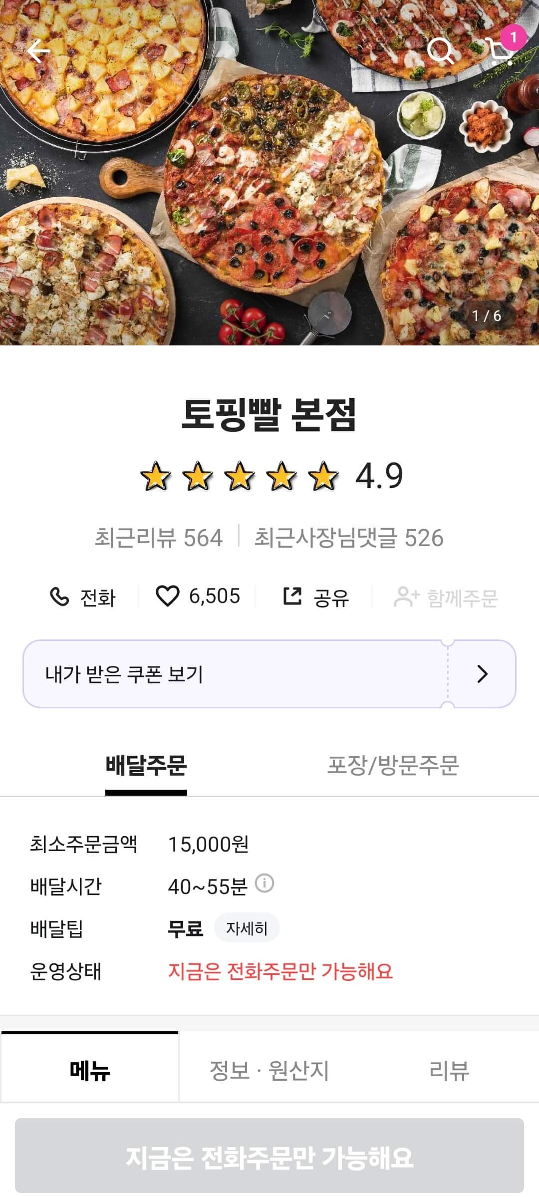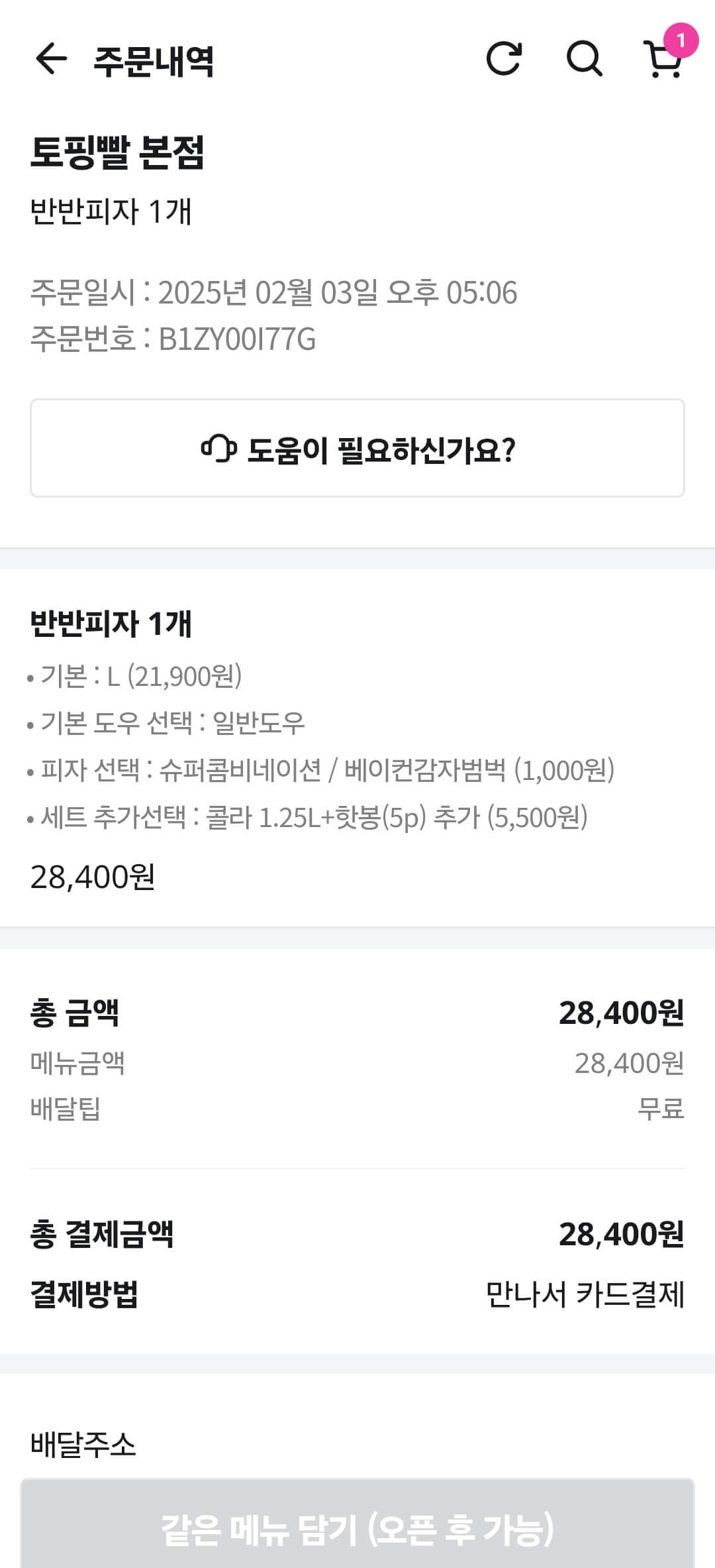 토핑빨은 배달, 포장 전문점입니다. 저는 토핑빨의 시그니처 메뉴 반반피자로 주문을 했습니다. 슈퍼콤비네이션/ 베이컨감자범벅(1,000원), 콜라 1.25l+핫봉(5p) 추가(5,500원) 28,400원을 결제했습니다. 참고로 토핑빨 미아본점은 배달의 민족 기준 배달팁이 무료였습니다.