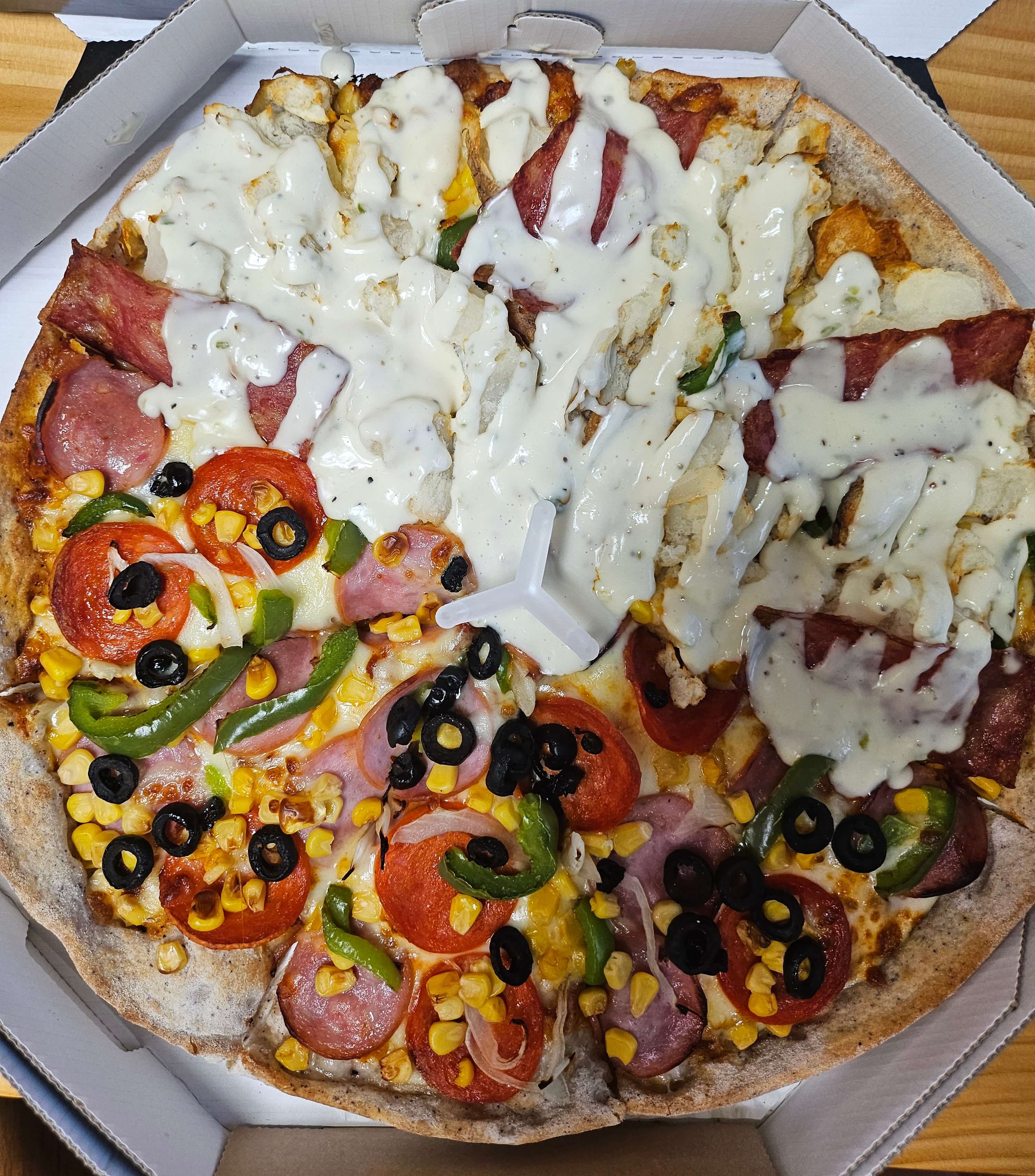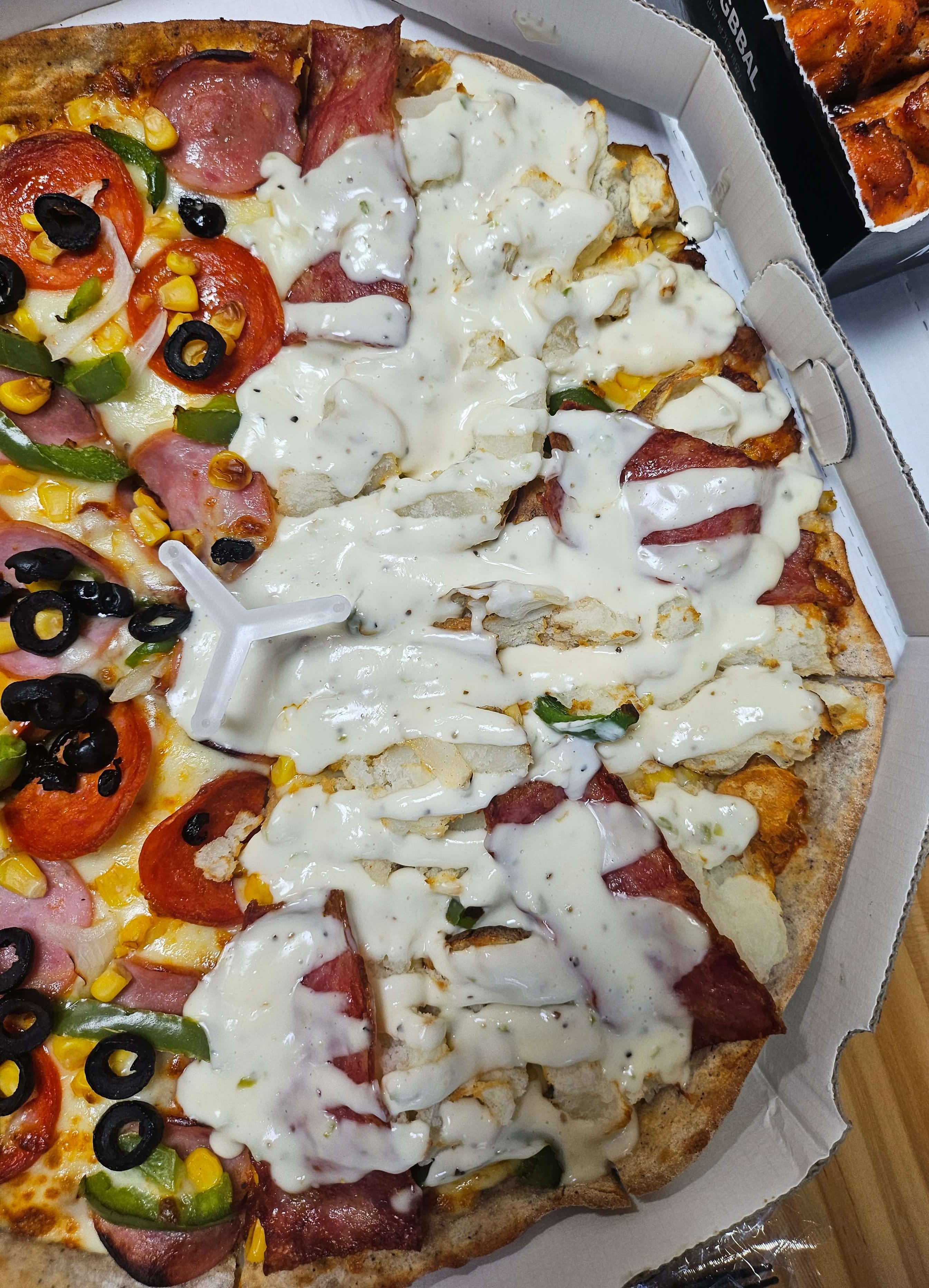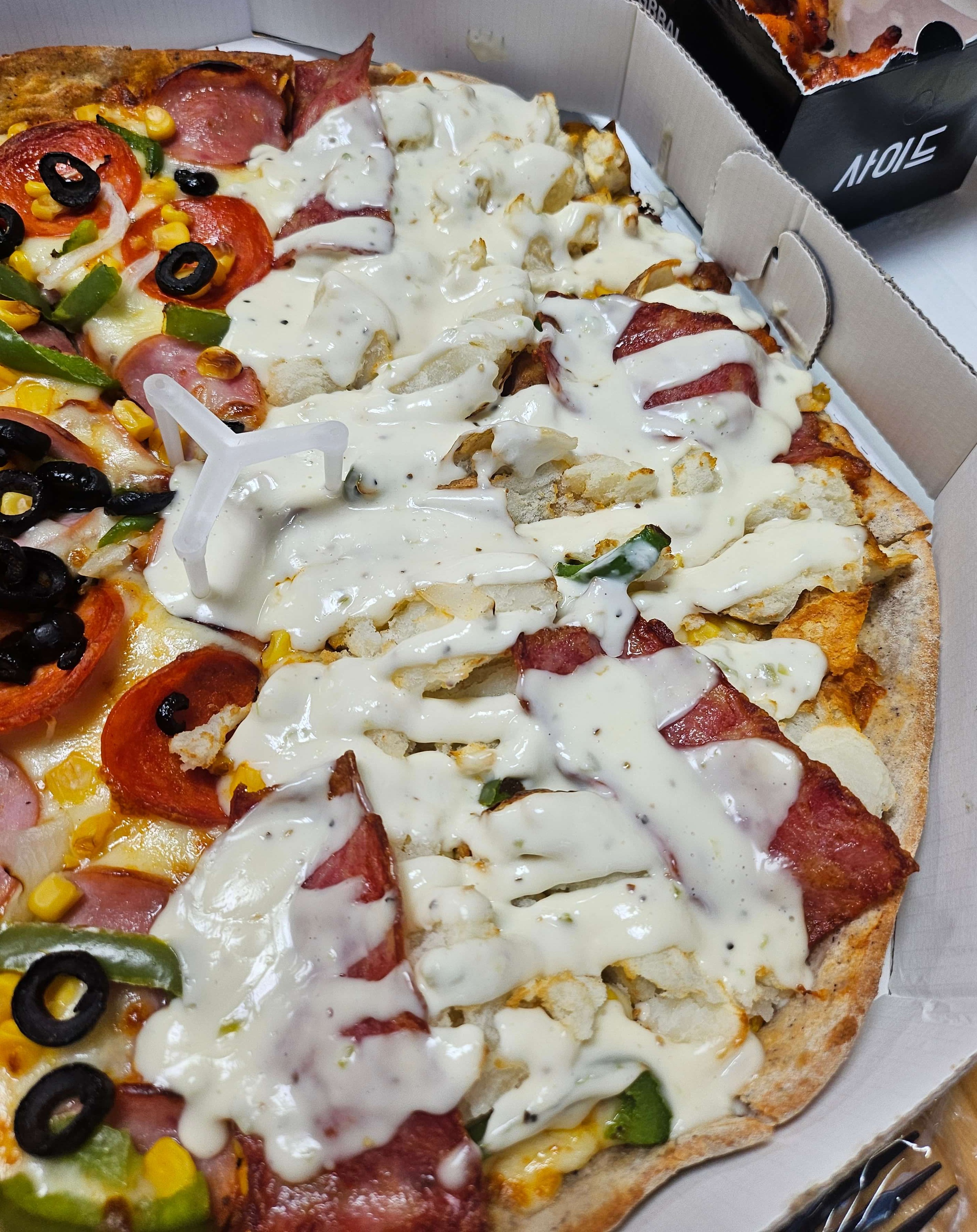 1,000원 추가한 베이컨감자범벅 피자에는 위에 포슬포슬한 감자와 베이컨, 그리고 렌치소스가 넉넉하게 뿌려져 있었습니다.