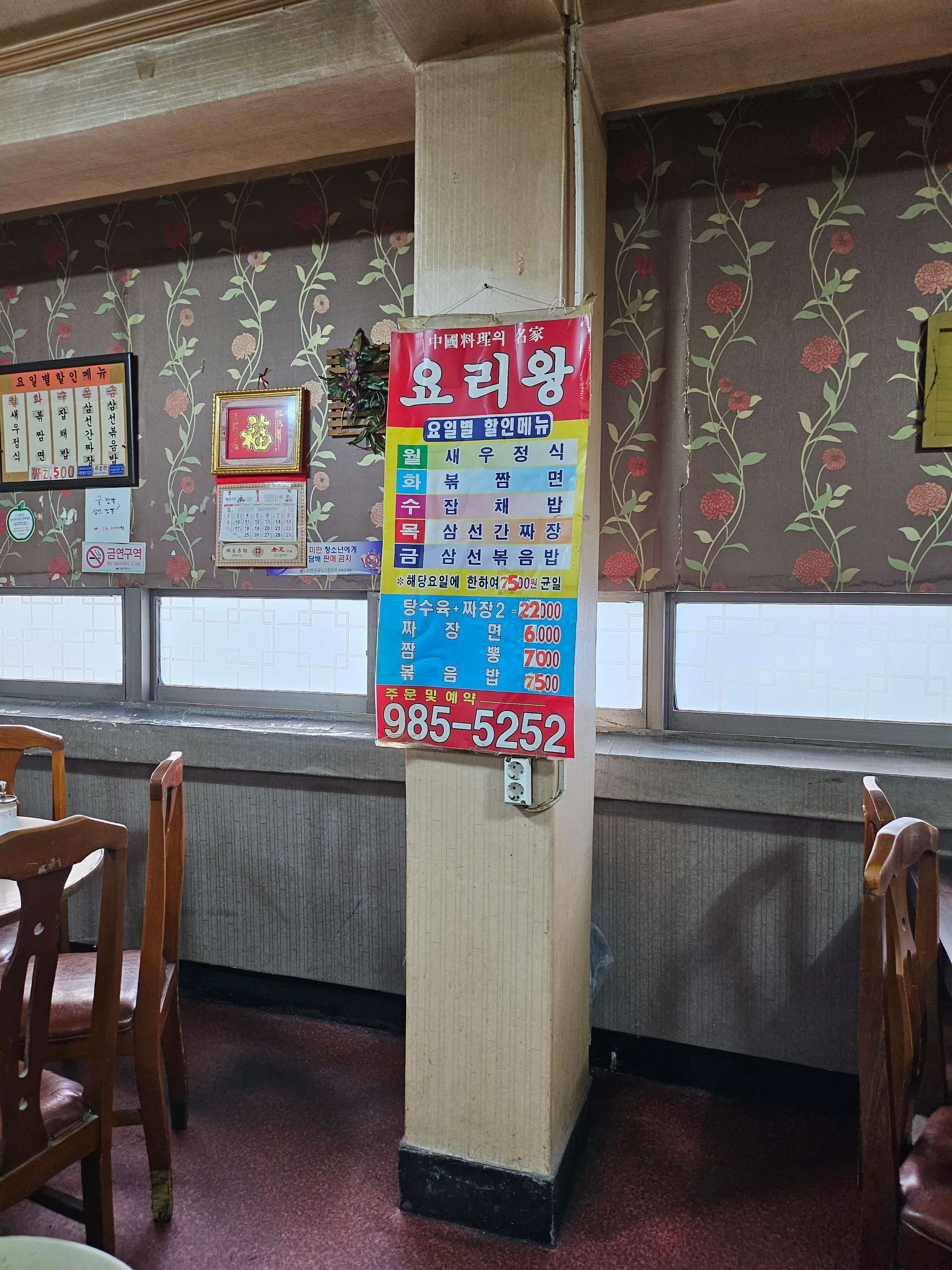 매장 외관, 내부부터가 정말 오랫동안 운영되고 있는 게 느껴졌습니다. 저는 오히려 이런 분위기가 "이곳은 맛집이구나"라는 생각이 들게 하였습니다. 주방은 반오픈형 주방이었는데 슬쩍 보이는 주방 상태도 정말 깔끔했습니다. 당연히 오랫동안 운영되었던 가게다 보니 주방에서 세월의 흔적이 느껴지는 건 어쩔 수 없었지만 중화요리라고 하면 기름을 많이 쓰는 요리다 보니 기름때가 껴있을 수도 있는데 요리왕은 사장님이 정말 주방 청소를 열심히 하는 게 느껴지는 깔끔한 주방이었습니다. 매장 내부 테이블로는 큰 원형 테이블 2개, 4인 테이블 2개, 2인테이블 하나가 있었습니다. 제가 방문했을 때는 영업시작한 지 얼마 안 됐을 때 방문을 했습니다. 그러다 보니 아직 손님이 오지는 않았습니다. 그리고 매장 분위기에 비해서 사장님이 생각보다 젊으셨습니다. 대략 40~50대로 보이는 남자 사장님이 혼자 계셨습니다.