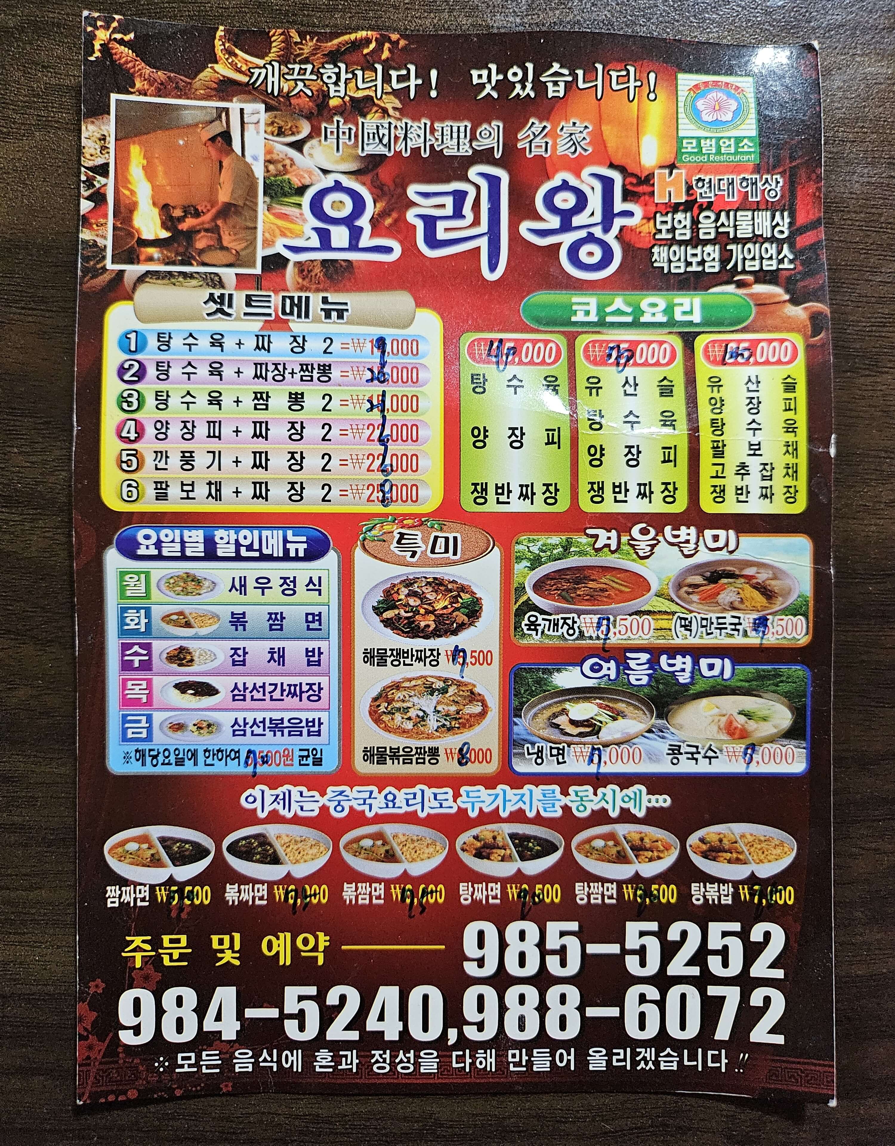 오늘은 저희 집에서 도보로 3분도 안 걸리는 맛집을 이제야 알게 되어서 여러분들에게도 소개해드리려고 합니다. 바로 '요리왕'이라는 중식당입니다. 이곳은 제가 자주 다니는 길에 있었던 중식당인데 2층에 위치해 있기도 하고 눈에 안 띄어서 지금까지 모르고 있었습니다. 하지만 쉬는 날 집 근처 중식당을 알아보다가 방문하게 된 곳인데 시골에 있는 중국집 느낌의 중국집이었습니다. 당연히 맛도 너무 좋았고 가격이 정말 저렴해서 여러분들에게도 소개해드리려고 합니다. 이런 좋은 맛집을 지금 알게 된 게 너무 아쉽습니다. 매장 앞에는 옛날 시티 배달오토바이가 있었는데 배달대행을 쓰는 게 아닌 직접 배달을 하는 것처럼 보였습니다. 이 글을 보시는 분들 중에서 강북구에 거주하신다면 꼭 방문하시는 걸 추천합니다.
