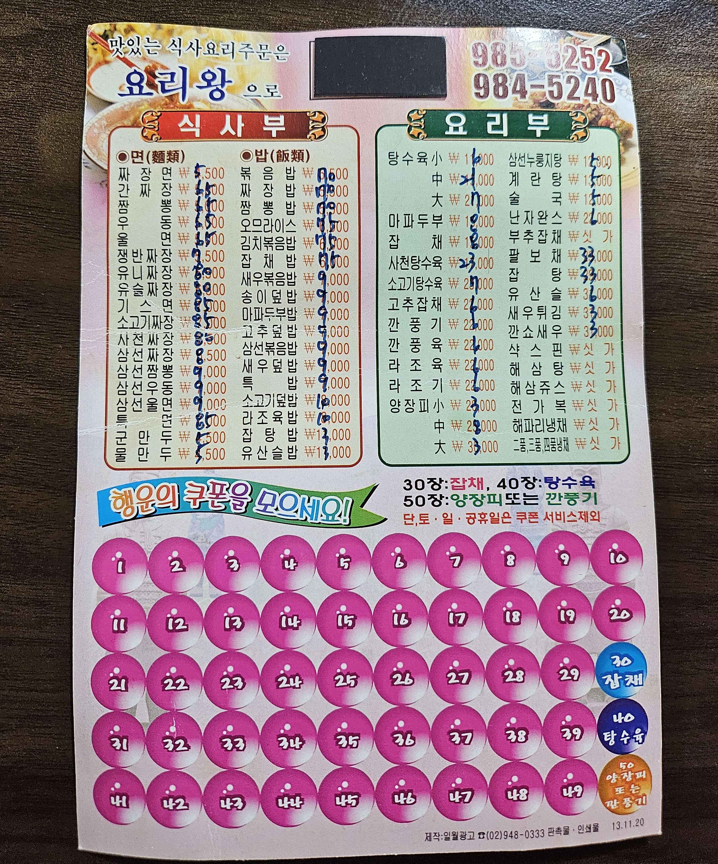 매장 한쪽 잘 보이는 곳에는 요일별 할인메뉴판이 있었습니다. 월 새우정식, 화 볶짬면, 수 잡채밥, 목, 삼선간짜장, 금 삼선볶음밥이 7,500원으로 할인이 되고 있었습니다. 메뉴판은 따로 있지 않아서 사장님한테 말씀드리니 어렸을 때 동네 짜장면집에서 가져다주는 스티커 메뉴판을 가져다주셨습니다. 오랜만에 보는 메뉴판이어서 반가웠습니다. 요리별 할인을 안 해도 요즘 물가에 비해 저렴한 가격이었습니다. 저는 볶짜면 7,500, 탕수육(소) 16,000원을 주문했습니다.