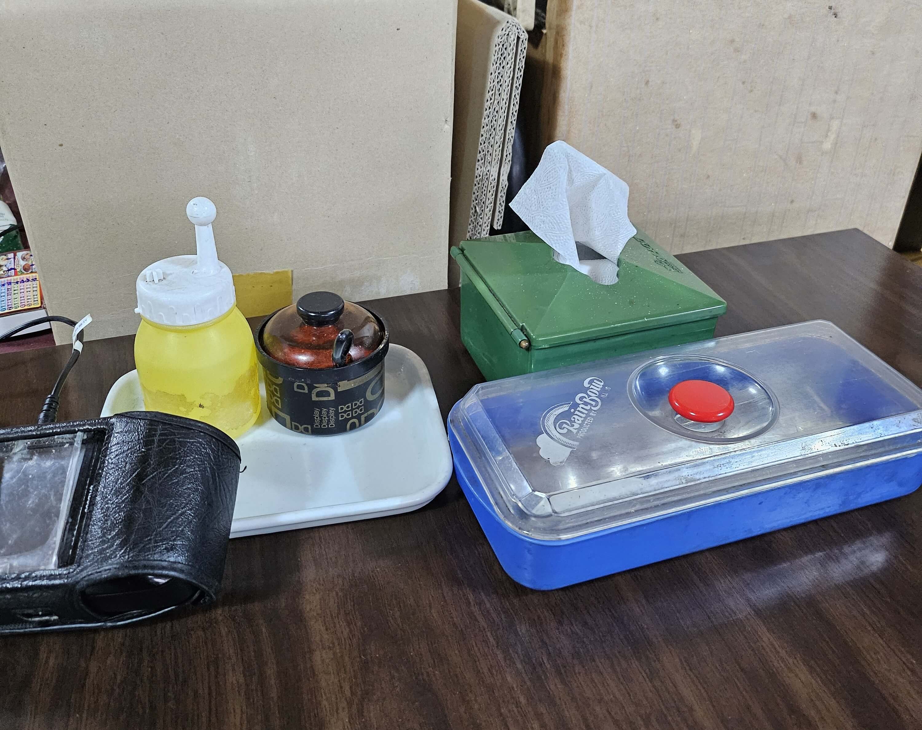 자리마다 식초, 고춧가루, 냅킨, 수저, 젓가락이 들어있는 수저통이 있었습니다. 요즘에는 테이블 서랍에 수저, 젓가락이 배치되어 있는 경우가 많은데 오랜만에 보는 세월의 흔적이 느껴지는 수저통이었습니다. 자리에 앉아 있으니 사장님이 따뜻한 물 한잔을 가져다주셨습니다.