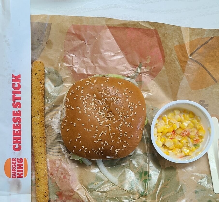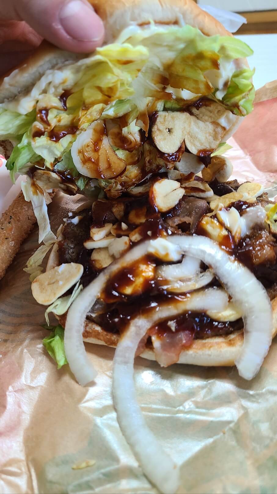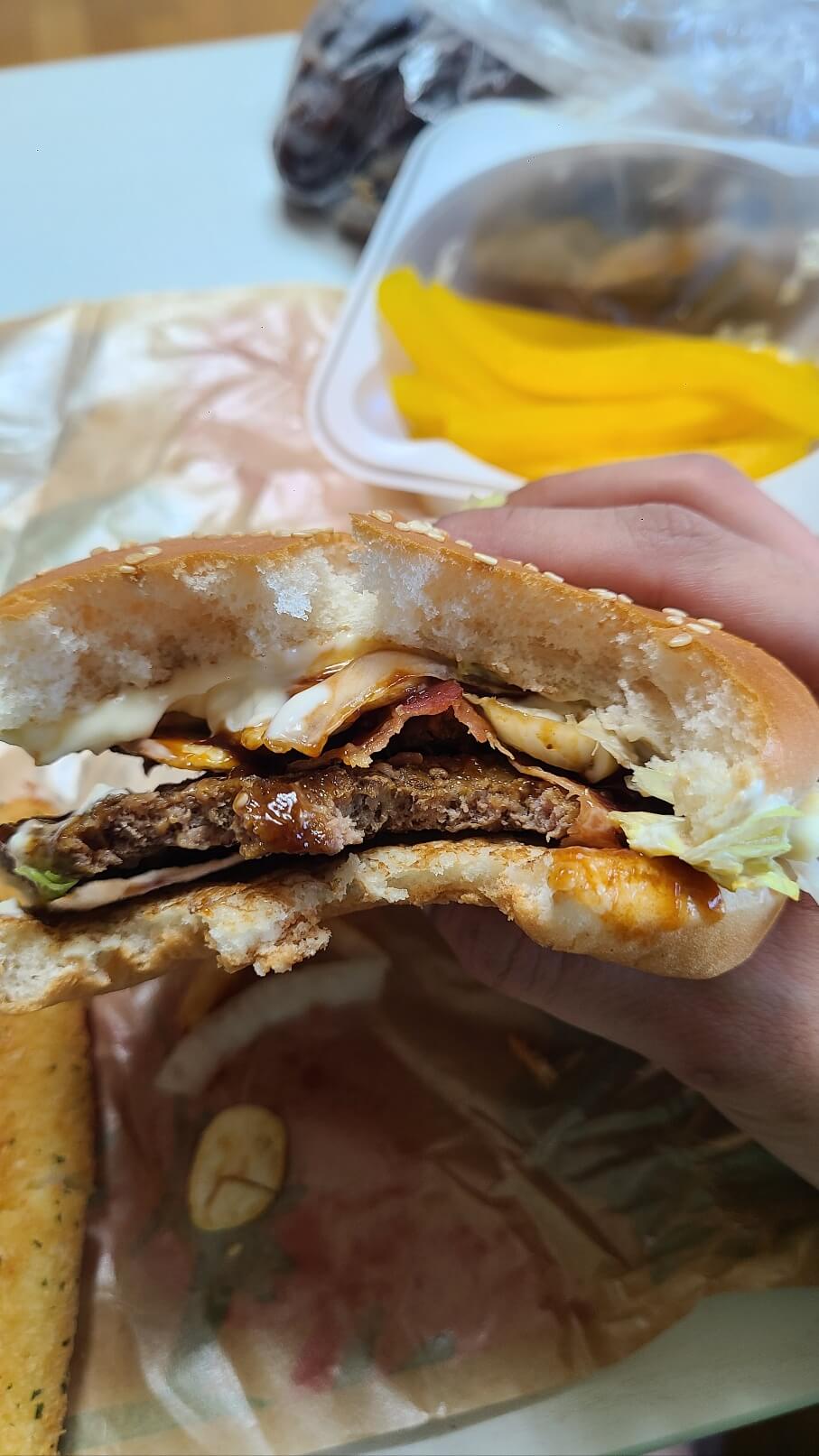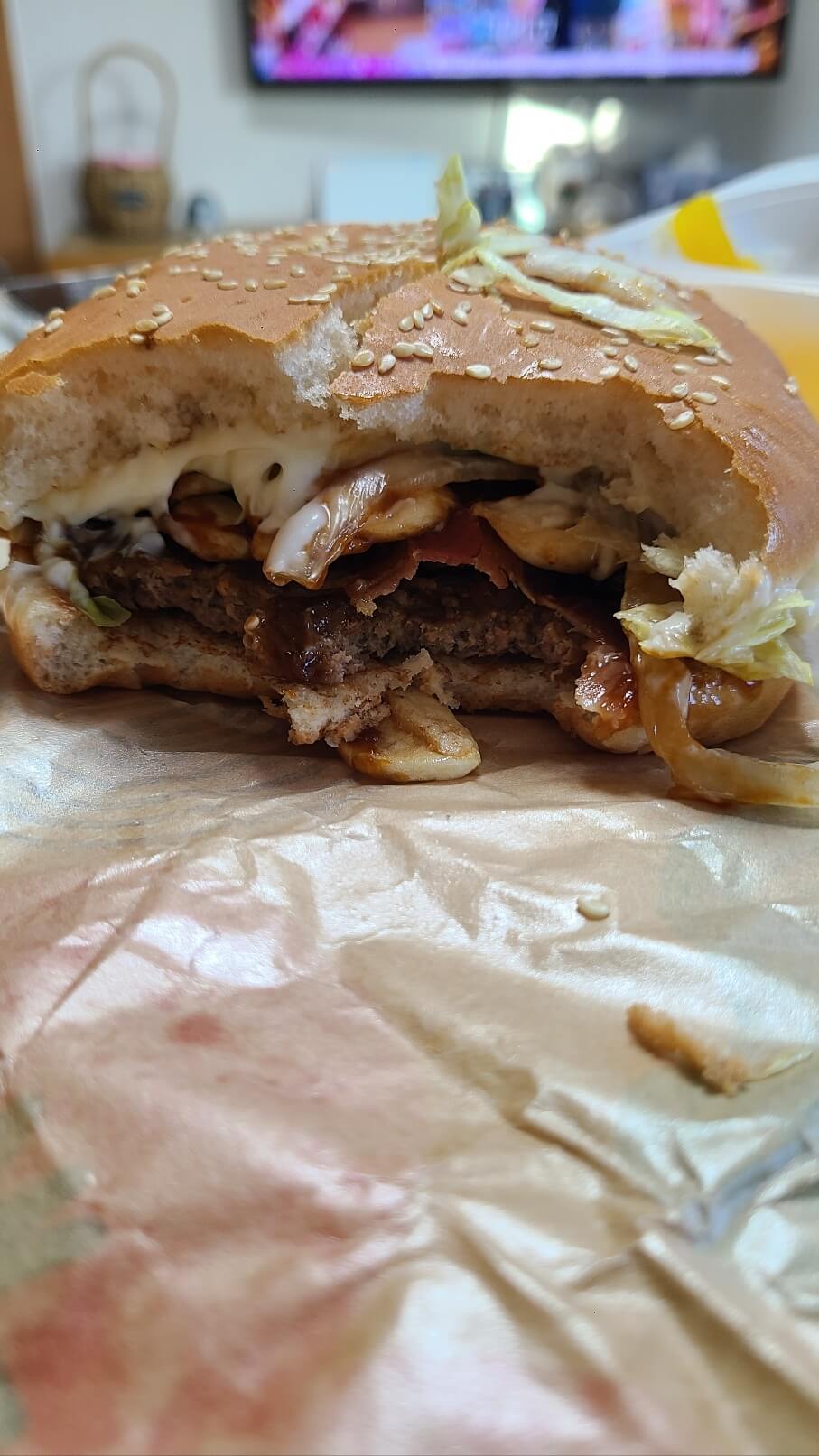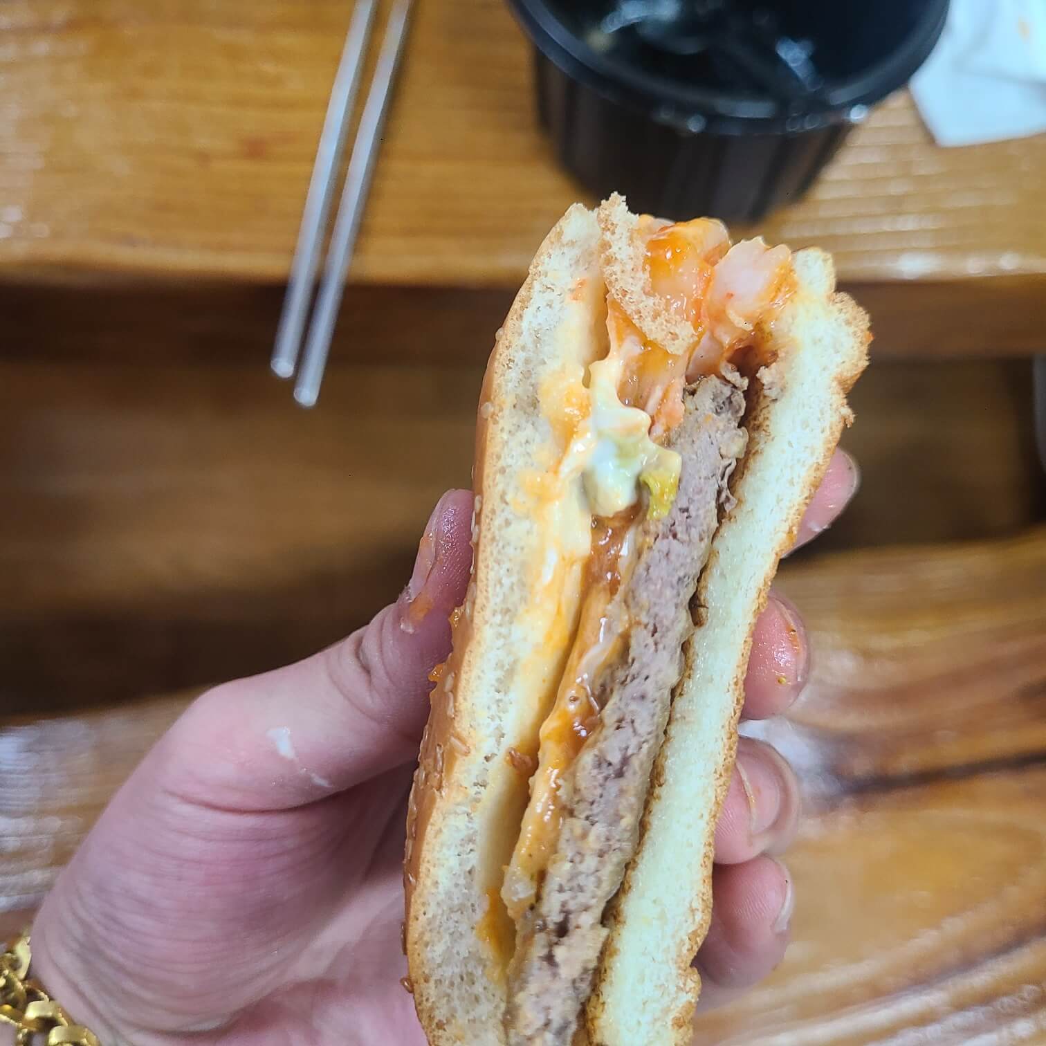 한입 배워 무고 단면을 보았는데 처음엔 솔직히 버거킹 큐브스테이크가 없고 패티만 있어서 실망을 했었는데 중간쯤 먹으면서 소스와 야채 속에 숨겨져 있는 큐브스테이크가 패티 위에 올려져 있었습니다.큐브스테이크는 직화로 구운 패티의 불 맛과 달콤한 비비큐 소스 맛이 어우러져서 맛도 좋았습니다. 거기에 양파가 느끼할 수 있는 부분을 잡아주어서 맛있게 먹었습니다.