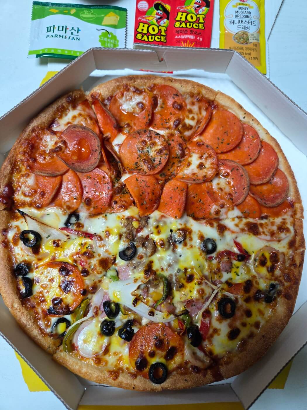 페퍼로니 피자는 사진만 보셔도 아실 수 있겠지만 페퍼로니가 정말 가득하게 있었습니다. 페퍼로니 피자는 먹다 보면 치즈도 넉넉하게 들어있었지만 페페로니가 너무 많아 치즈가 안보였습니다. 페퍼로니피자는 치즈의 풍미와 페퍼로니의 짭짤함이 잘 어우러지는 피자 맛이었습니다. 좀 오버해서 말해서 환 공포증이 있으신 분들이 라면 먹기 힘들 정도로 페퍼로니가 가득 들어가 있었습니다. 무심하게 올라간 듯 하지만 빈 곳 없이 페퍼로니가 꽉꽉 채워져 있었습니다. 안에 토마토소스도 넉넉하게 들어가 있어서 짭짤, 새콤달콤, 고소함이 다 느껴지는 피자였습니다. 취향껏 핫소스나 파마산가루를 뿌려서 드시면 더욱 맛있게 드실 수 있을 거라고 생각이 들었습니다.