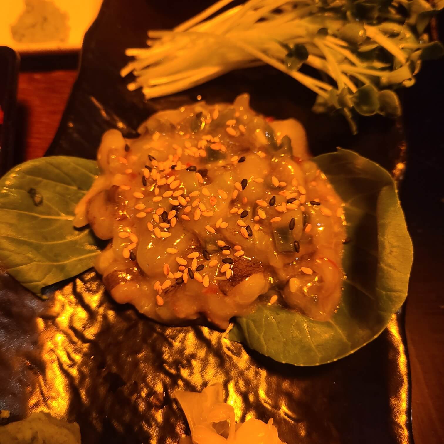 수오뎅의 타코와사비는 비주얼과는 다르게 참기름으로 양념이 되어있었는데 매운걸 잘 못 먹는 제 입맛에는 더 맛있었습니다. 그냥 먹어도 맛있고 무순이랑 같이 먹으니 그냥 먹었던 것보다 훨씬 더 맛있었습니다.