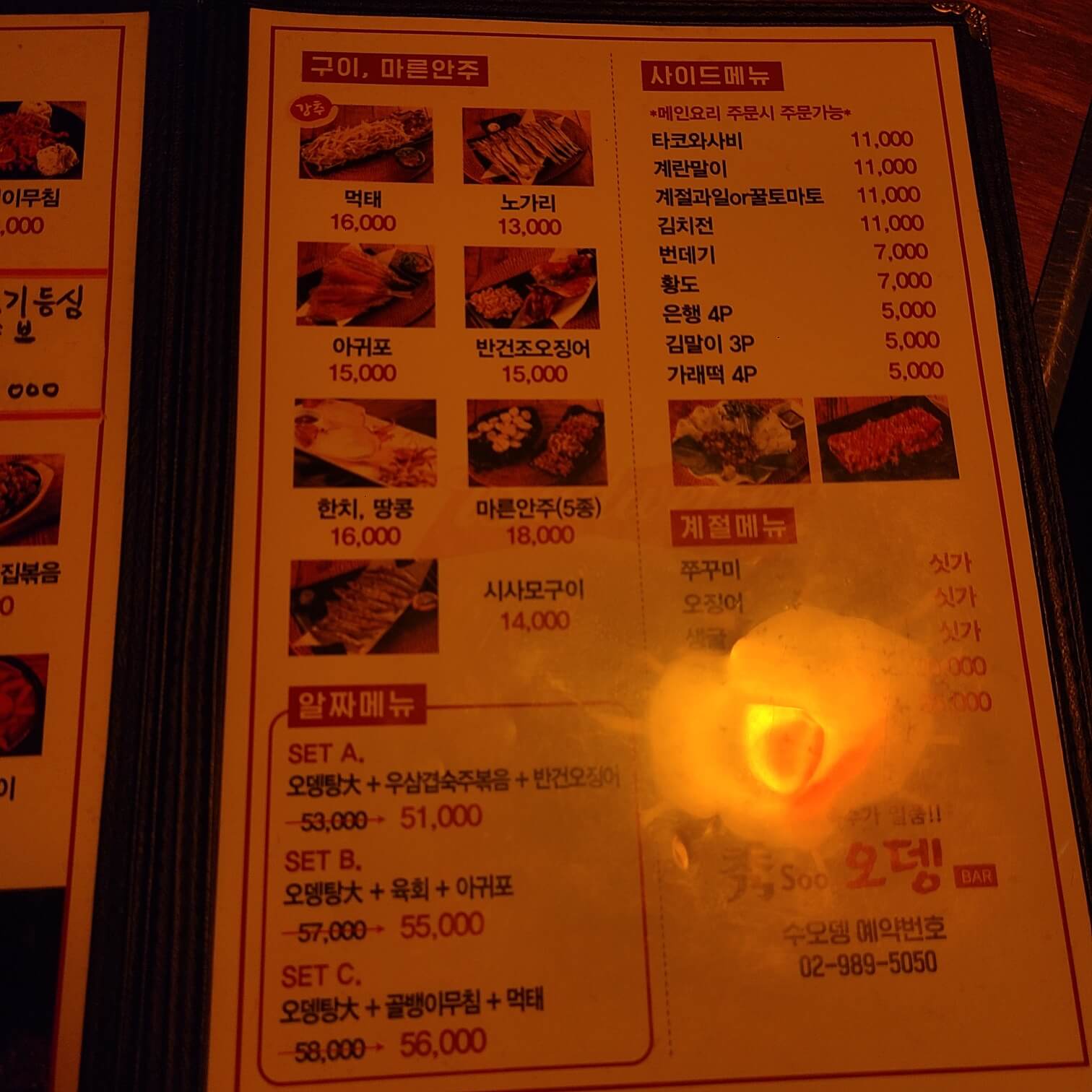 수오뎅의 메뉴판입니다. 동네 포차나 주점 가면 흔히 볼 수 있는 정겨운 메뉴판입니다.