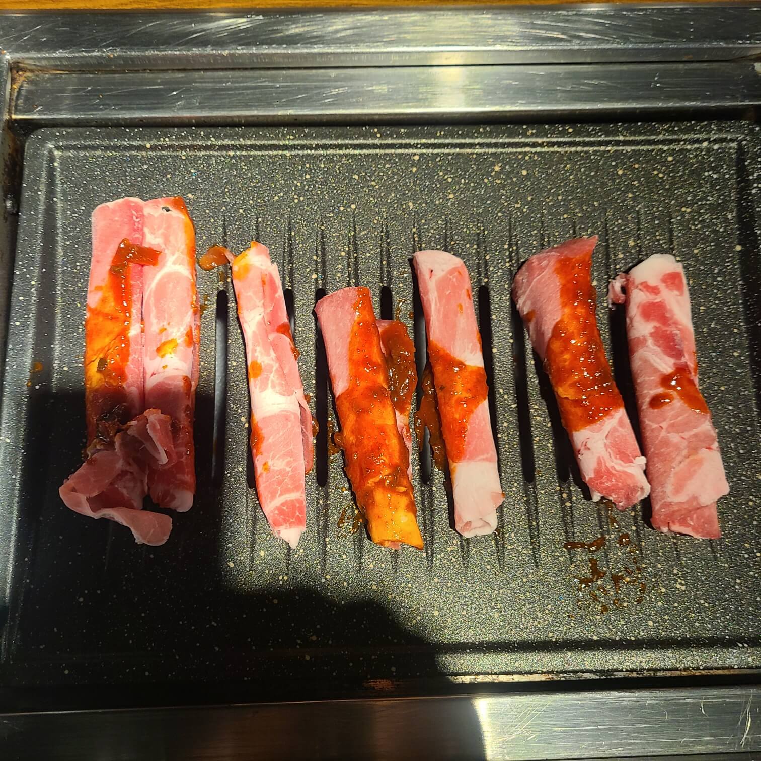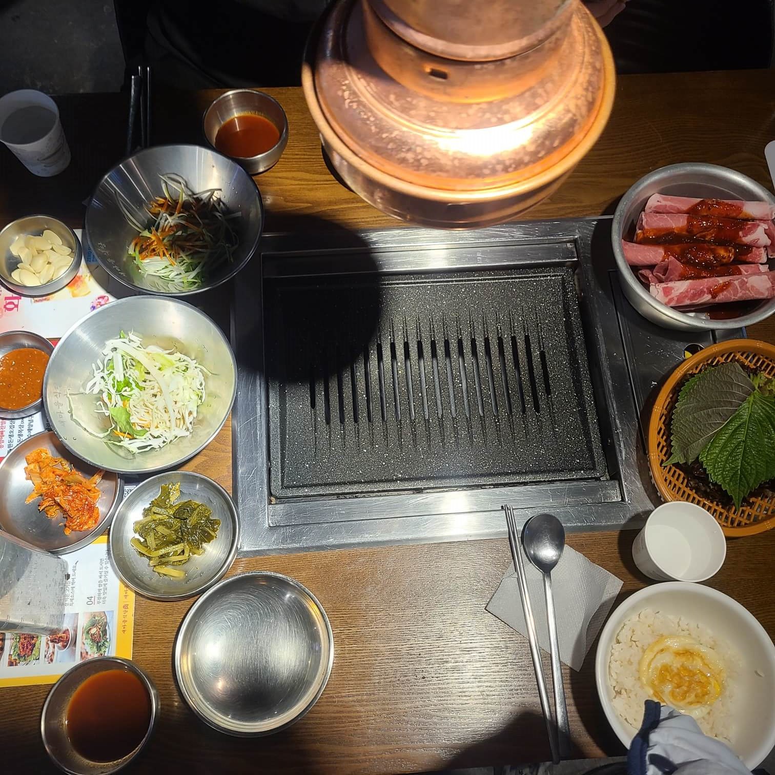 열탄불고기가 나왔는데 보기에는 나름 푸짐해 보였지만 먹어보니 2인분인데도 양은 많지는 않습니다. 본격적으로 먹을 준비를 하고 고기를 불판 위에 올려줍니다. 그리고 하나 둘 익어가는 고기들 열탄불고기 투박한데 정말 맛있습니다 양념이 많아 보여 짤까 봐 걱정하실 수도 있는데 하나도 안 짜고 간이 딱 맞는 게 정말 맛있습니다.. 고기도 튼실했는데 목사과 차돌박이의 중간정도 두께정도입니다. 하지만 열탄불고기를 세트가 아닌 단품으로 시켜 먹기에는 약간 비싸다는 느낌이 들 수도 있을 것 같습니다.