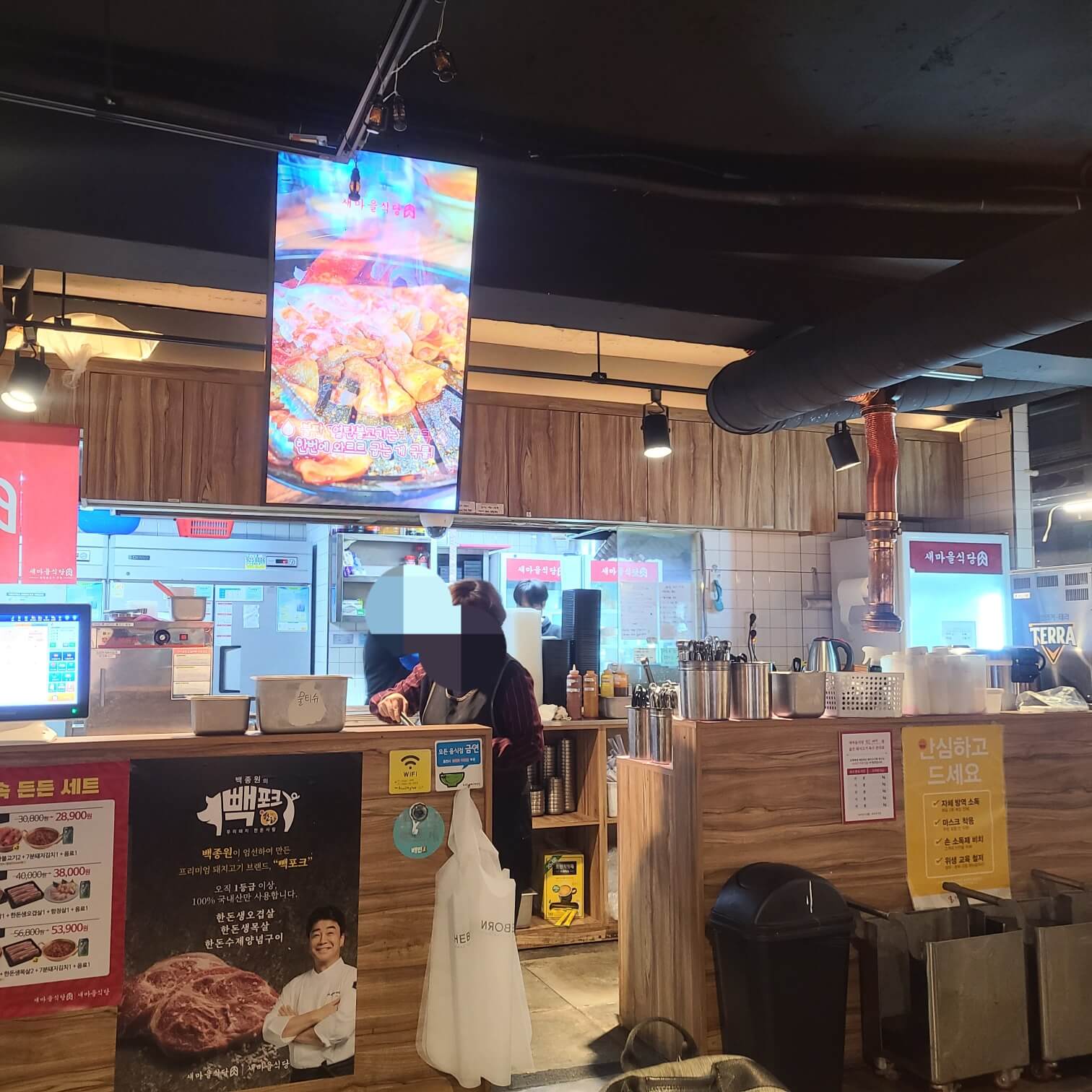매장은 넓었고,의자 뚜껑을 열면 짐을 넣을 수 있게 되어 있어서 옷에 음식 냄새가 배이지 않아서 좋았습니다.