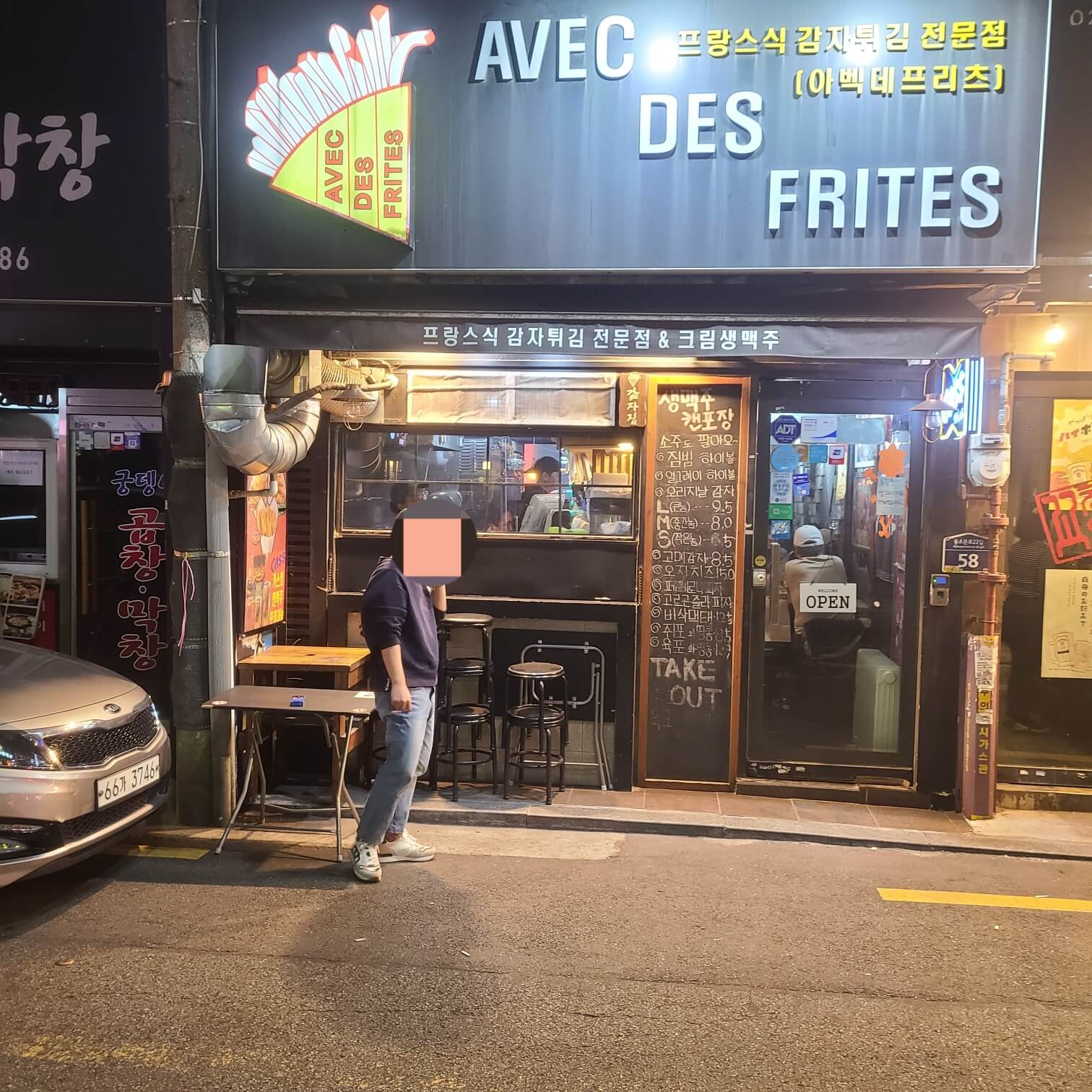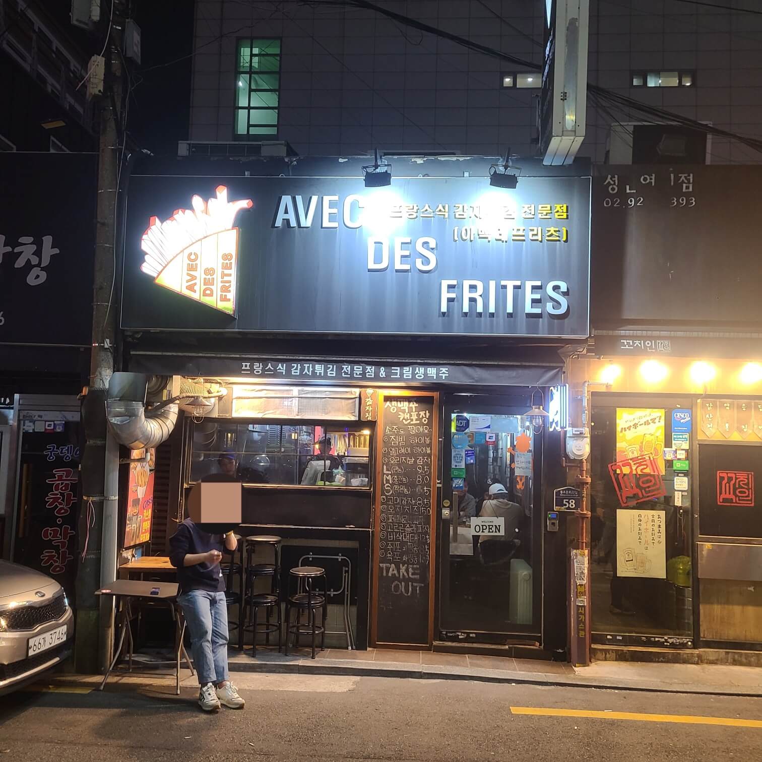 아벡 데 프리츠 성신여대점입니다. 아벡데프리츠는 봉구비어 용구비어 같은 감자튀김 맥주 집입니다. Avec des frites는 불어로 감자튀김과 함께라는 뜻으로, 프랑스식 오리지널 감자튀김 전문점을 의미한다고 합니다.