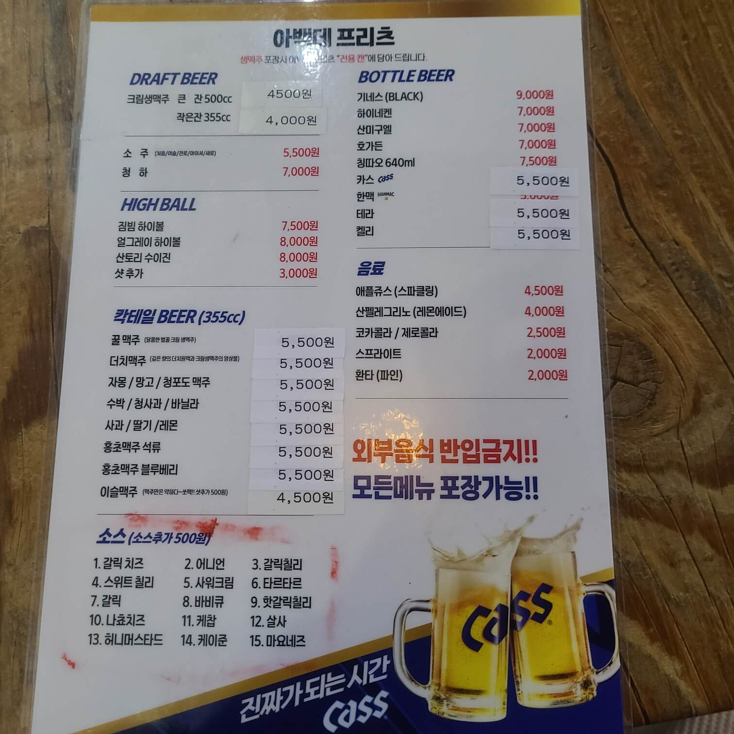 아벡 데 프리츠 메뉴판입니다. 저희는 2차라서 간단하게 감자튀김 먹으러 왔습니다.