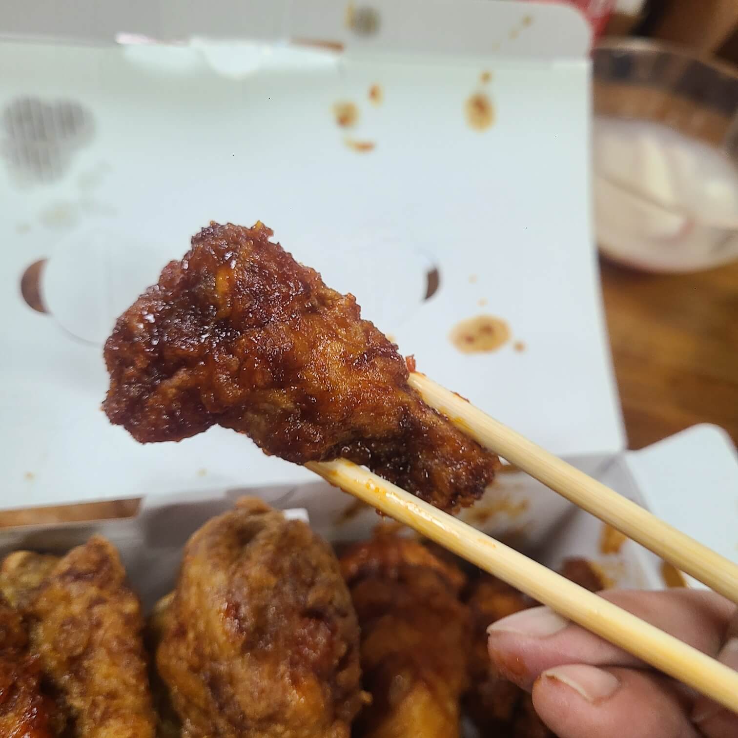 다음으로 매운 양념이 입혀진 걸 먹어봤습니다. 눈에 보이는 색깔부터 빨간색이 확연하게 보였습니다. 비주얼부터 매운맛이라는 게 느껴졌습니다. 먹어보니깐 비주얼처럼 매운맛이 확 느껴졌습니다. 막 엄청 맵다 까지는 아니었지만 약간의 입술과 입안이 화끈해질 정도였습니다. 너무 매운 것도 아니고 먹고 또 먹고 싶게 할 정도의 매운맛이라 개인적으로 간장보단 매운맛이 더 맛있게 느껴졌습니다. 저는 맛있었지만 매운 걸 잘 못 드시는 분들은 조금 힘들 수도 있을 것 같았습니다. 매운맛 외에 달달한 맛도 느껴지지만 생각보다 매운맛의 세기가 좀 강한 거 같긴 합니다. 매운 거 잘 드시는 분들은 매콤한 맛이라고 생각됩니다.