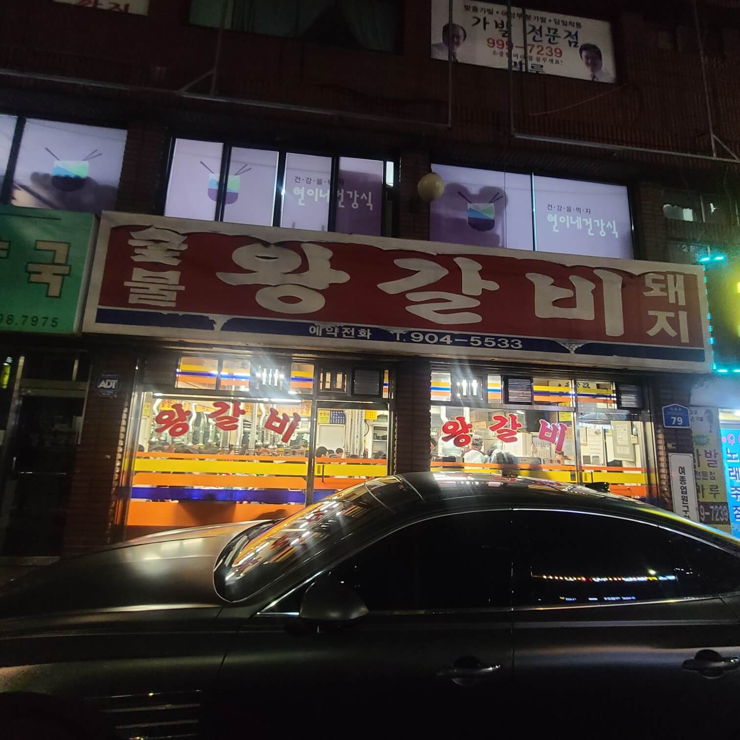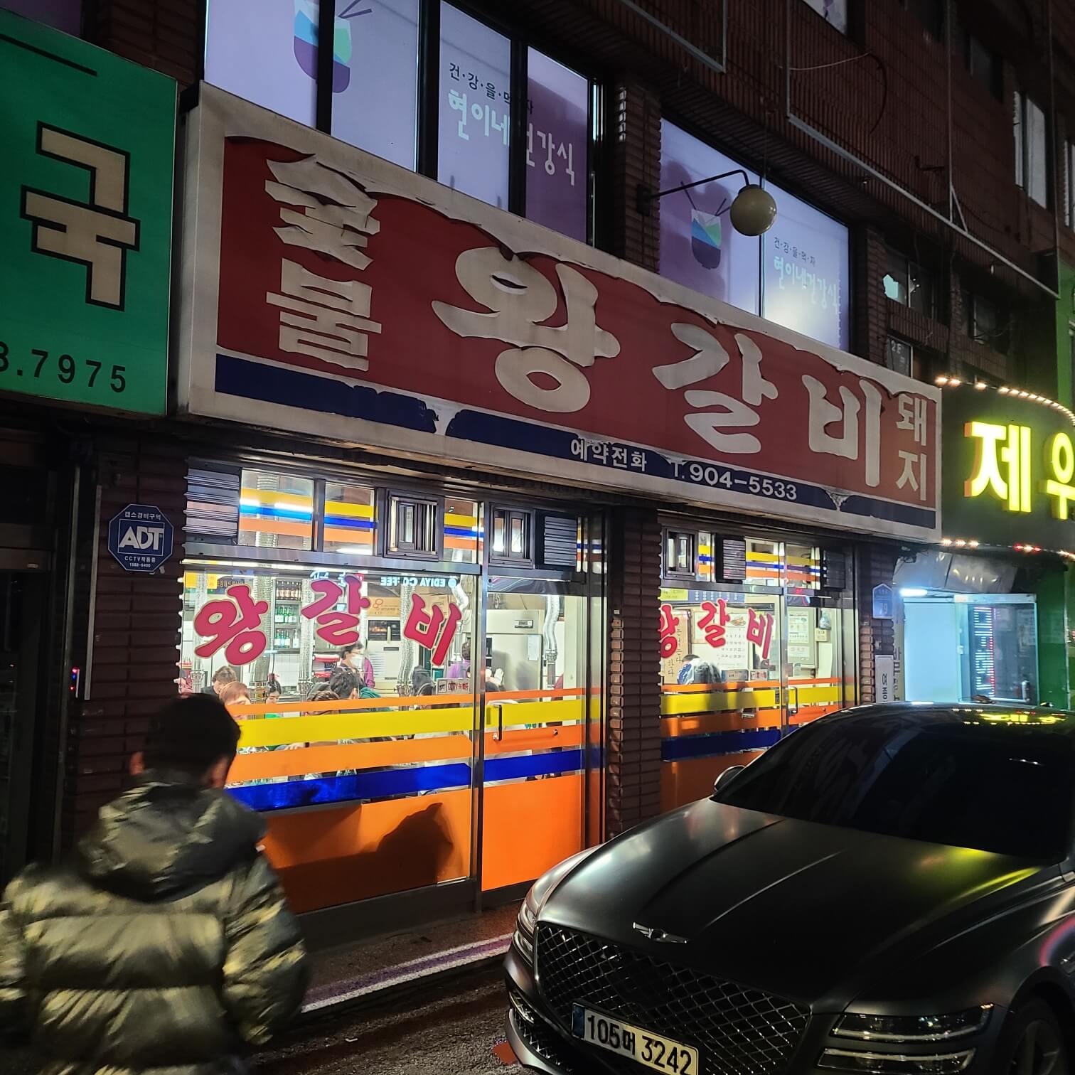수유역 맛집 숯불왕갈비 외관입니다. 강렬한 빨간색 간판과 커다란 글자, 그리고 간판 시트지가 부분 부분 떨어져 말린 게 노포 느낌이 물씬입니다. 매장 들어가기 전 외관부터 맛집이라는 생각이 듭니다. 저희 가족이 자주 가는 맛집입니다.