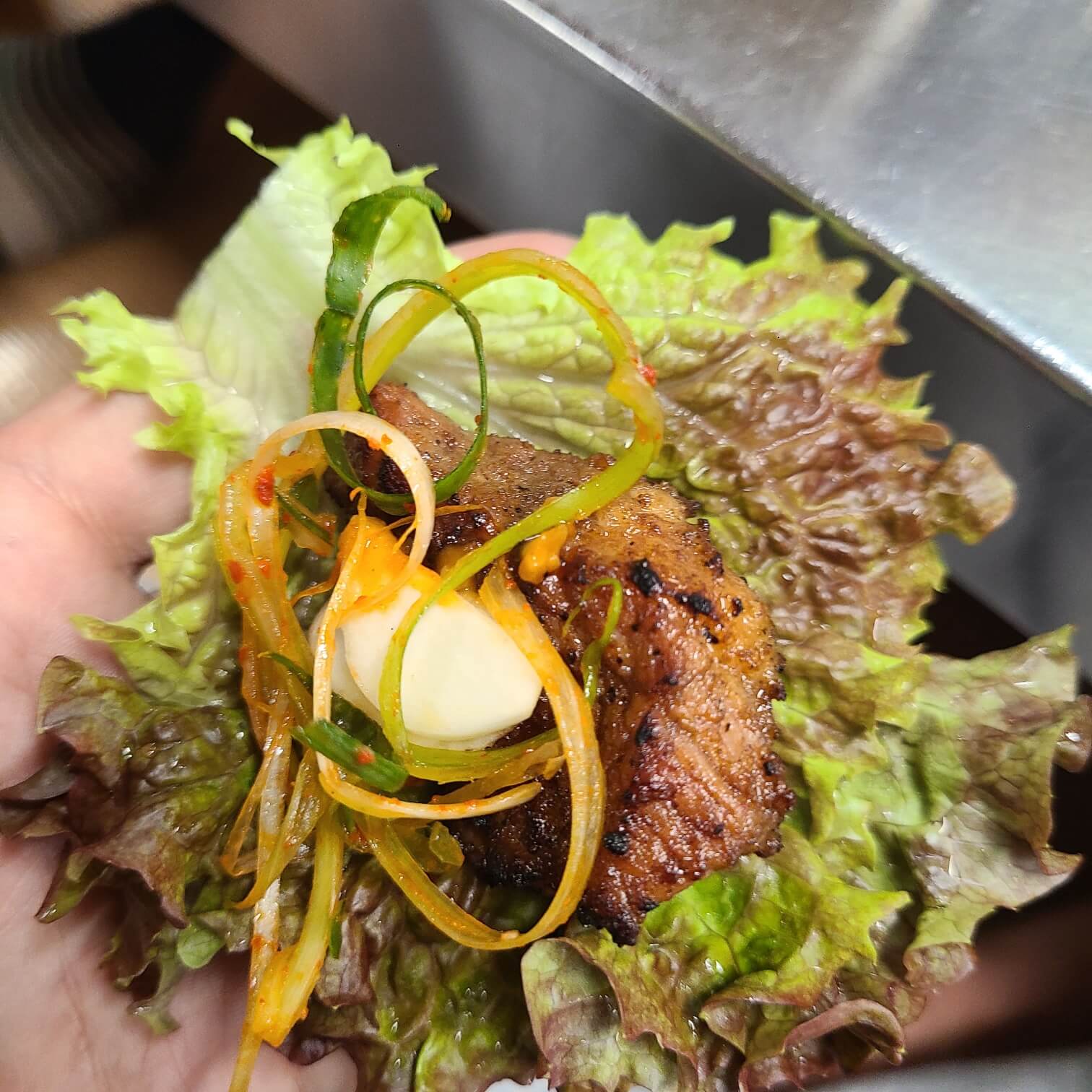 그냥 먹어도 맛있지만 쌈 싸서도 먹고 야채랑도 달달한 고기가 잘 어울려서 야채도 많이 먹었습니다.