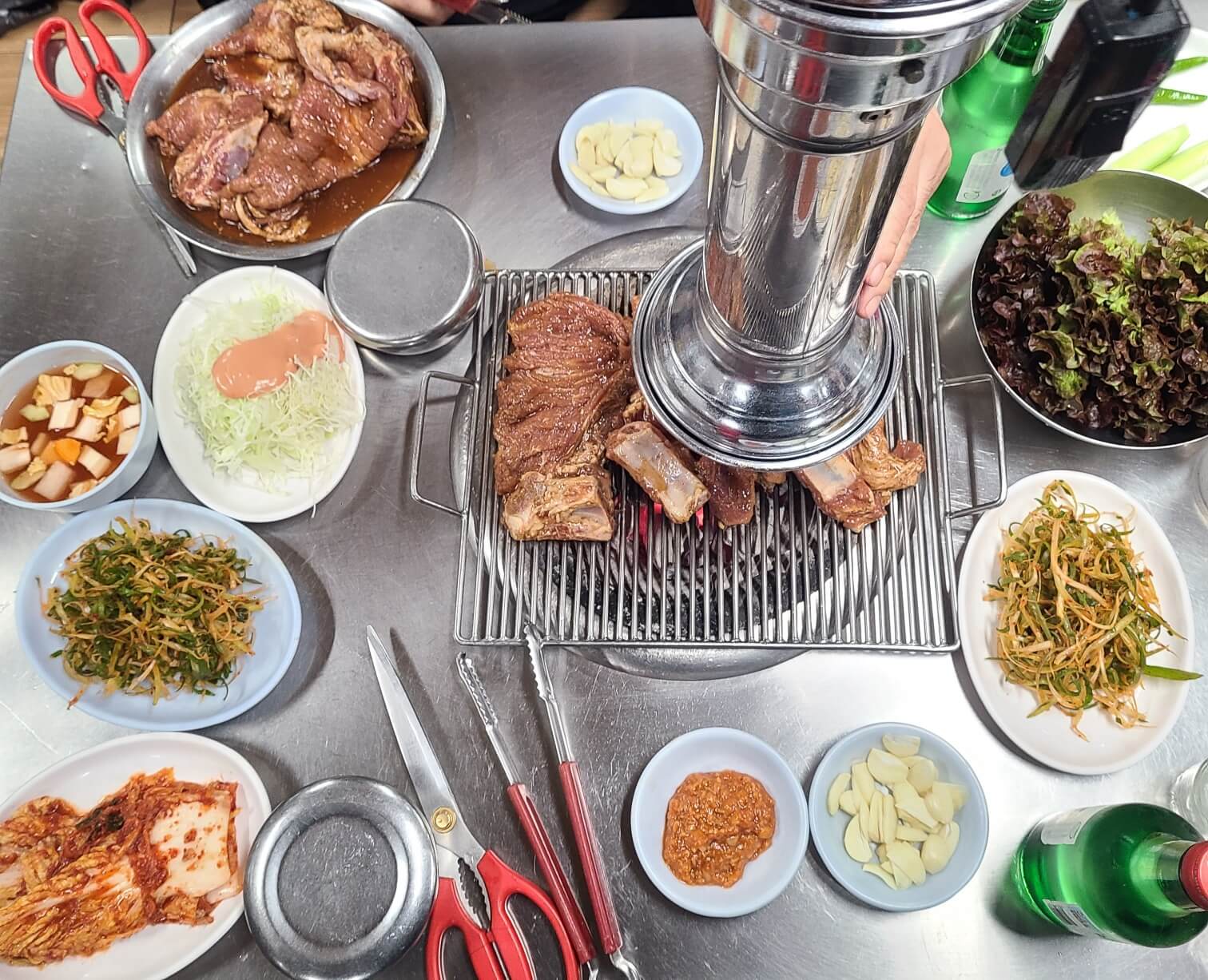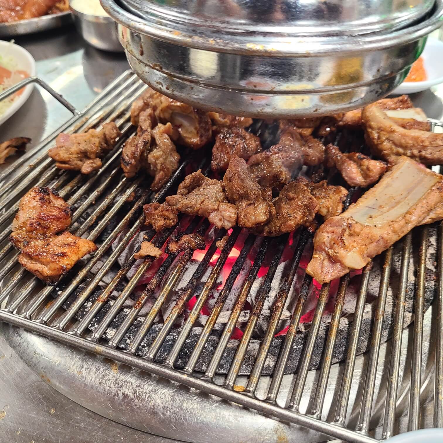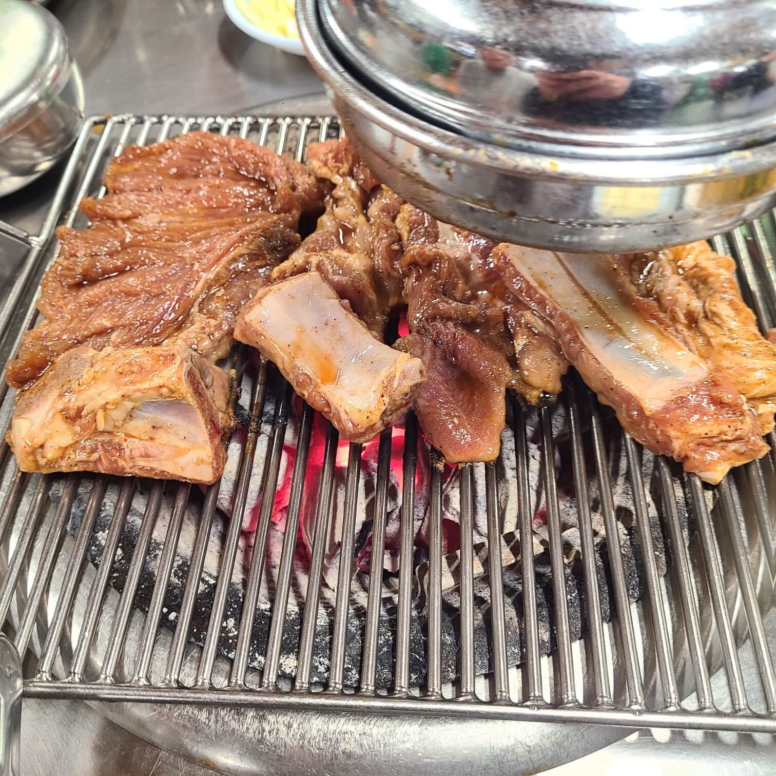 숯불 위에 달궈진 불판 위에 돼지갈비를 올려줬습니다. 강한 숯불에 달달한 양념이 닿으니 벌써 맛있는 느낌이 듭니다.