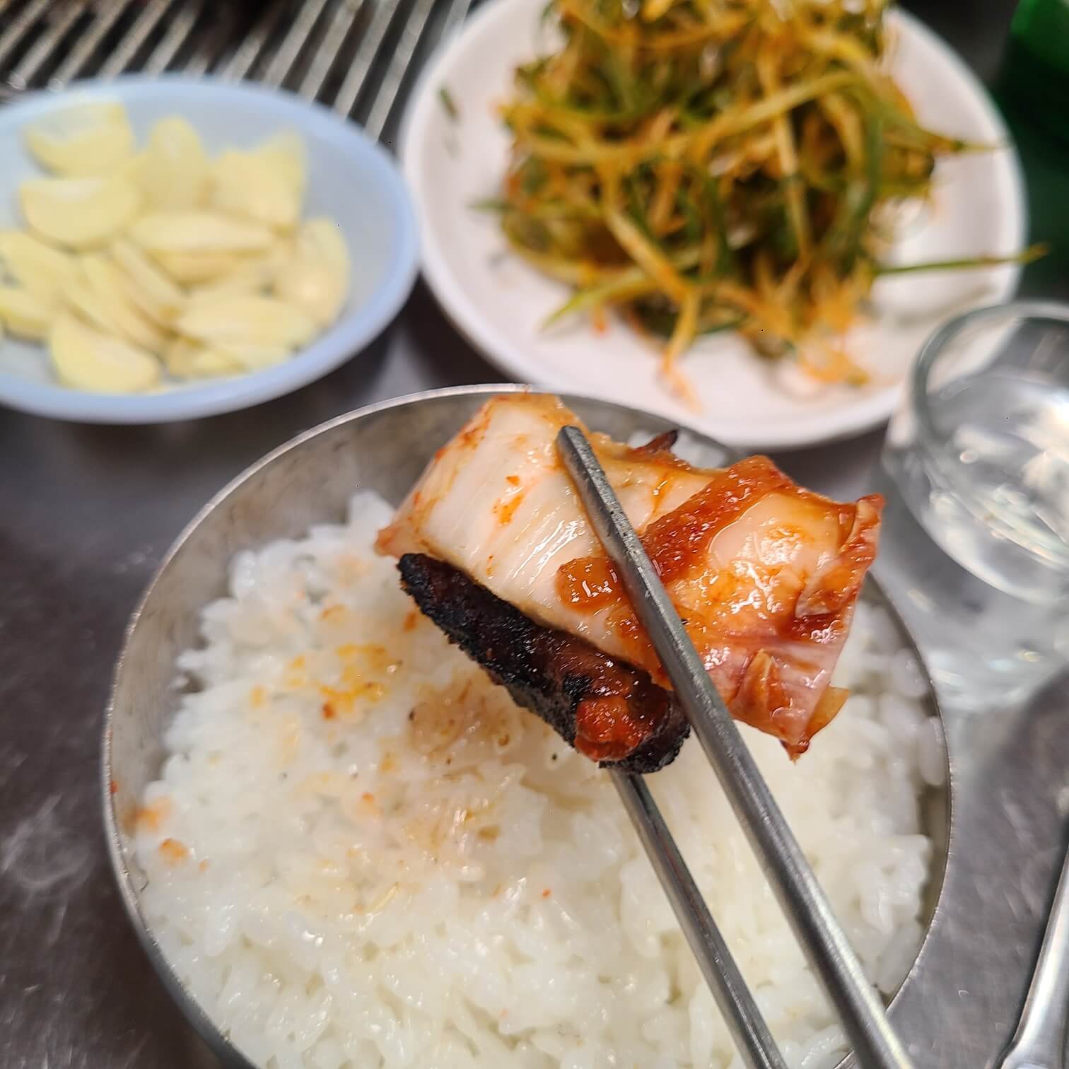 살짝 시큼한 배추김치와 달달한 돼지갈비의 조합도 좋았습니다. 돼지갈비 자체가 맛있어서 어떻게 구워도 맛있었습니다.