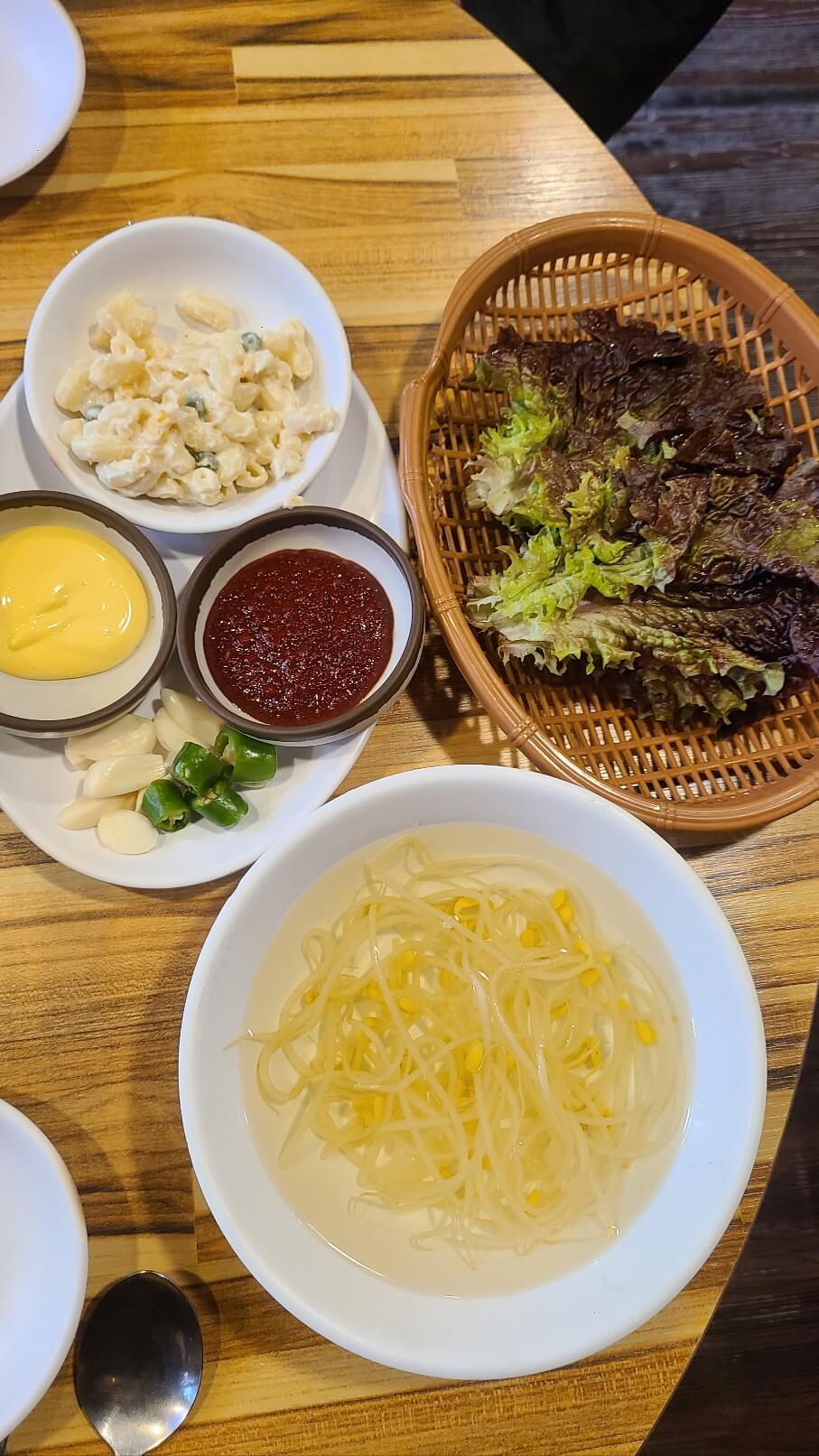 기본반찬이 세팅이 되었습니다. 보통 곱창집에 가면 나오는 그런 반찬입니다. 맑은 콩나물국, 소스와 쌈 싸 먹을 마늘과, 고추, 그리고 마카로니 샐러드가 나왔습니다. 마카로니샐러드가 제 입맛에는 너무 맛있었고 곱창하고도 잘 어울려서 곱창과 같이 먹으면 좀 더 다채로운 맛이 났습니다.
