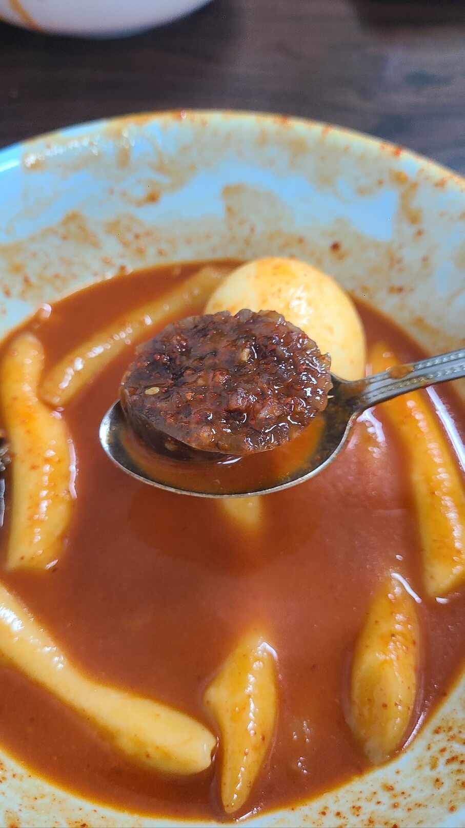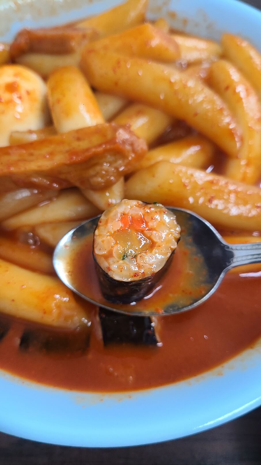 떡볶이의 정식이 나왔는데 꼬마김밥 야끼만두랑 못난이 삶은 달걀이 담긴 국물 떡볶이에 담겨 나옵니다. 김밥과 야끼만두는 맛있는 국물이 흡수되어 부드럽고 고소합니다. 풍미 나는 쫄깃한 밀떡과 구수한 국물 역시 맛이 좋았고 밀떡의 특유의 밀가루떡의 냄새가 안 나서 좋았습니다. 국물은 수저로 자꾸 떠먹게 되는 감칠맛 있고 중독성이 있는 맛이었습니다. 김밥과 달걀도 들어 있으니 한 끼로도 충분하고 든든하게 먹을 수 있는 국물 떡볶이이었습니다. 국물 떡볶이 어묵도 들어가 있었지만 국물떡볶이의 양념장이 다른 튀김과 밥들이 국물에 잘 스며들어서 평범한 재료들이 국물 덕분에 맛이 더 업이 되어서 어묵은 존재감이 별로 없었습니다. 어묵 국물이 따로 있지 않은 건 약간 아쉬웠지만 국물떡볶이의 국물의 양념장 너무 맛이 있었서 그리 아쉬울 것도 없었답니다.