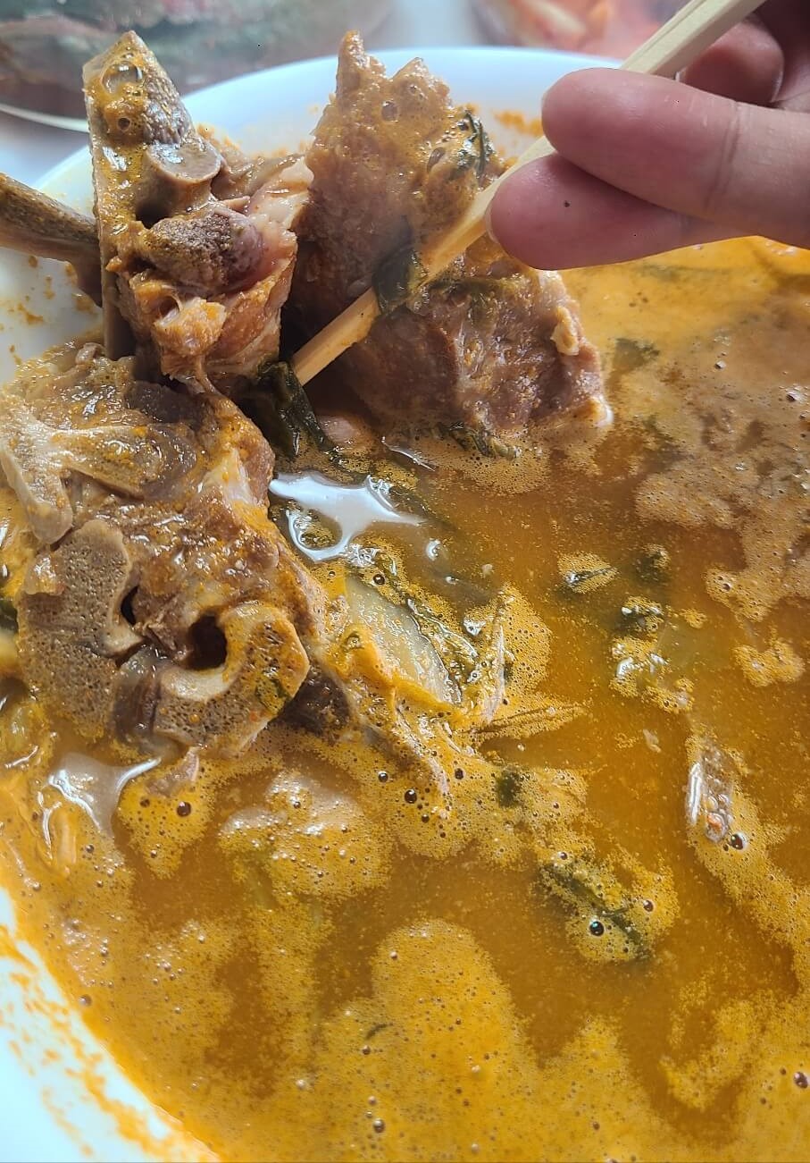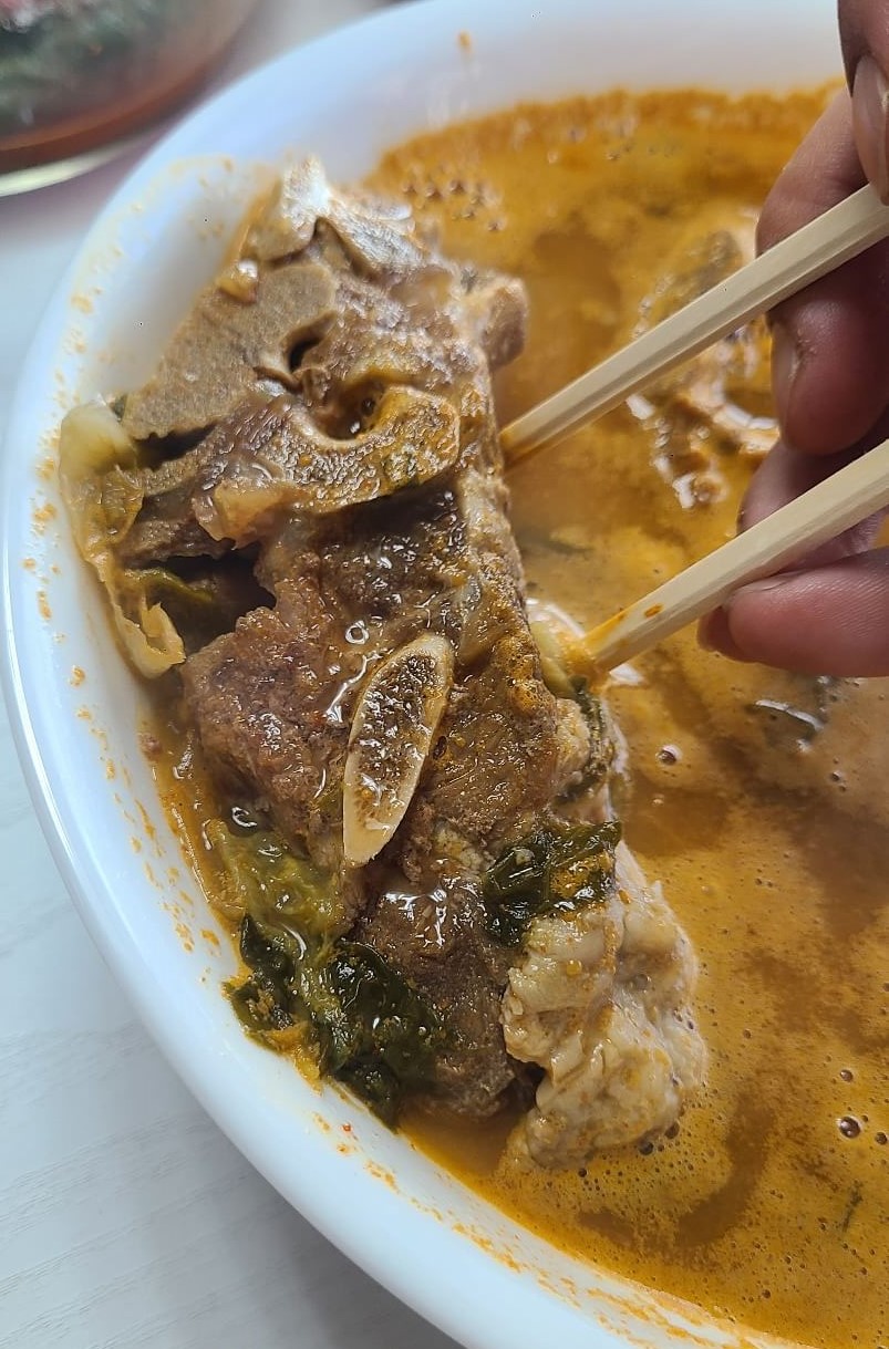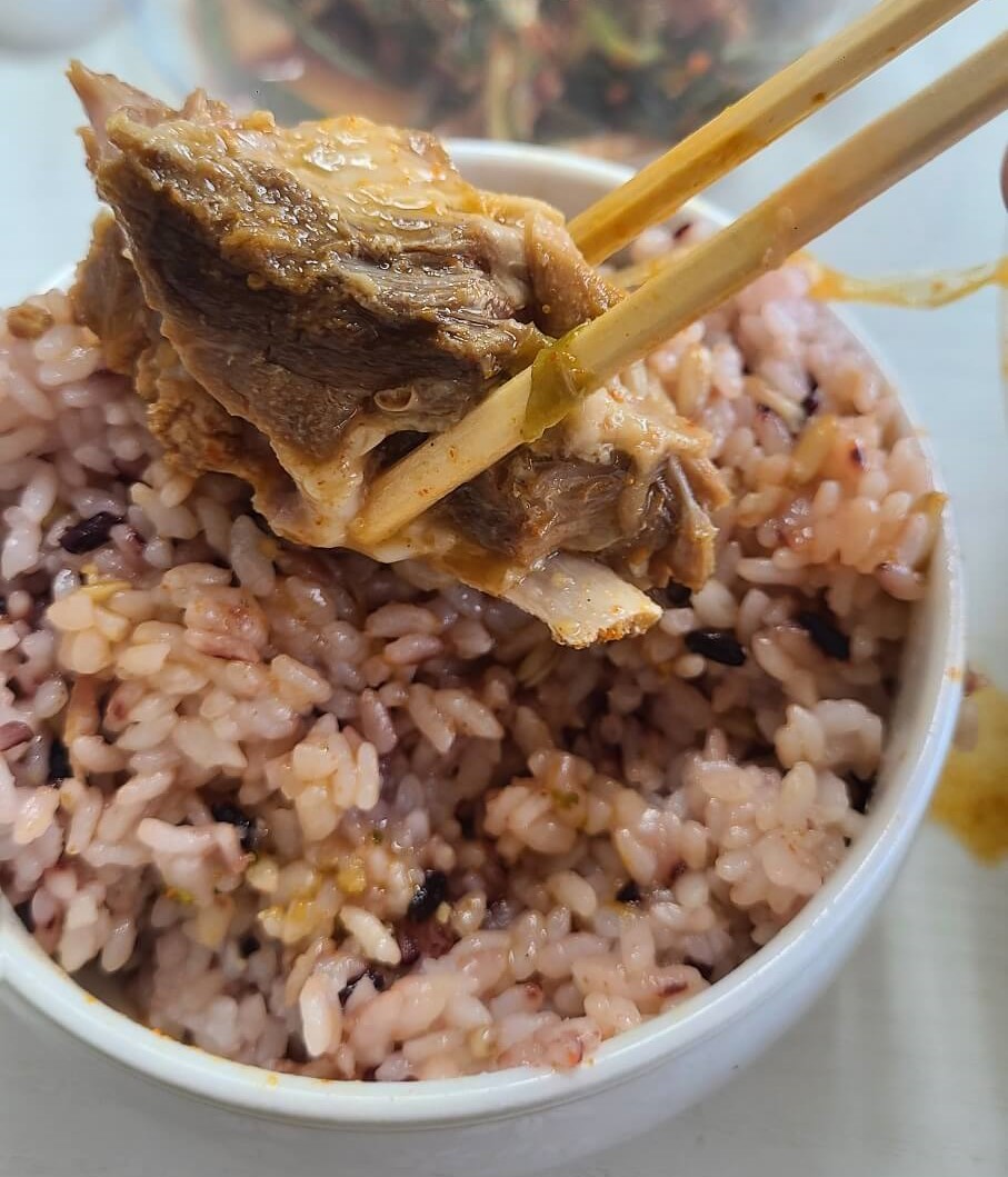 돼지목뼈가 등뼈에 비해 식감이 더 부드럽다고 하는데 정말로 고기가 부드러우니 젓가락으로 살코기를 발라내 밥이랑 같이 먹으니 정말 잘 어울렸고 돼지목뼈인데도 고기에서 돼지비린맛이 안 났습니다. 건더기도 양이 많아서 만족스러웠습니다. 성인 남자 기준으로 봐도 혼자 먹기에는 무리일정도의 양이었습니다.