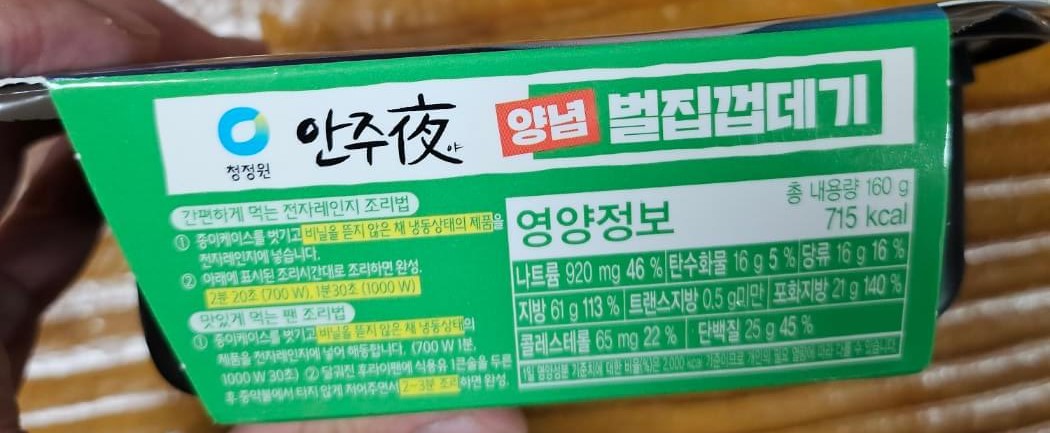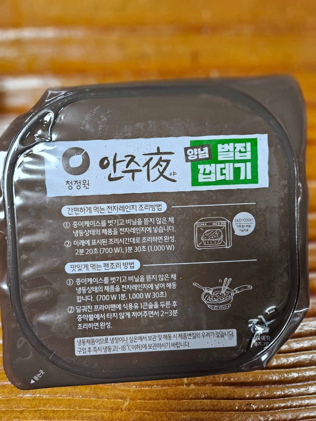 청정원 안주야 양념 벌집껍데기는 냉동제품이다 (주문한 날짜 2024.04.06일) 보니 유통기한도 2024.10.25일로 여유 있게 넉넉한 편입니다. 종이 패키지를 뜯으면 비닐로 깔끔하게 패킹되어 있습니다. 비닐과 종이 패키지 옆면에 영양정보와 함께 조리방법이 자세하게 적혀있습니다. 전자레인지와 팬 조리방법 두 가지인데 저는 여행이나 간단하게 한잔할 때 전자레인지를 이용하는 방법을 사용했습니다. 조리법은 종이케이스를 벗기고 비닐을 뜯지 않은 채 (700W) 2분 20초, 1분 30(1,000W) 간 조리하면 끝입니다.