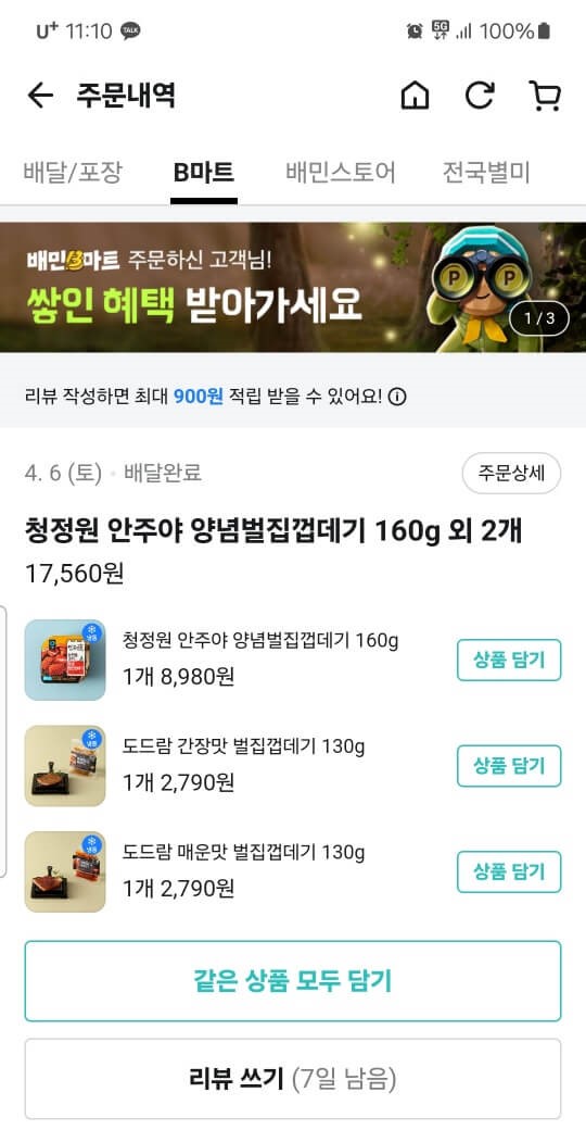 처음으로 배달의 민족 B마트를 이용해 봤습니다. B마트에 있는 껍데기 밀키트