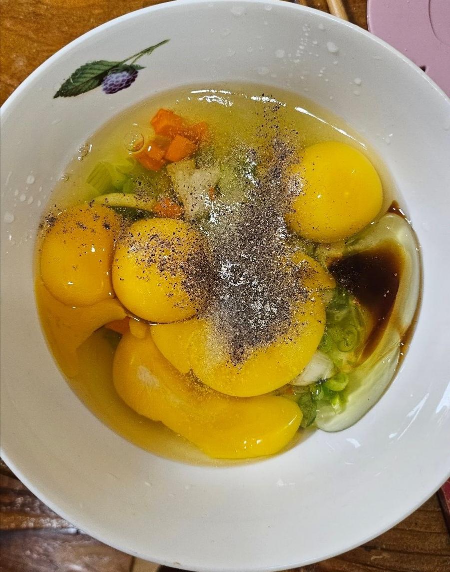 계란과 잘게 다진 당근과 대파 양파를 넣어 줍니다. 그리고 감칠맛을 위해 멸치 액젓 1 티스푼 추가하고 후추 그리고 맛소금 조금 뿌려서 간을 합니다.